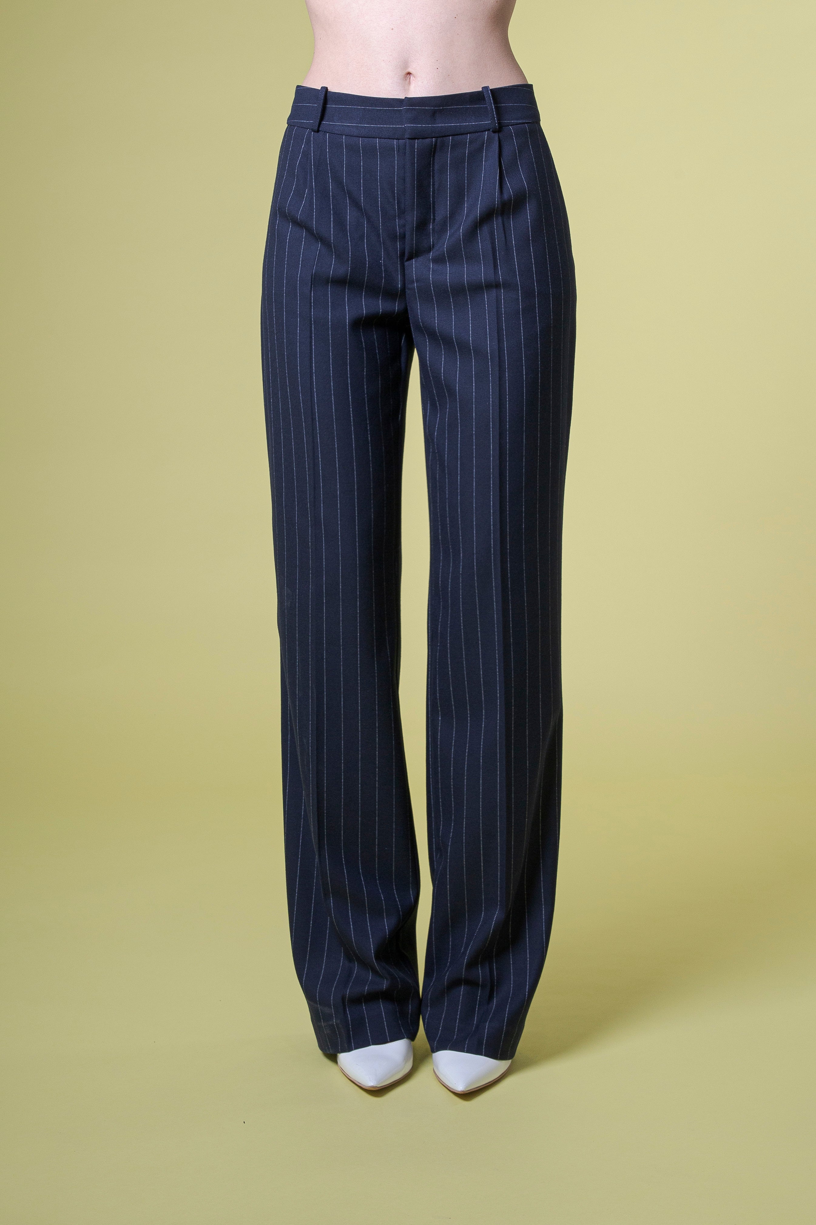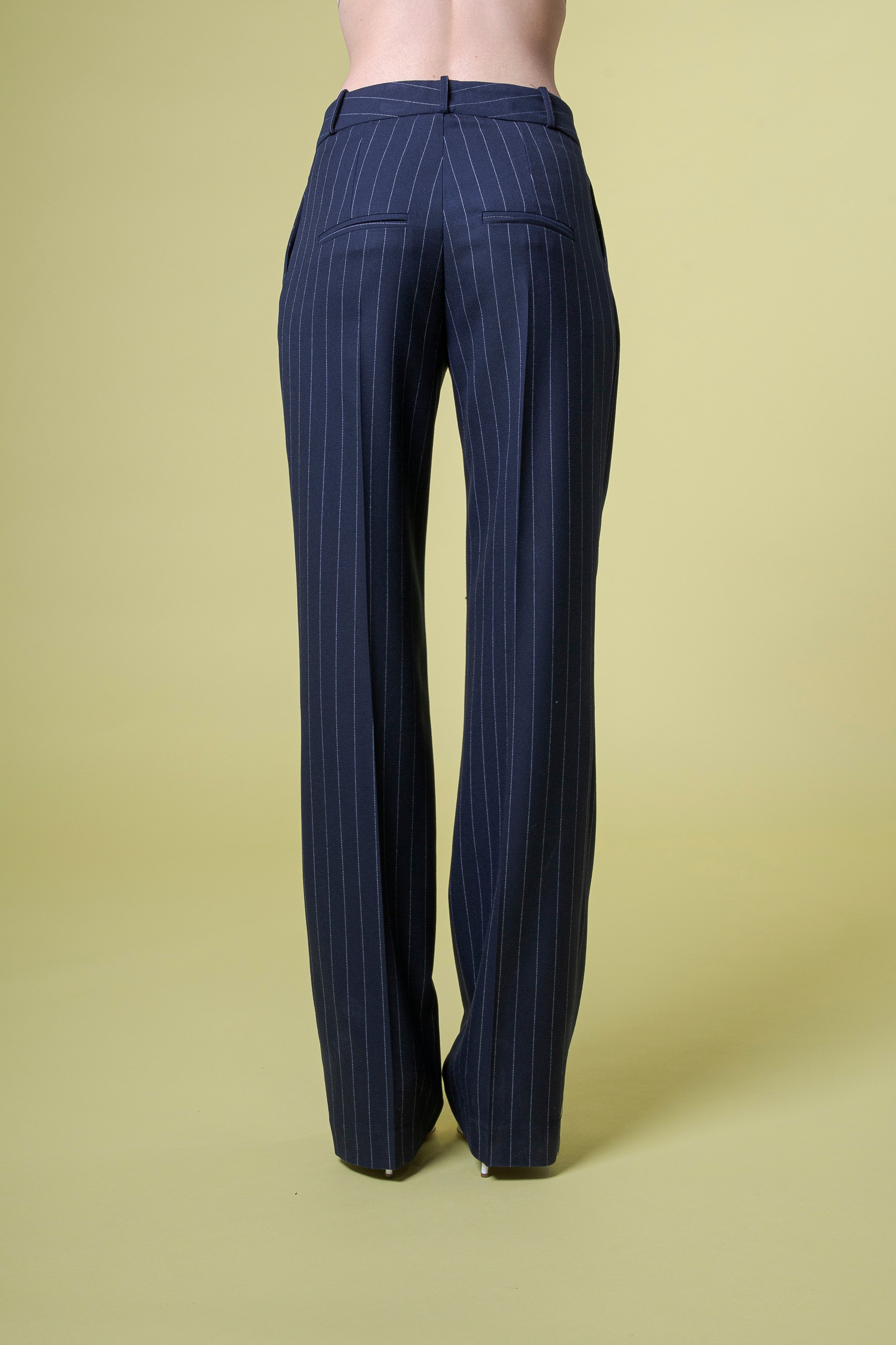 La vita è definita da pinces morbide, studiate per dare volume senza appesantire, per scolpire il punto vita e accompagnare naturalmente la linea dei fianchi. Questo dettaglio sartoriale richiama la tradizione maschile rivisitata con sensibilità femminile, rendendo il pantalone autorevole ma incredibilmente elegante.