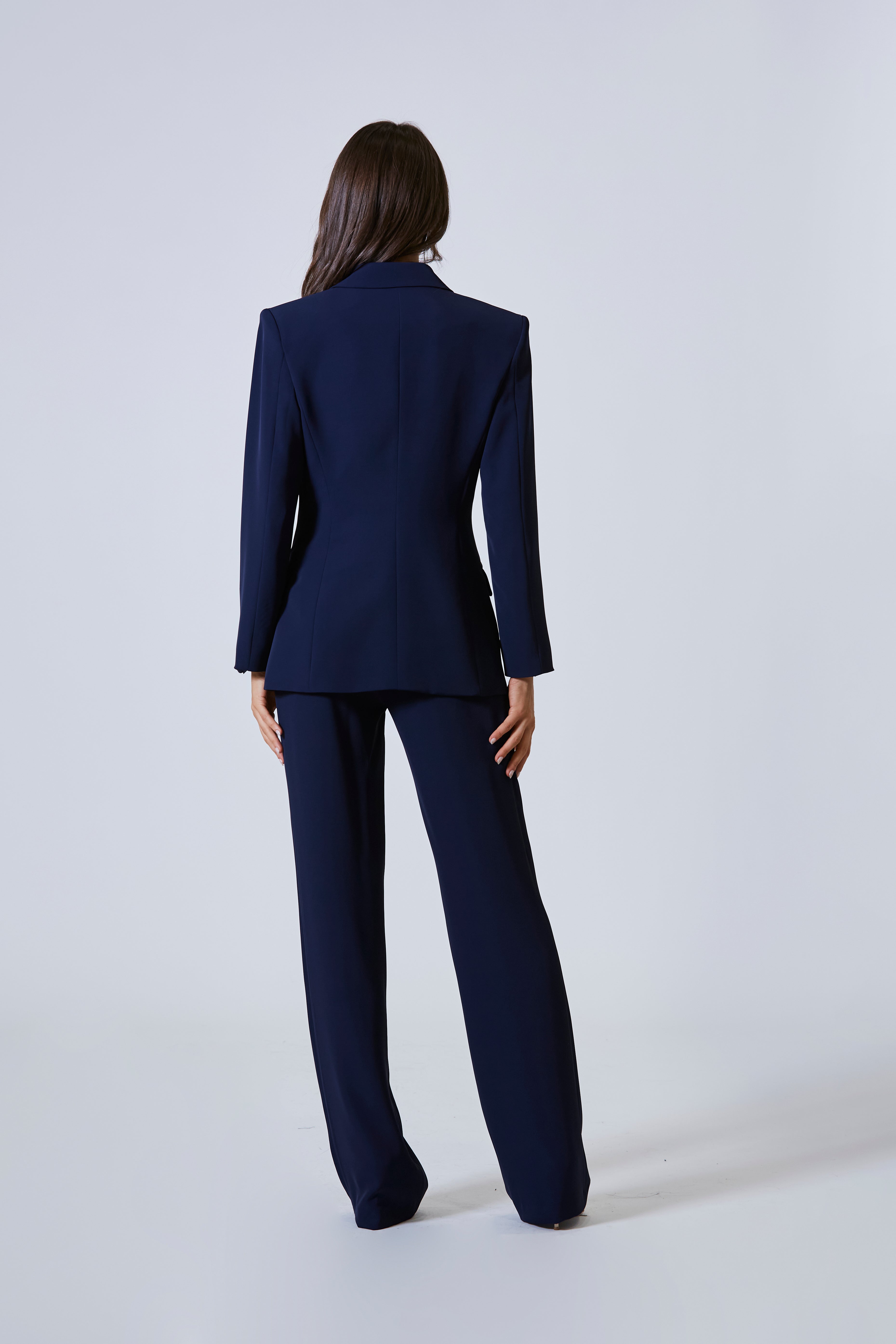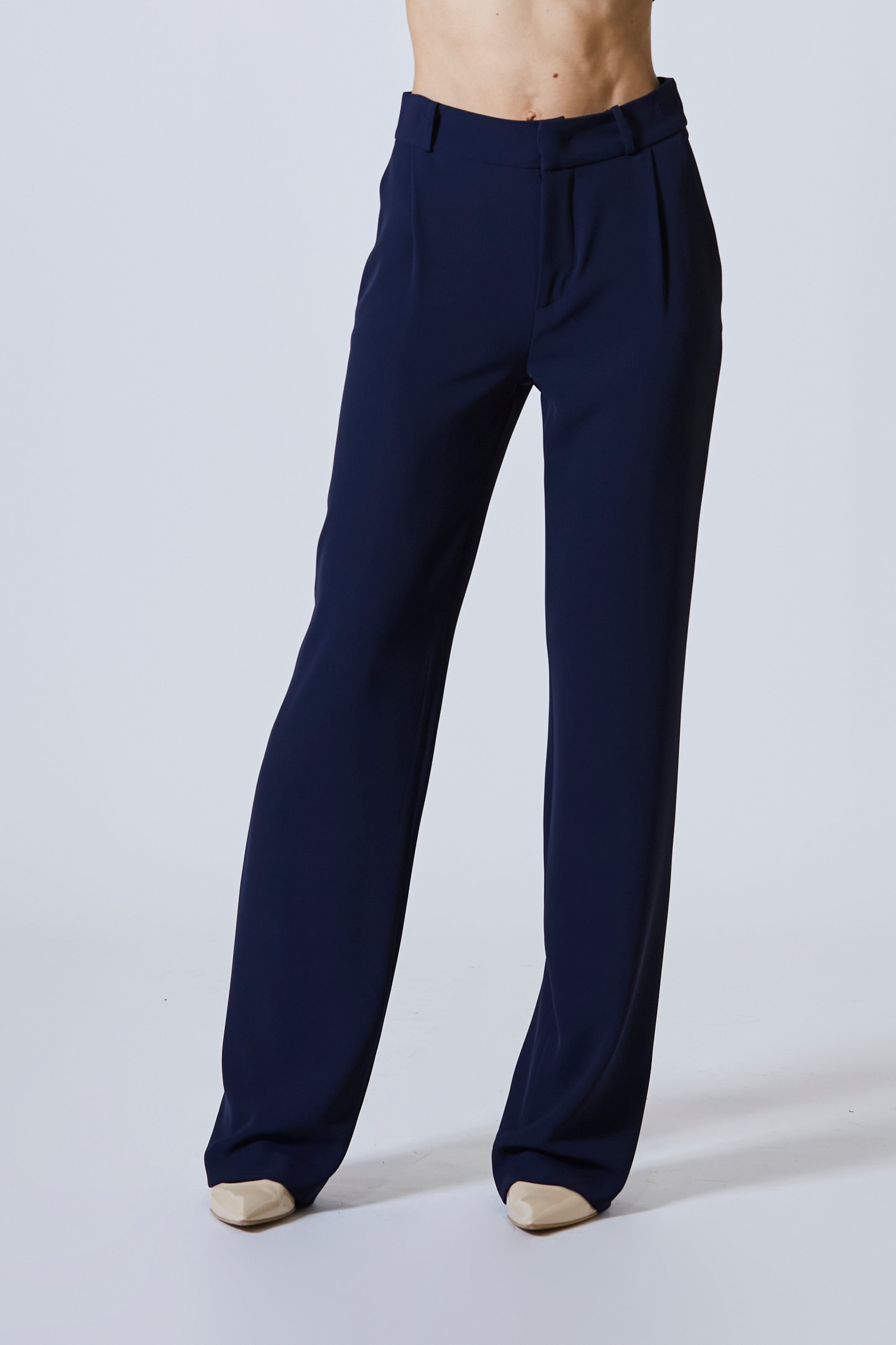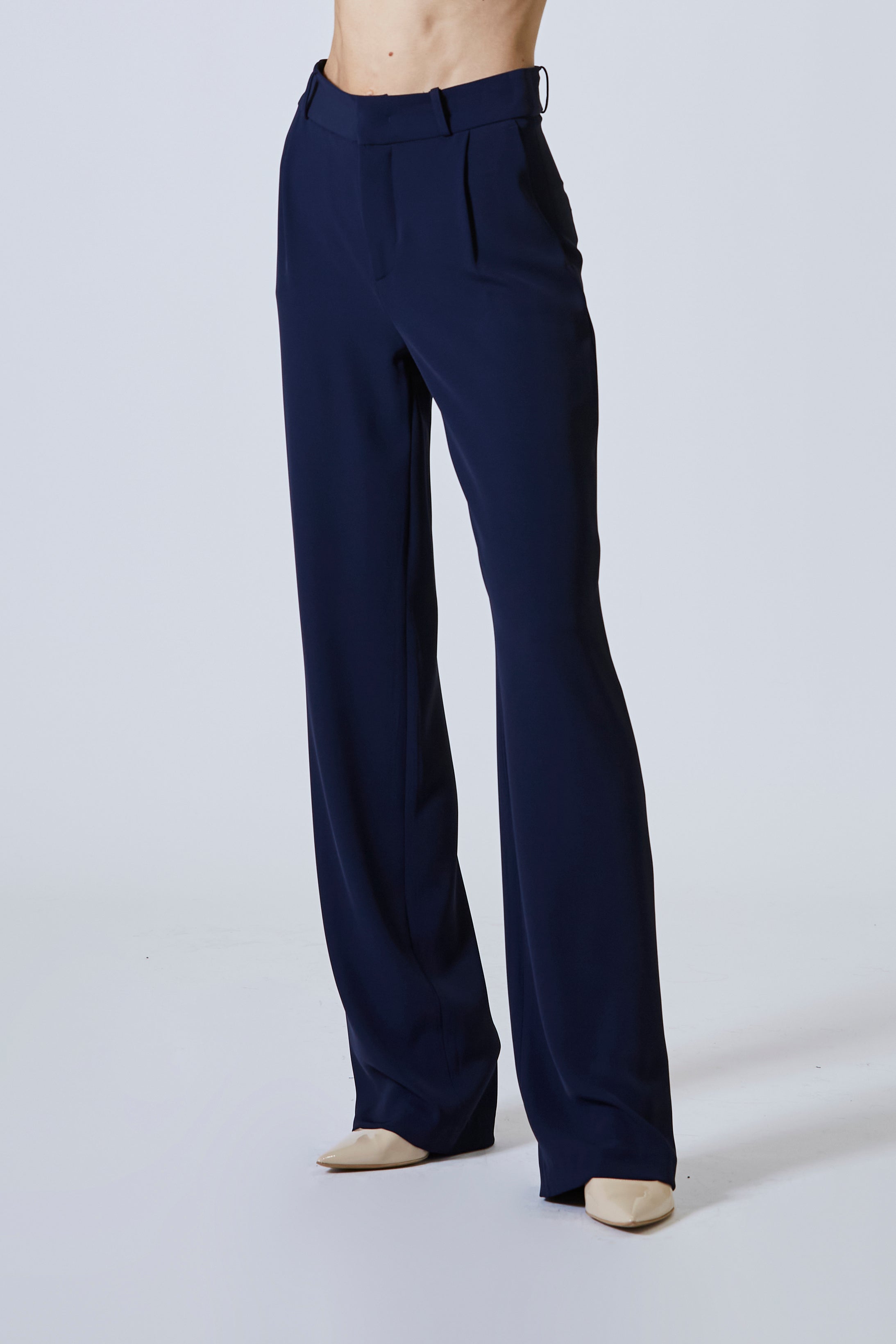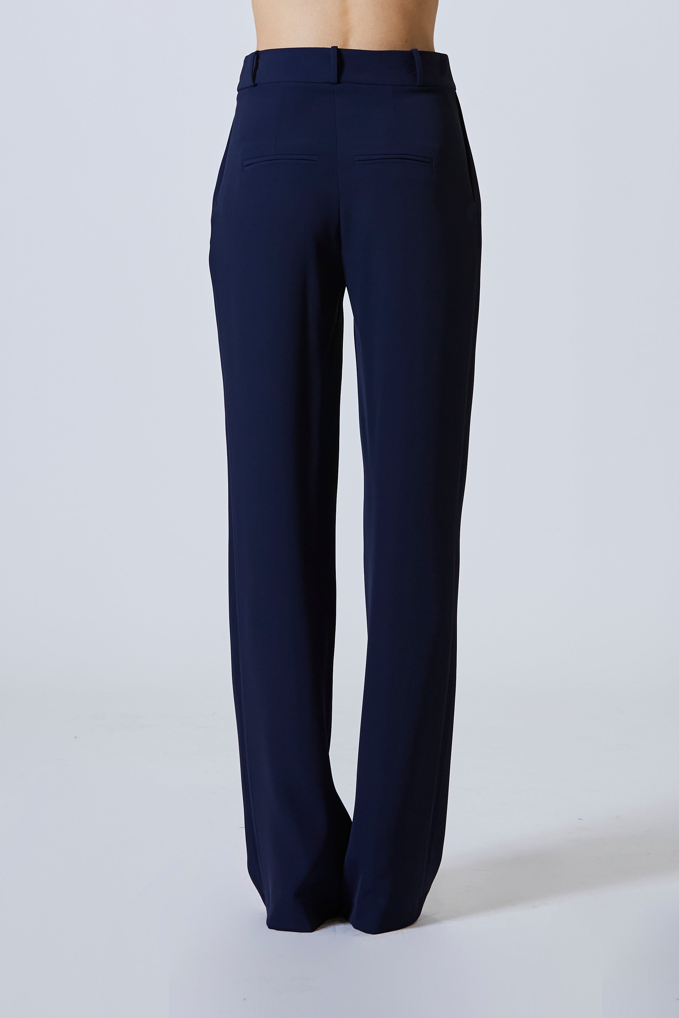 Non ci sono volumi eccessivi, né tagli rigidi. Solo equilibrio, morbidezza, precisione. La vita, definita ma mai costretta, sottolinea il punto esatto in cui il corpo comincia a raccontarsi. E da lì, il pantalone scende — con ritmo silenzioso, elegante, quasi architettonico nella sua semplicità.