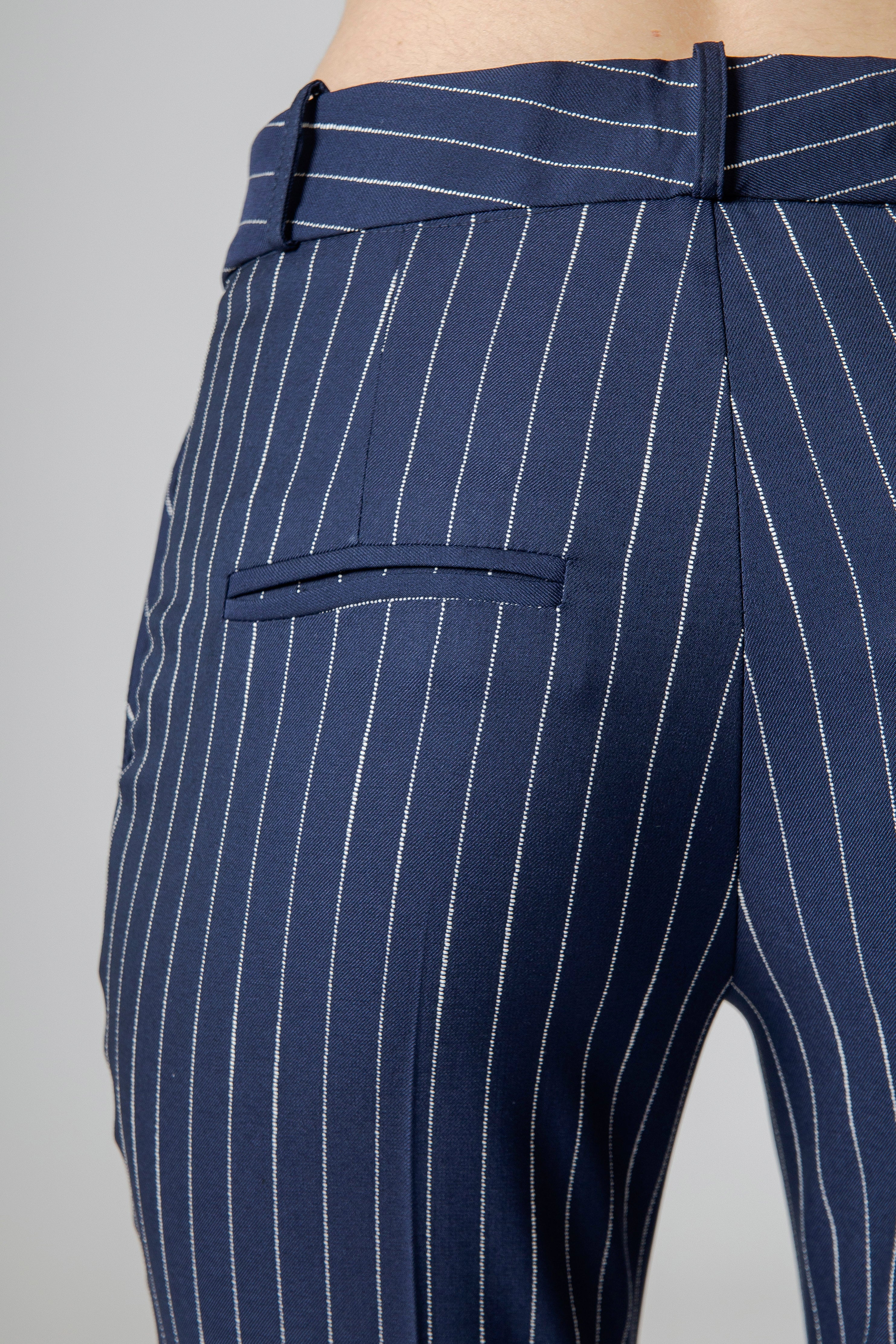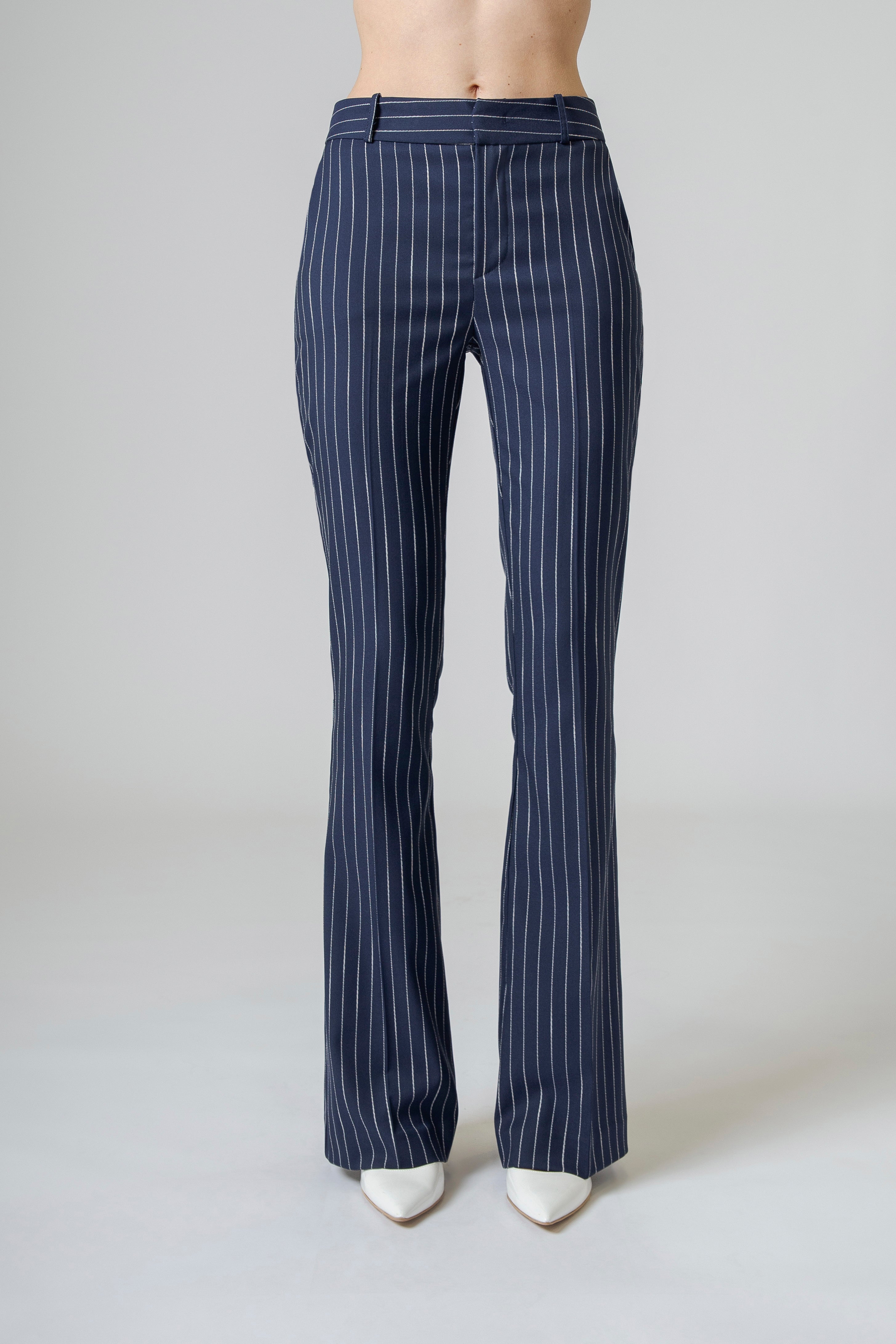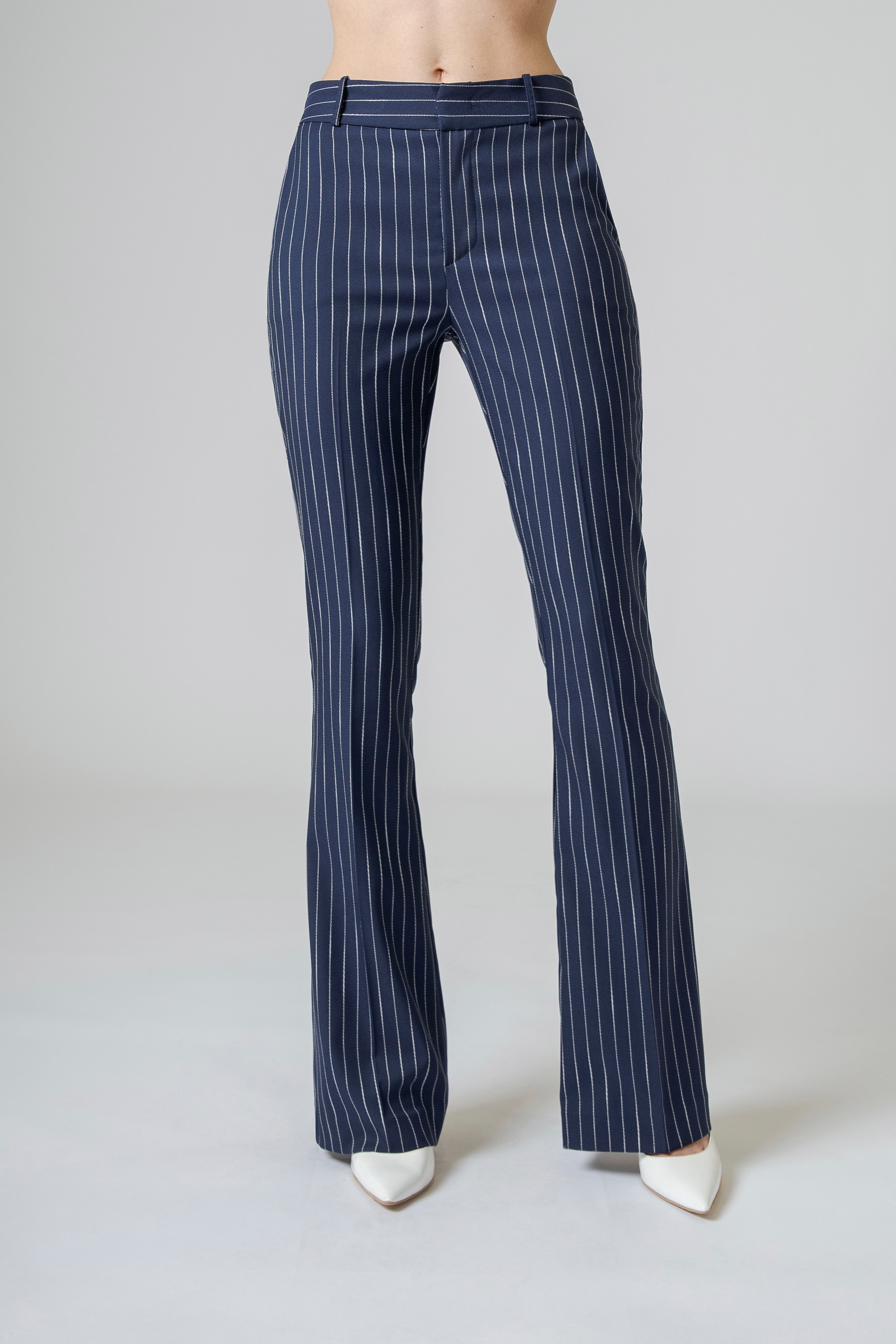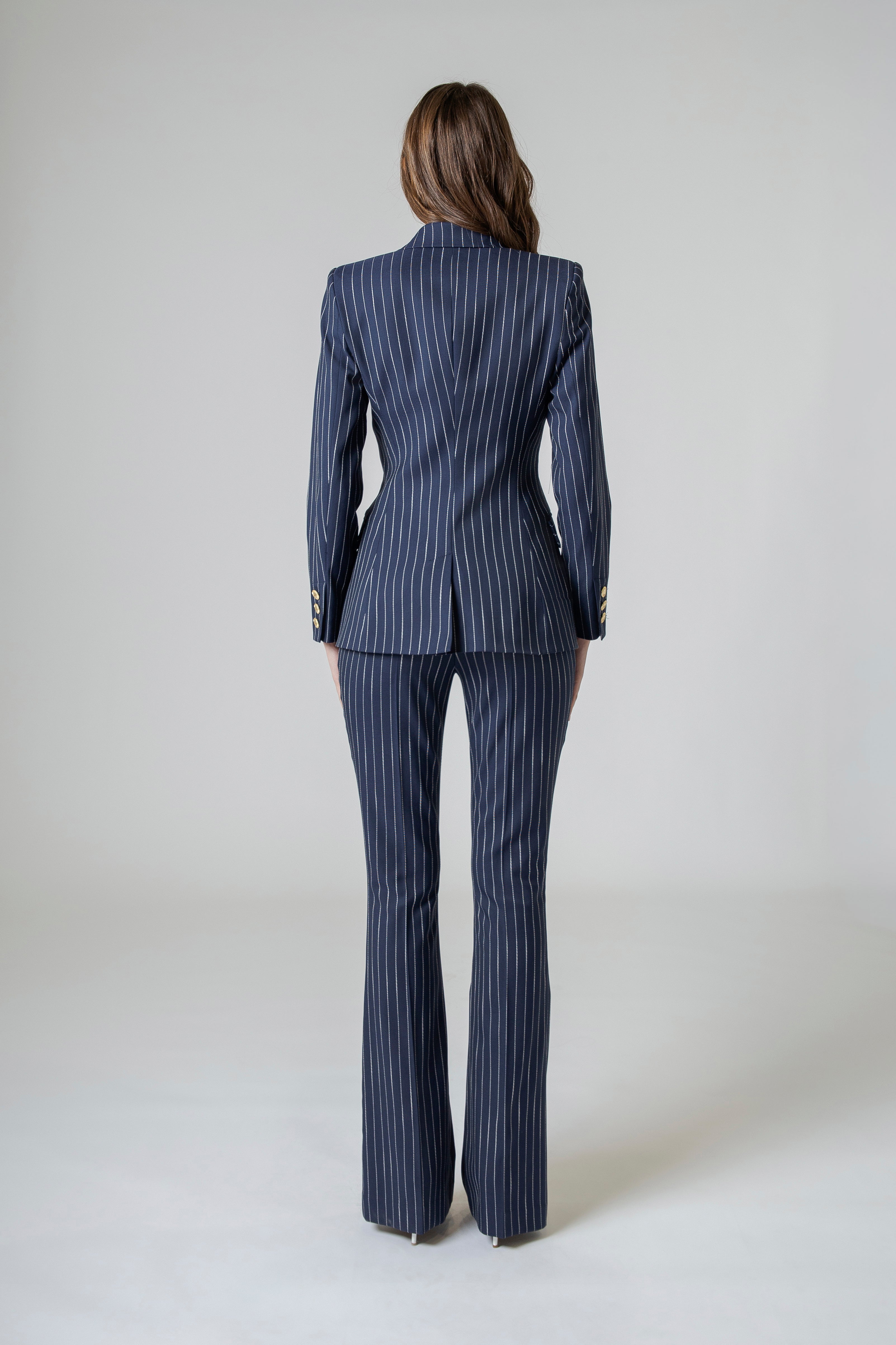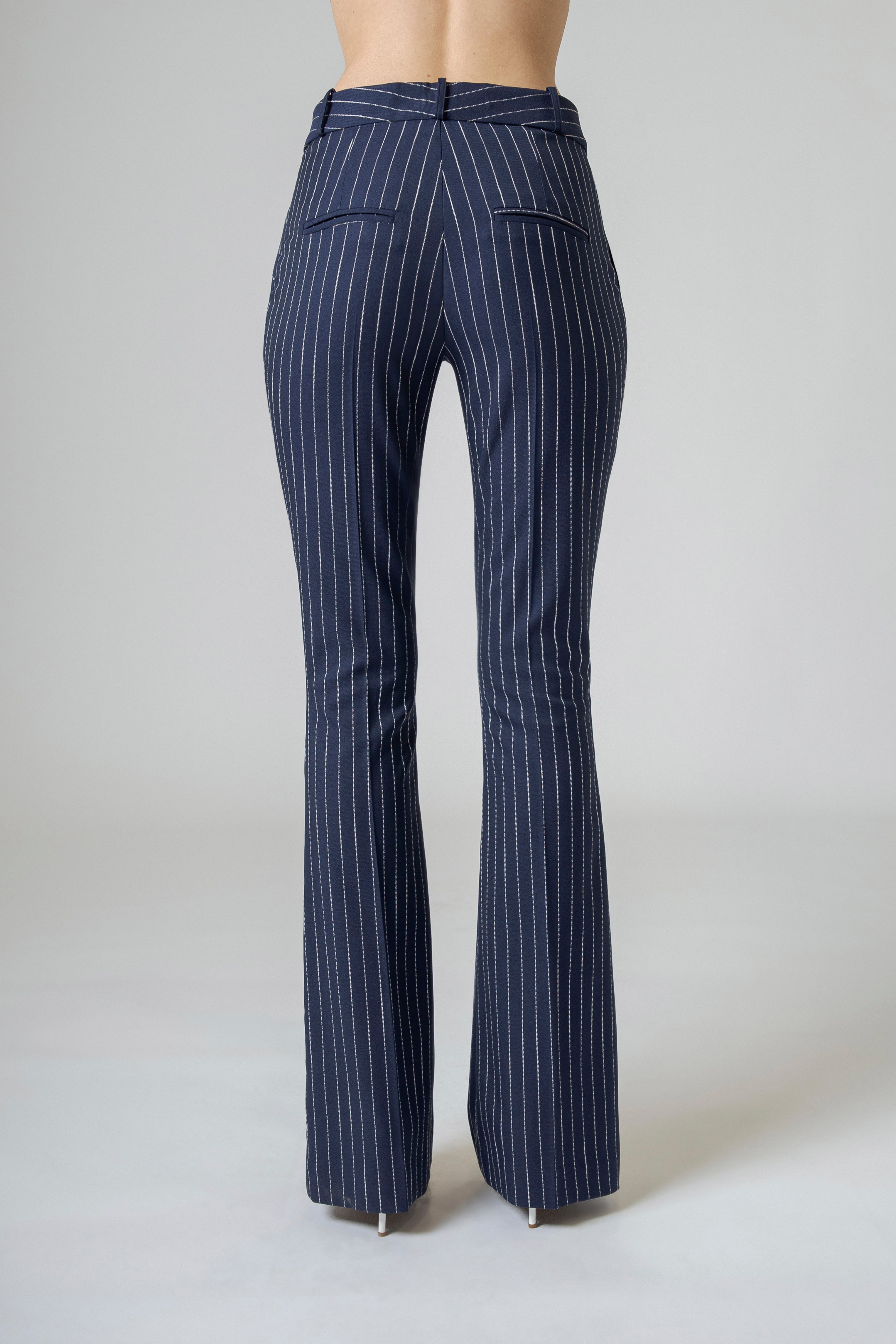 Il pantalone gessato flare Made in Italy non segue la moda: la attraversa. È un ponte tra passato e presente, tra rigore maschile e sensualità femminile, tra struttura e movimento. È stile che respira, che vive, che accompagna.