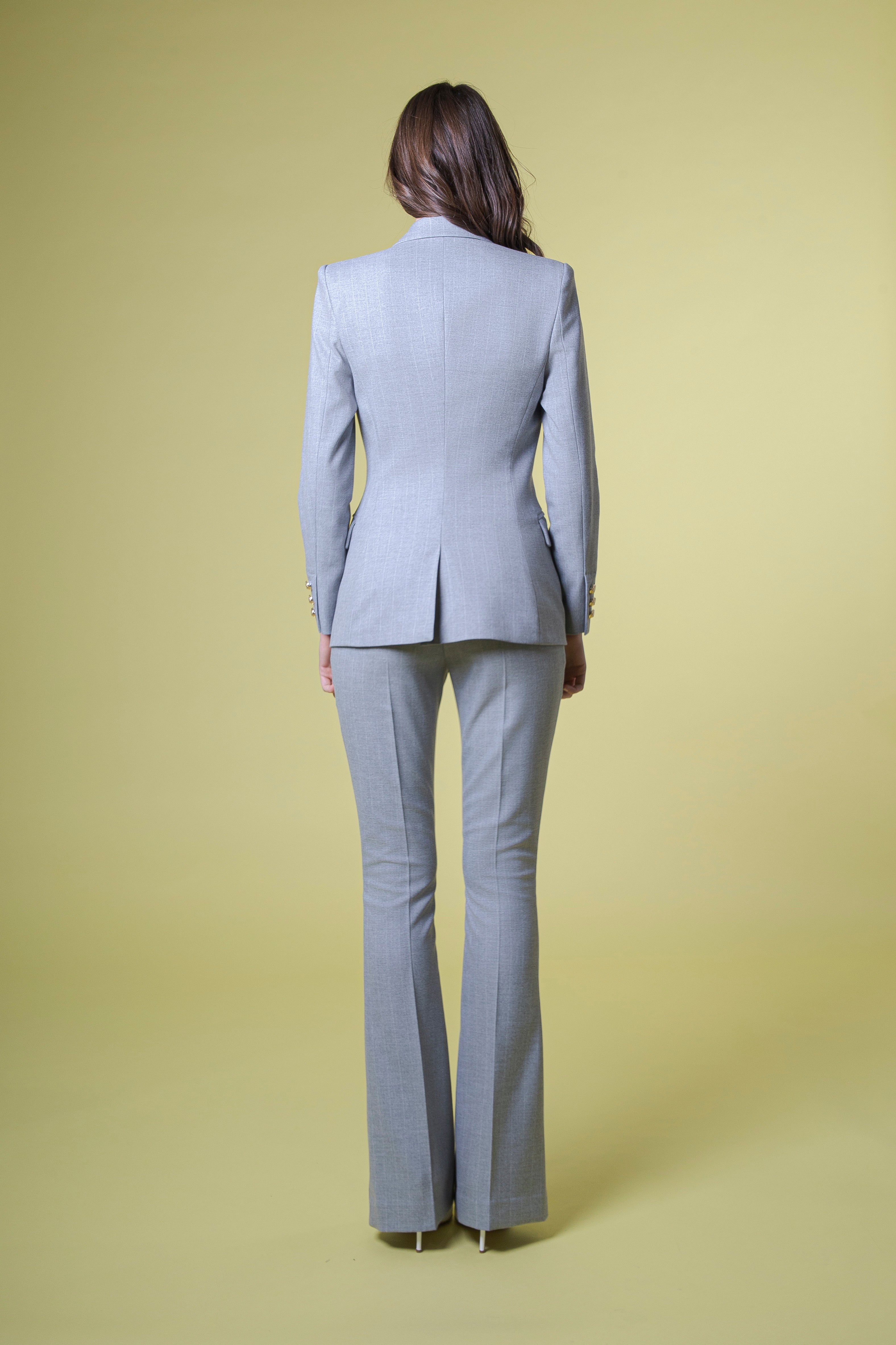 Abbinato alla giacca doppiopetto con bottoni oro, questo pantalone diventa il perfetto equilibrio tra rigore sartoriale e sensualità contemporanea. Insieme costruiscono un completo forte, deciso, pensato per una donna che ama distinguersi senza rinunciare alla raffinatezza.