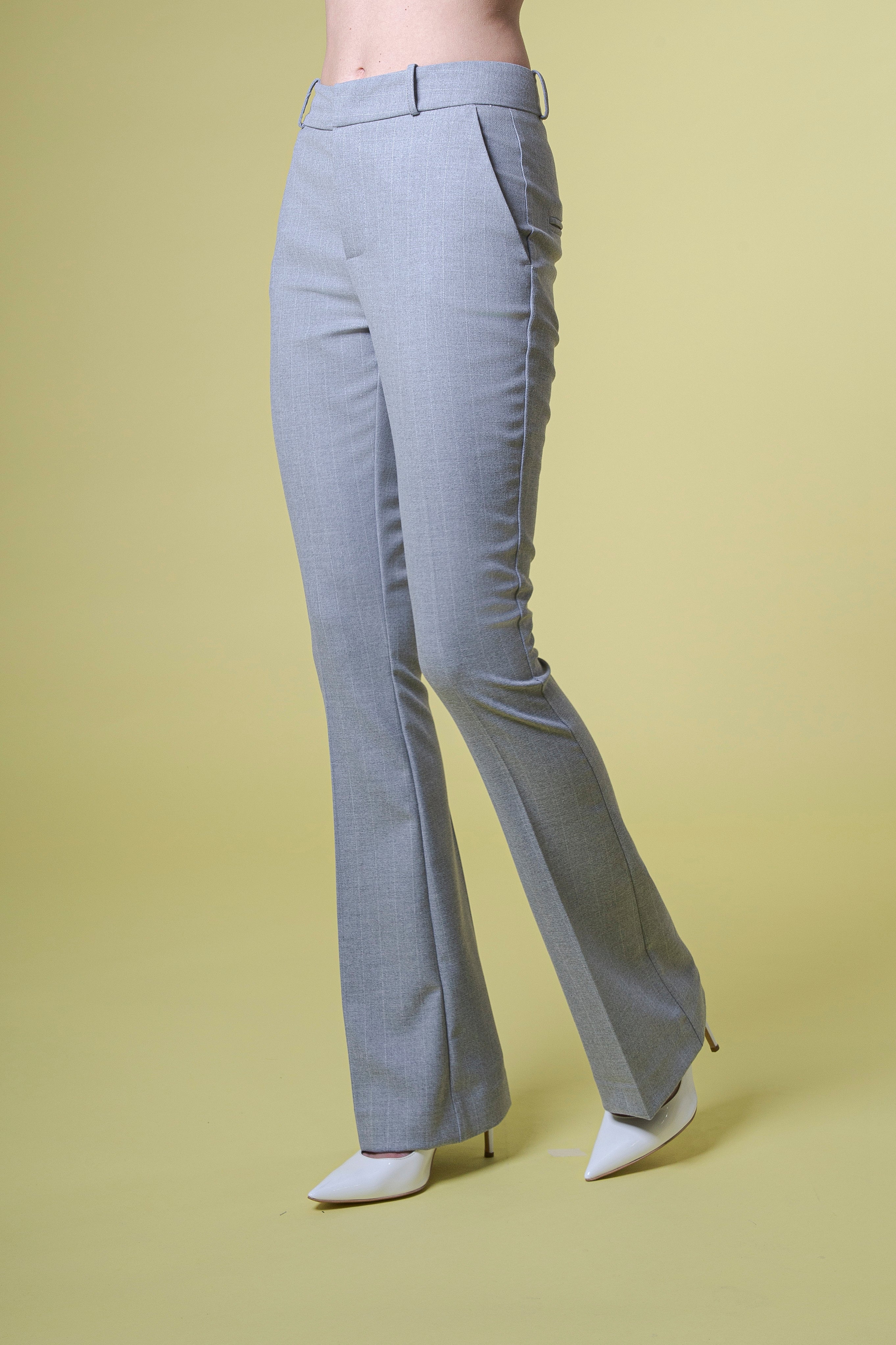 La vita alta abbraccia il punto vita con precisione sartoriale, definendo la silhouette e regalando un’eleganza d’altri tempi, reinterpretata in chiave moderna. Il pantalone scende poi fluido lungo la gamba, accarezzando le forme senza costringerle, fino ad aprirsi delicatamente nella zampetta finale, iconica e femminile, che dona slancio e una presenza scenica irresistibile.