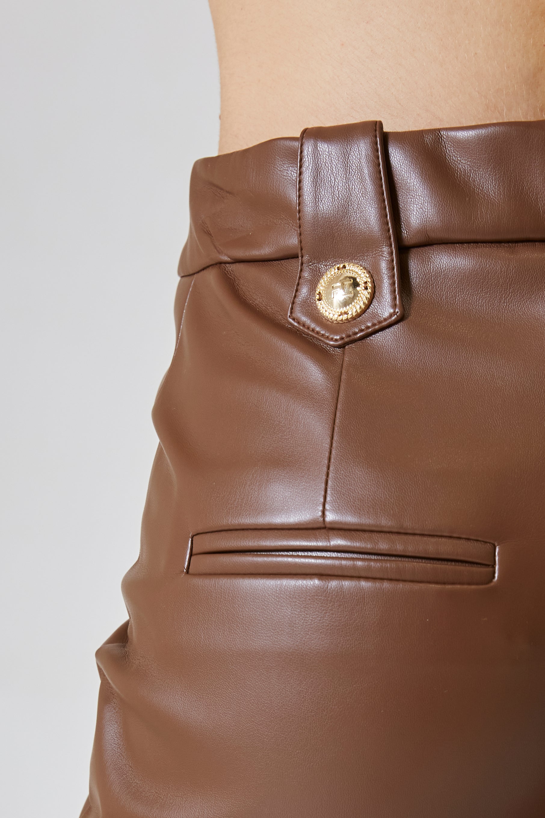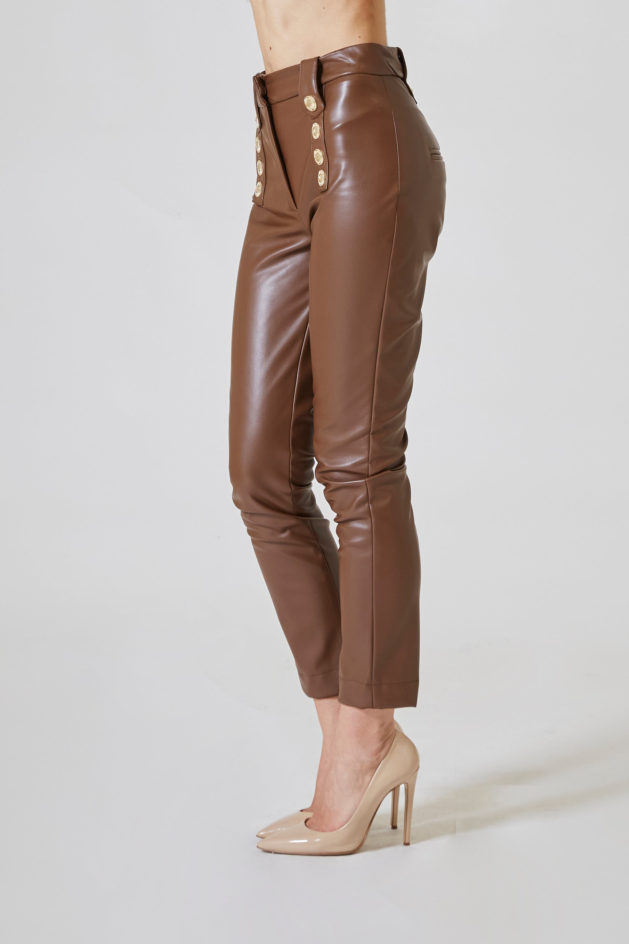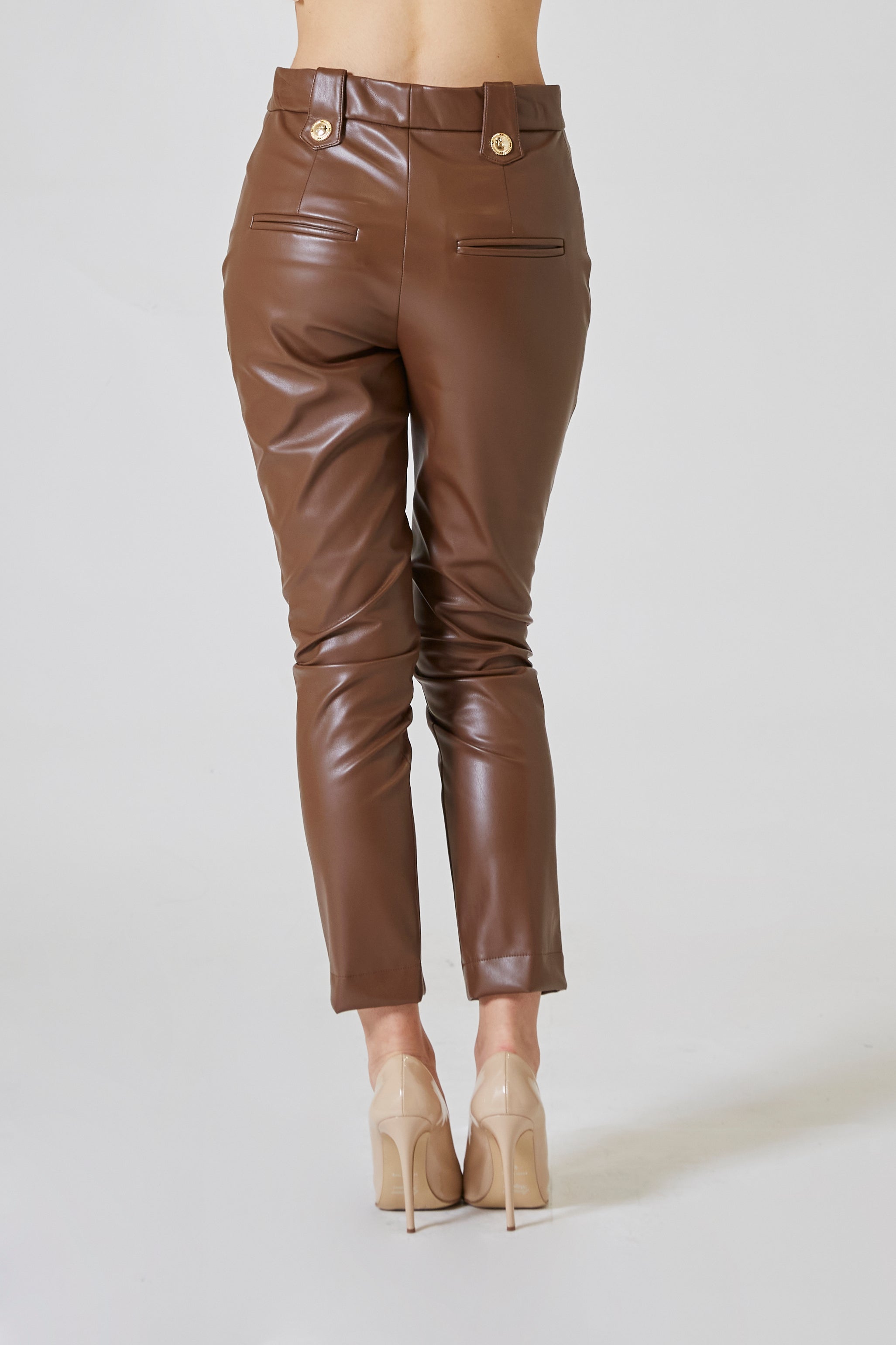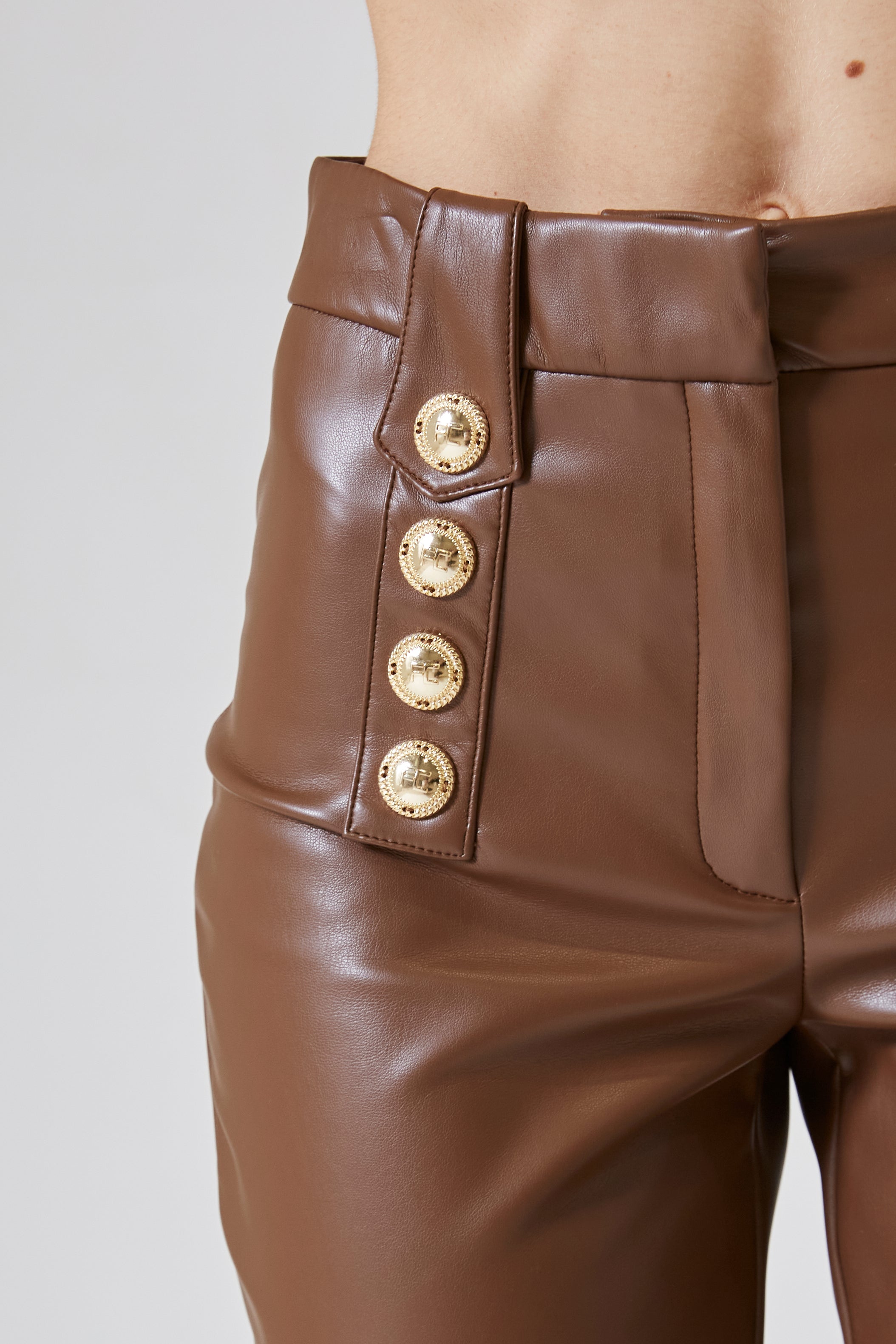 Questo pantalone in ecopelle è per chi ha imparato a camminare con sicurezza tra il giorno e la notte, portando con sé stile, carattere e una scintilla d’oro sul punto vita.