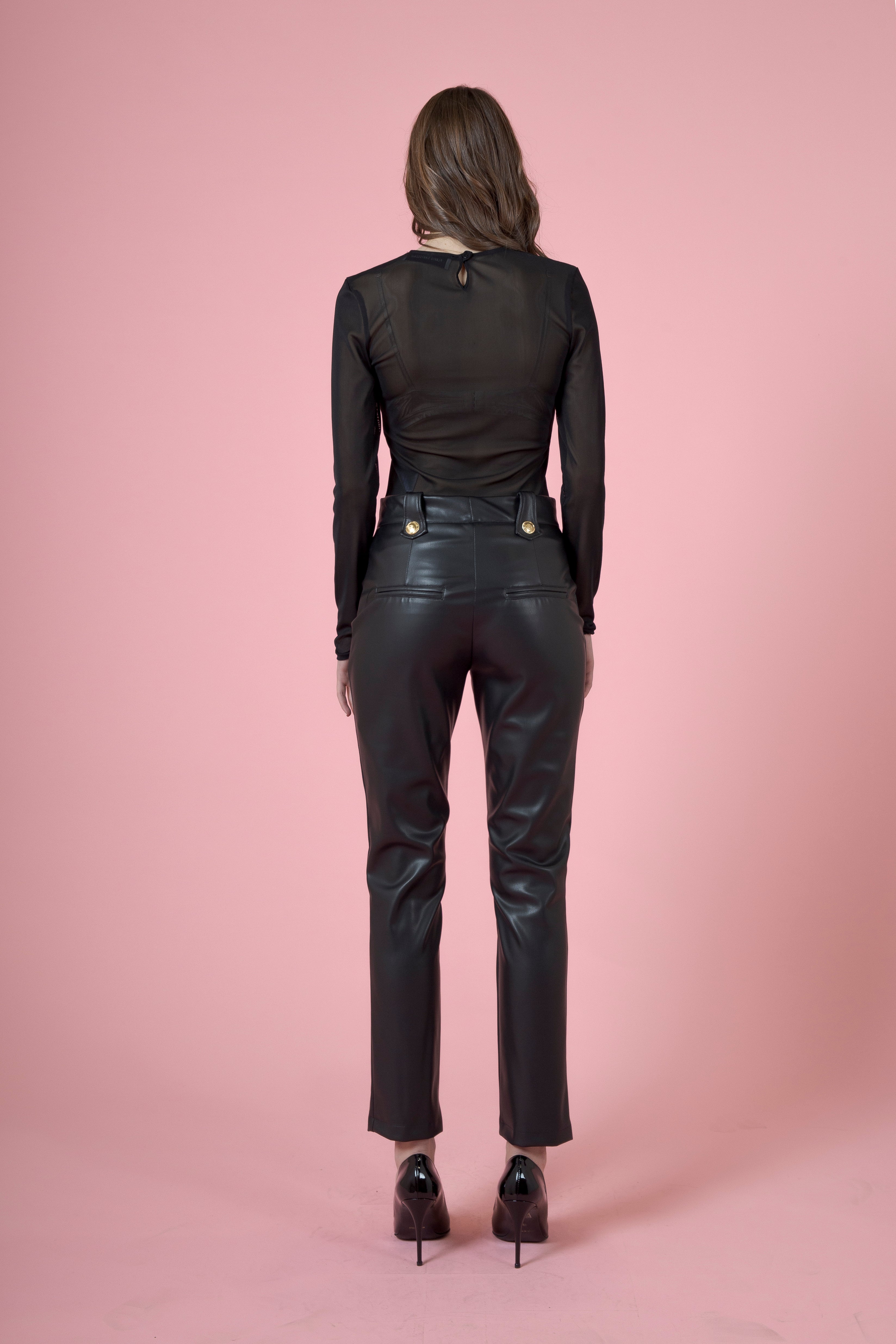 Questo pantalone in ecopelle è per chi ha imparato a camminare con sicurezza tra il giorno e la notte, portando con sé stile, carattere e una scintilla d’oro sul punto vita.