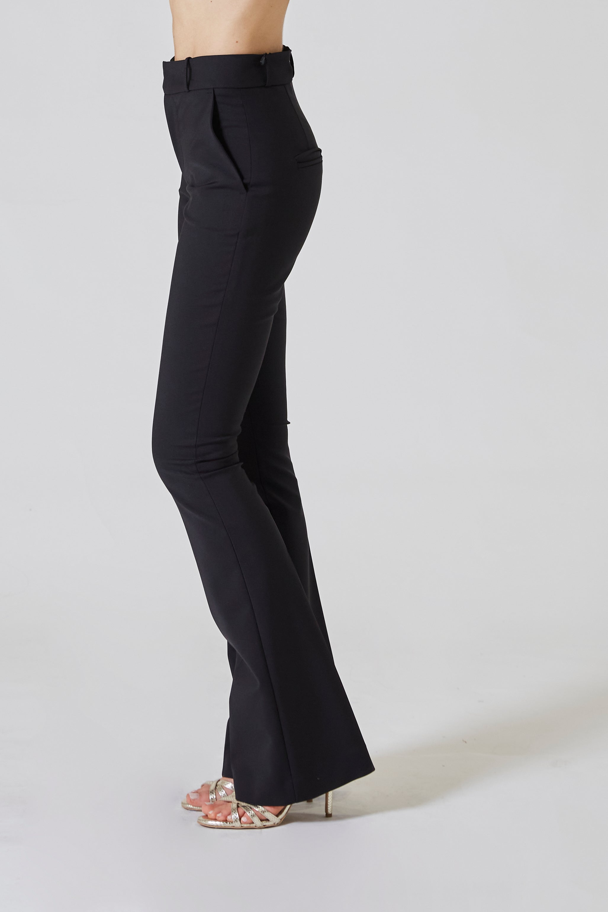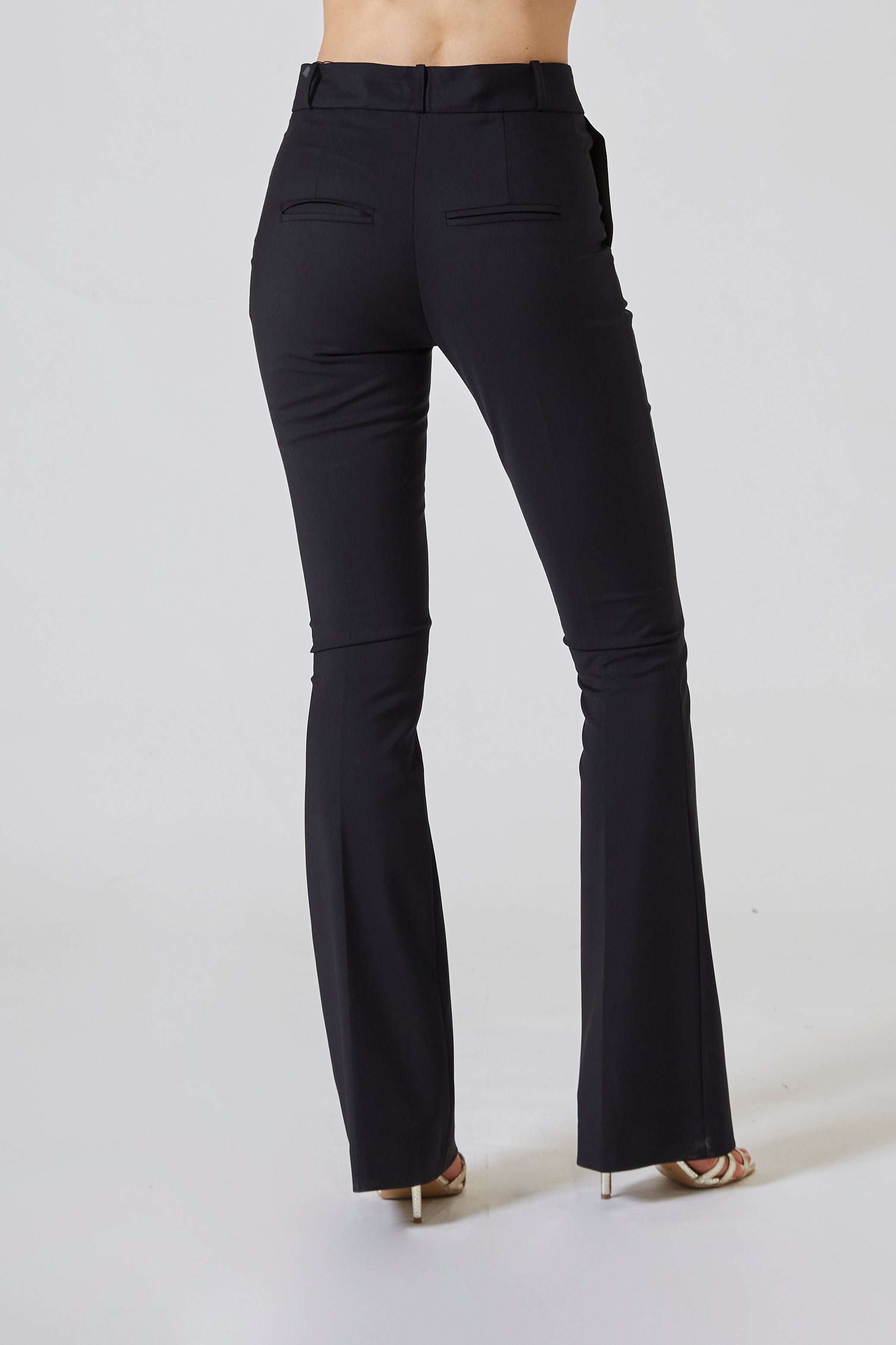 Il punto vita alto abbraccia le forme con discrezione, valorizzando la silhouette e allungando otticamente la gamba. La linea asciutta sulle cosce si apre con garbo a partire dal ginocchio, creando una morbida svasatura che sfiora il pavimento e accompagna ogni movimento con fluidità. È un pantalone che dona slancio e leggerezza, trasformando la semplicità della forma in pura eleganza dinamica.