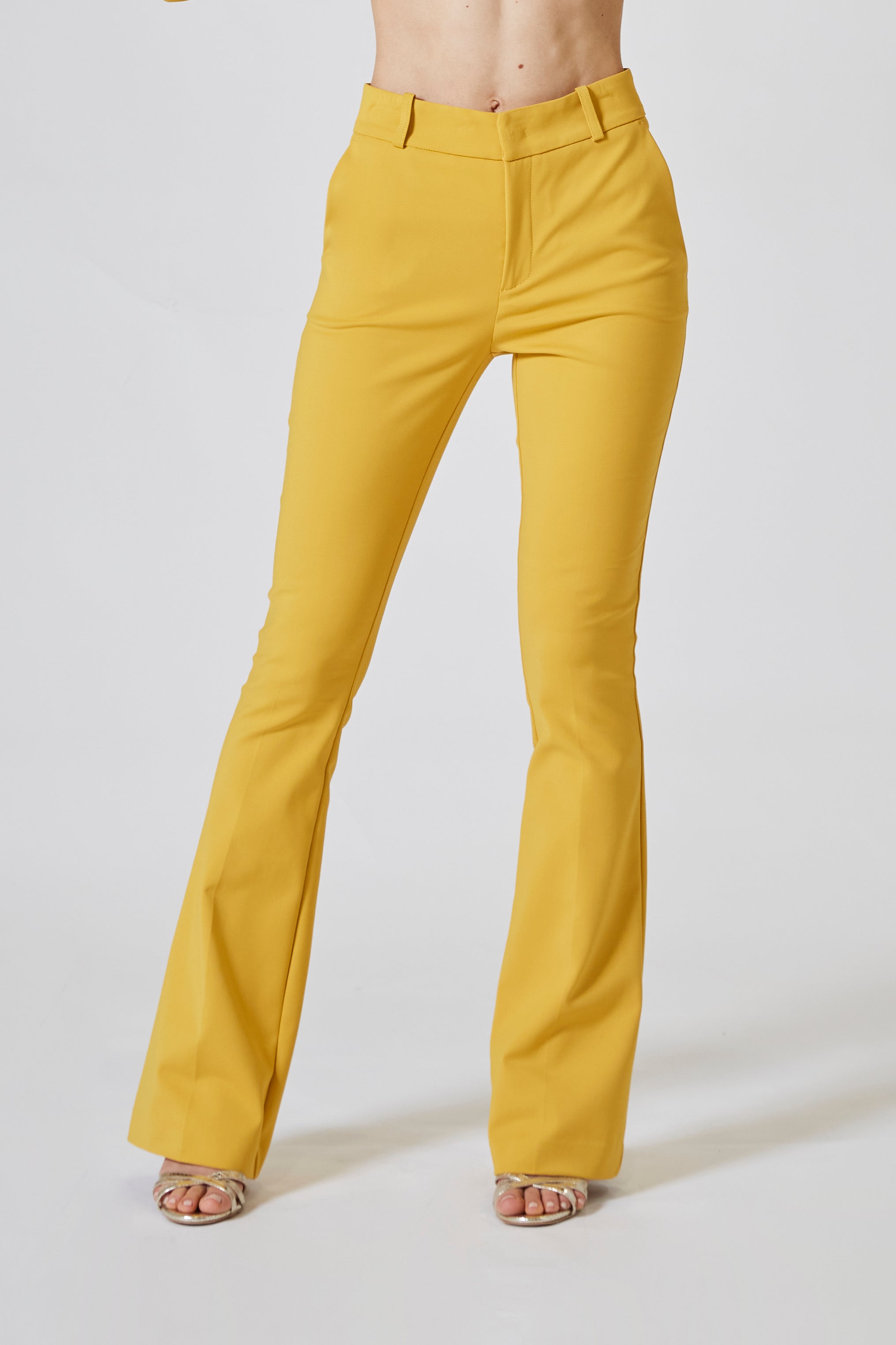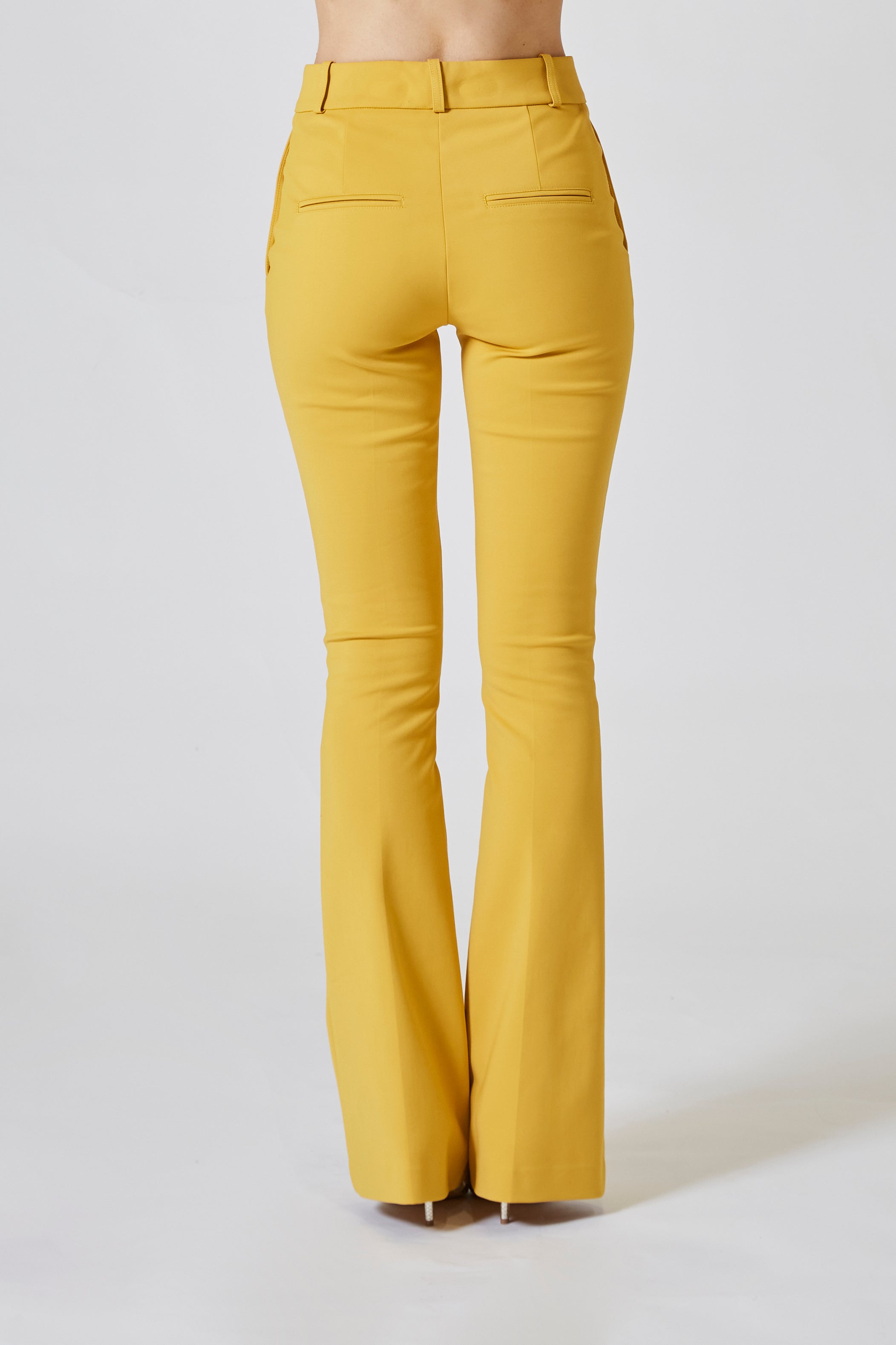 Il punto vita alto abbraccia le forme con discrezione, valorizzando la silhouette e allungando otticamente la gamba. La linea asciutta sulle cosce si apre con garbo a partire dal ginocchio, creando una morbida svasatura che sfiora il pavimento e accompagna ogni movimento con fluidità. È un pantalone che dona slancio e leggerezza, trasformando la semplicità della forma in pura eleganza dinamica.