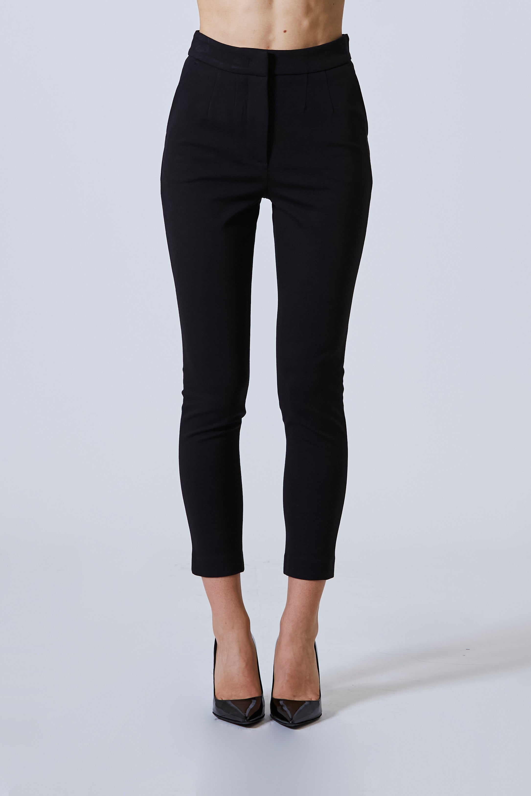 La linea è slanciata e affilata, disegnata per valorizzare la figura con eleganza e rigore. Il pantalone abbraccia la vita alta con precisione sartoriale, per poi scendere dritto lungo la gamba, sfiorando la pelle senza costringerla. Il taglio è asciutto, ma non rigido: segue il corpo, lo accompagna, esaltandone la forma naturale con un’eleganza essenziale.