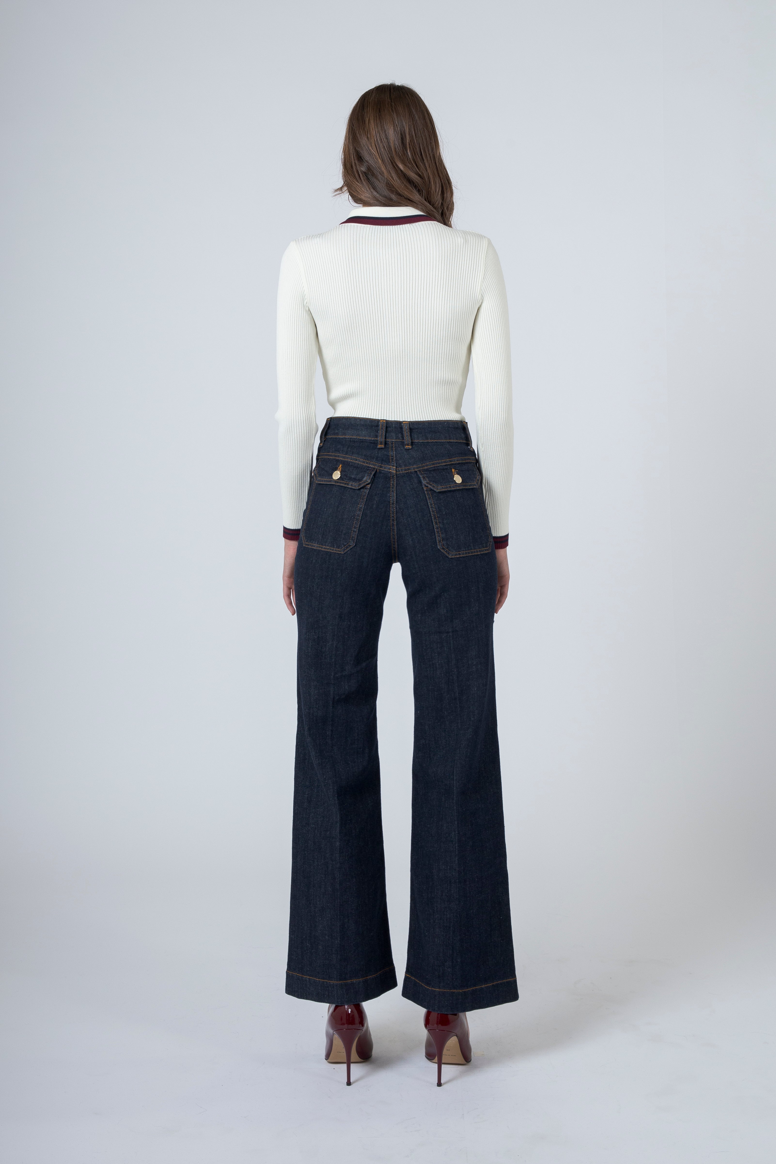 Su questo fondo armonioso si posa il gioco raffinato dei profili a contrasto: un bordeaux profondo, caldo come un sorso di vino al tramonto, e un nero intenso, fine come una pennellata d’inchiostro. Insieme, incorniciano le taschine poste sul seno, il colletto e i polsi, trasformandoli in elementi grafici, piccoli richiami d’eleganza che catturano lo sguardo con misura.