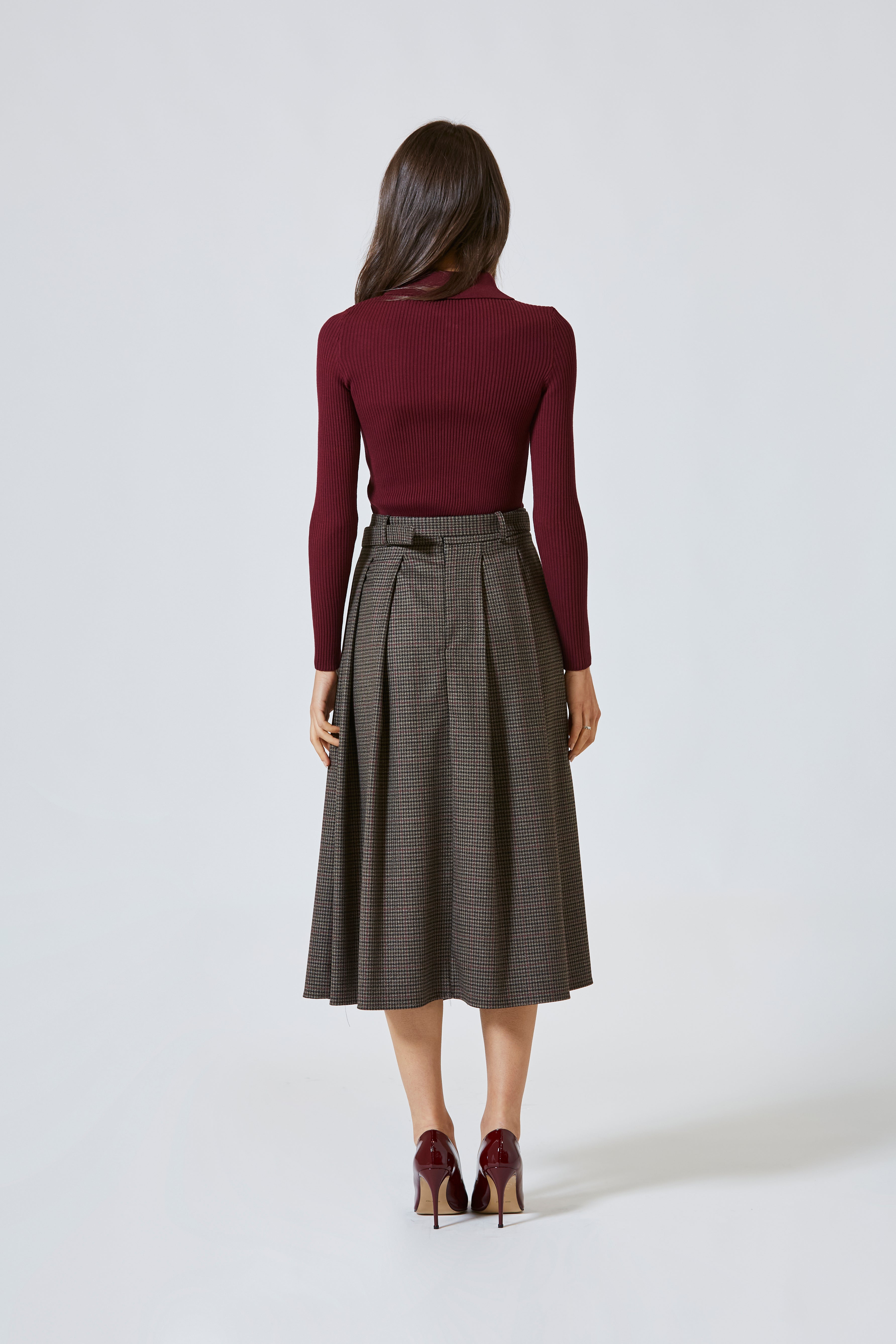 La maglia abbraccia il corpo con naturalezza, seguendo le sue linee senza mai costringerle. La lavorazione a costina verticale slancia la figura con discrezione, regalando al capo un dinamismo visivo che vibra con ogni movimento. È una seconda pelle sofisticata, morbida al tatto ma decisa nella presenza. Leggera, fluida, ma con una struttura sottile che racconta l’intenzione dietro ogni cucitura.