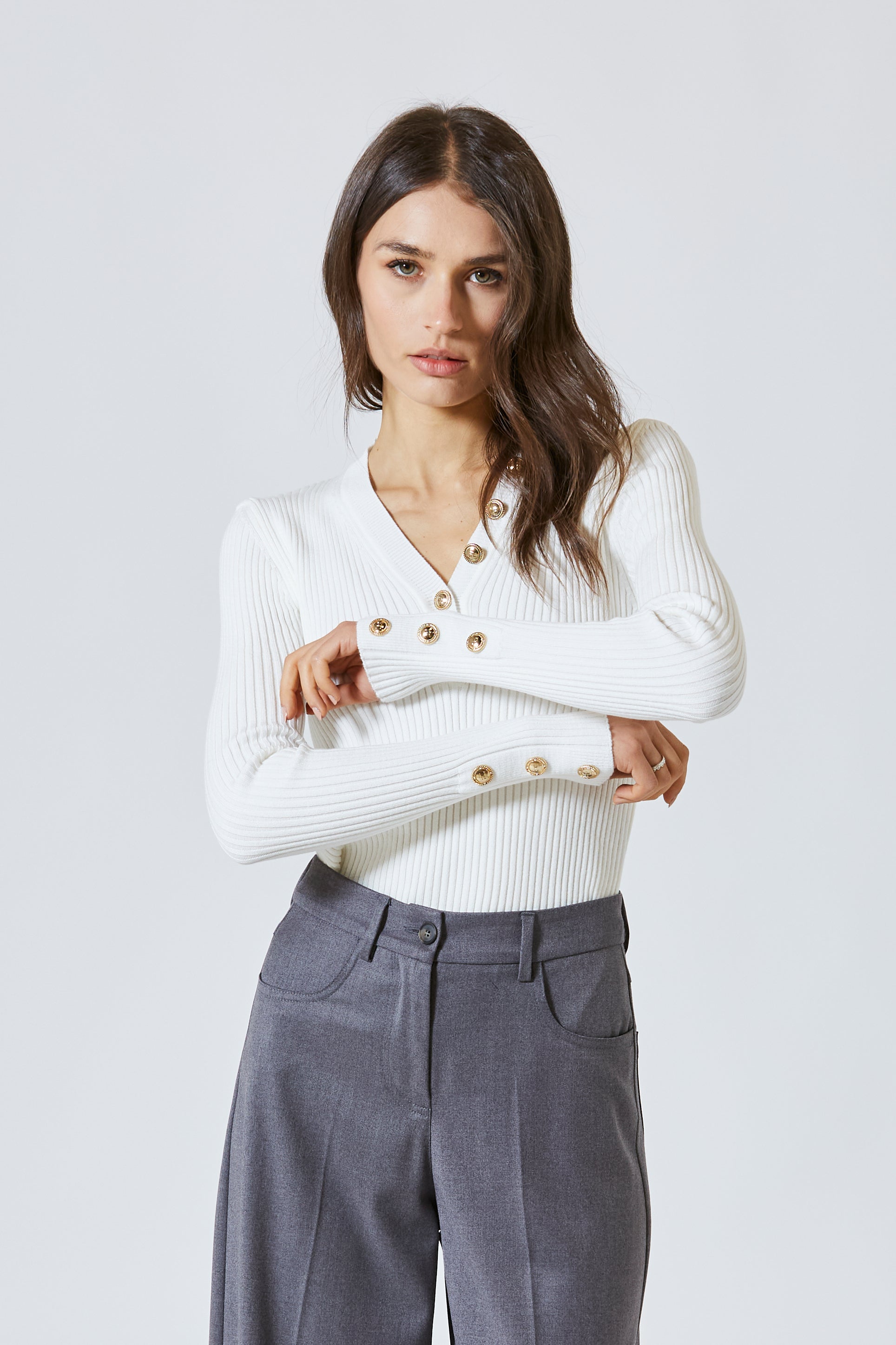Sui lati dello scollo e sui polsi, piccoli bottoni oro FC scintillano come piccole gemme, aggiungendo un dettaglio di luce e preziosità senza mai risultare eccessivi. Le maniche lunghe scivolano morbide fino ai polsi, dove i bottoncini dorati chiudono il capo con un gesto di eleganza sartoriale, quasi un piccolo gioiello da indossare.