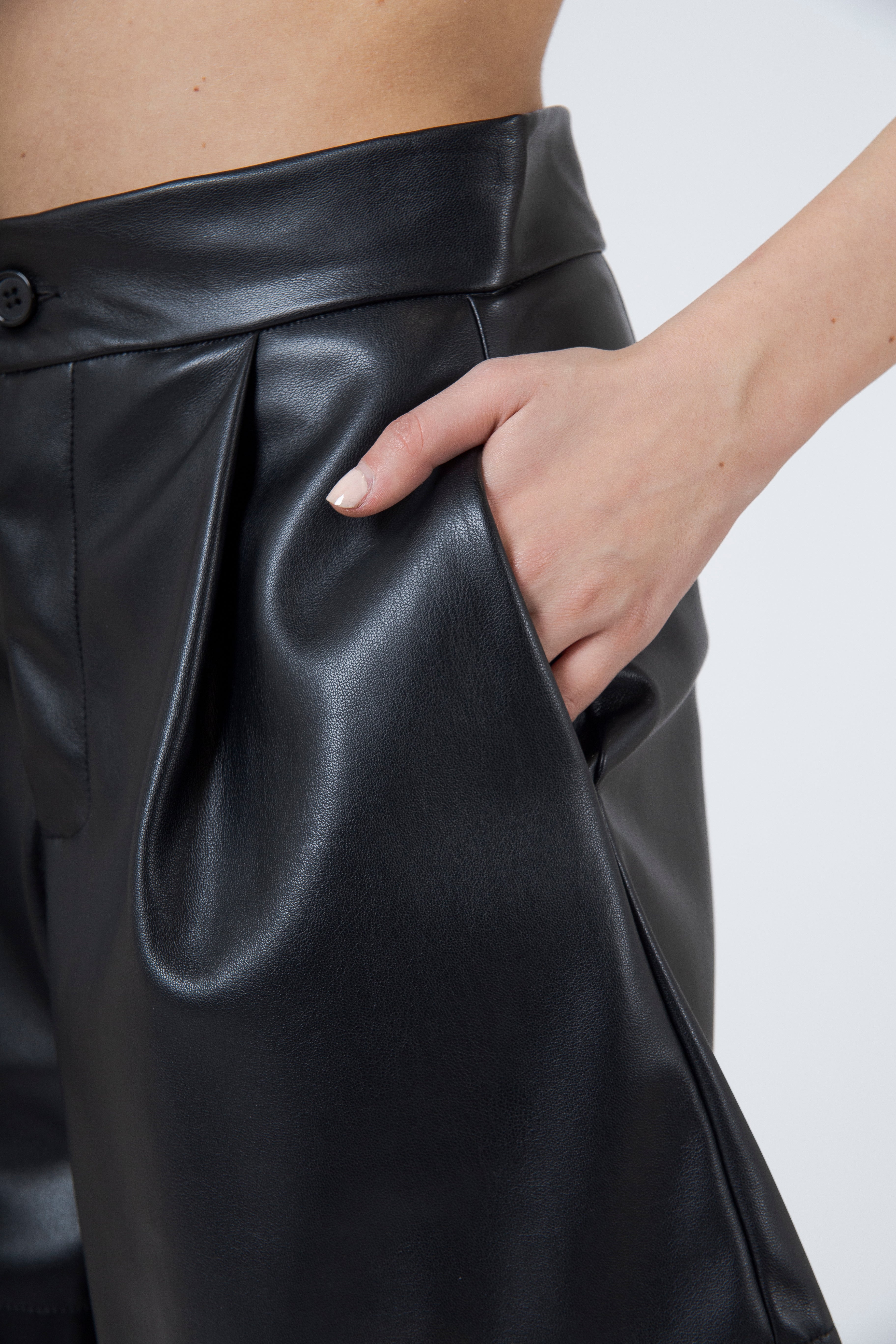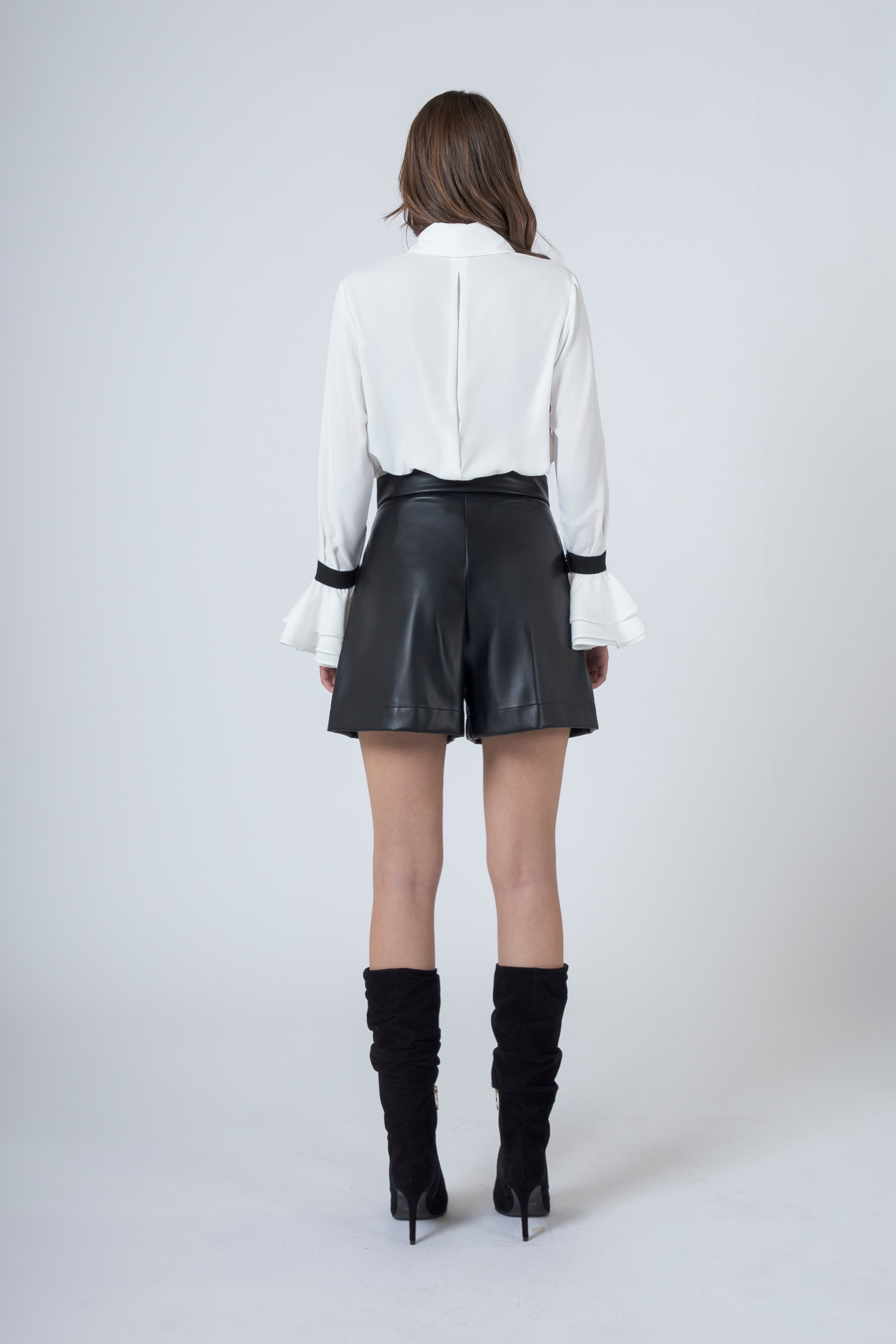Sono short in ecopelle a vita alta che sembrano nascere dal carattere della notte e dalla sicurezza di un passo deciso. Un capo che unisce l’audacia della materia al rigore della forma, trasformando ogni movimento in un’affermazione di stile.