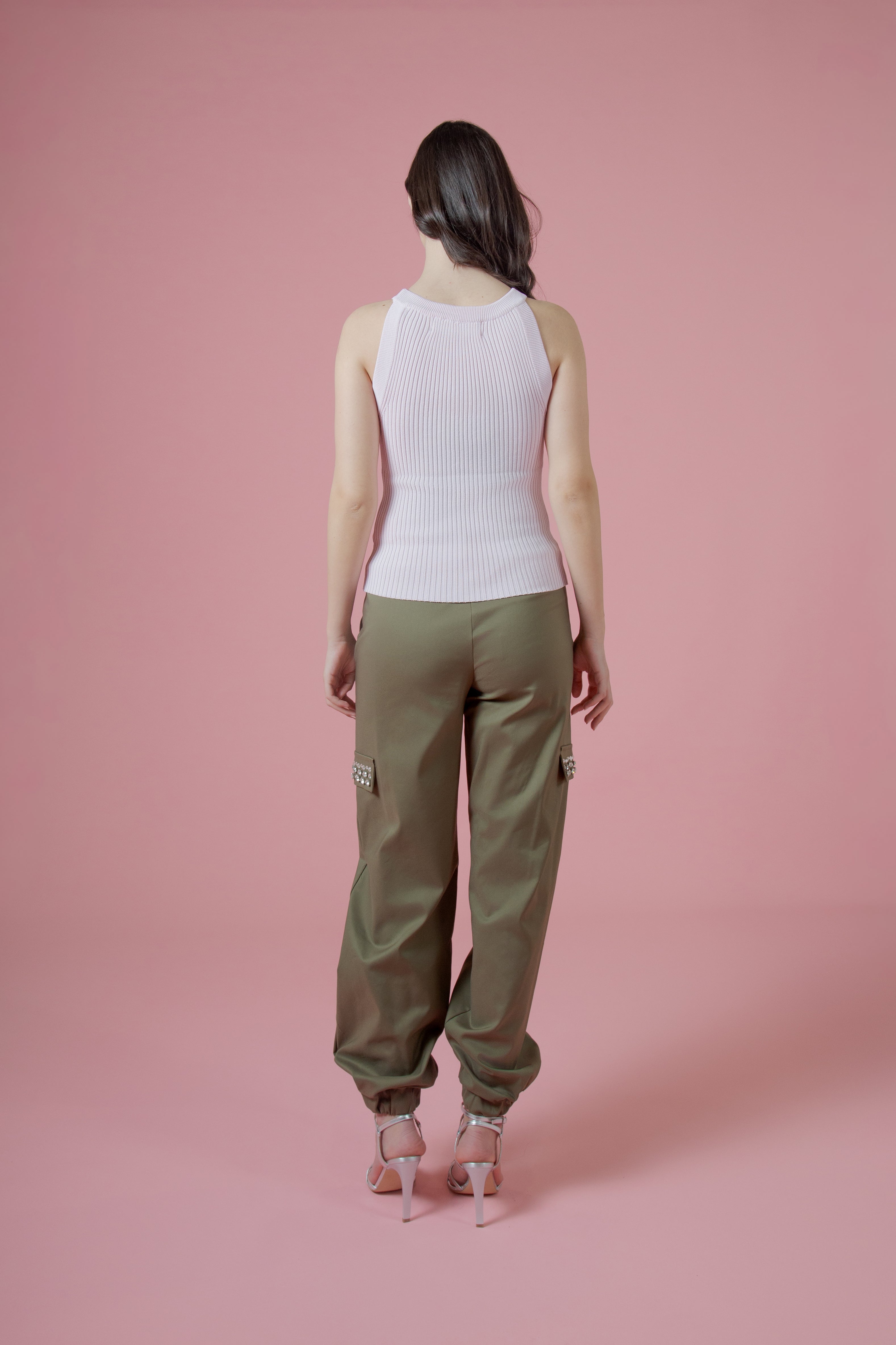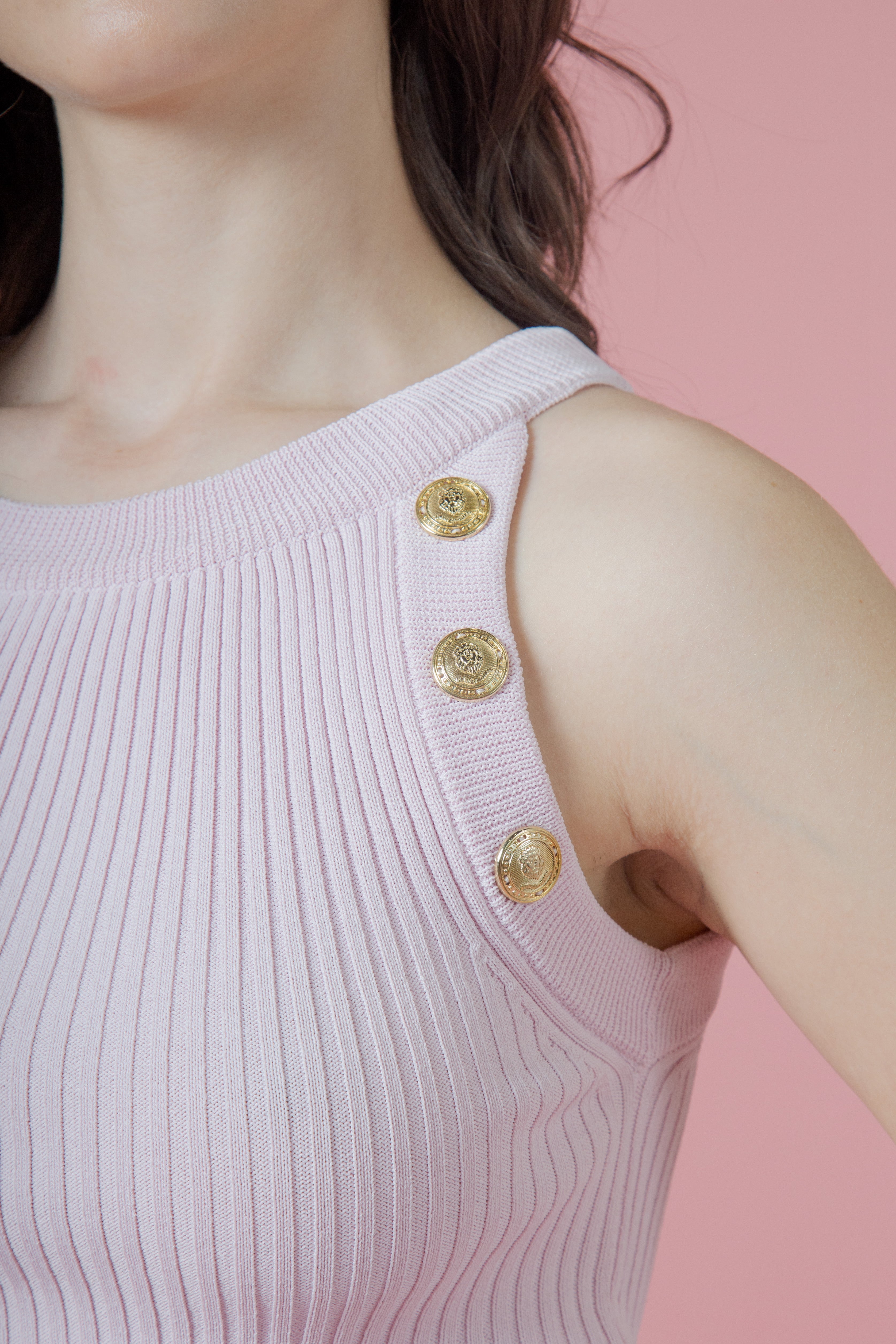 Ma è nei dettagli che il top rivela la sua anima più decisa. Sul giromanica, infatti, spiccano piccoli bottoni dorati, applicati con precisione, come punti di luce studiati ad arte. Non sono solo decorativi: aggiungono ritmo, impreziosiscono la linea e catturano lo sguardo con riflessi caldi, creando un contrasto raffinato con la morbidezza opaca della maglia.