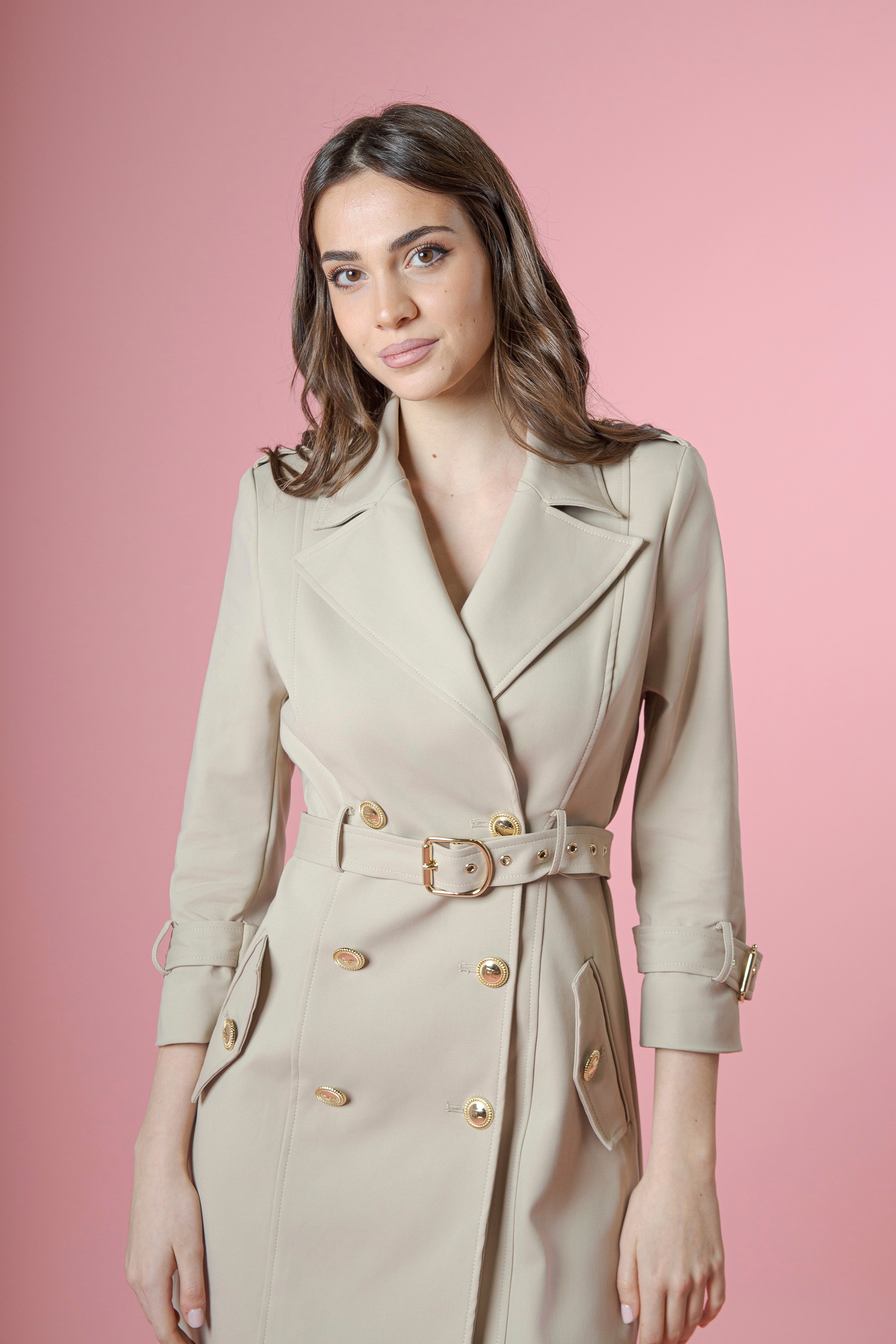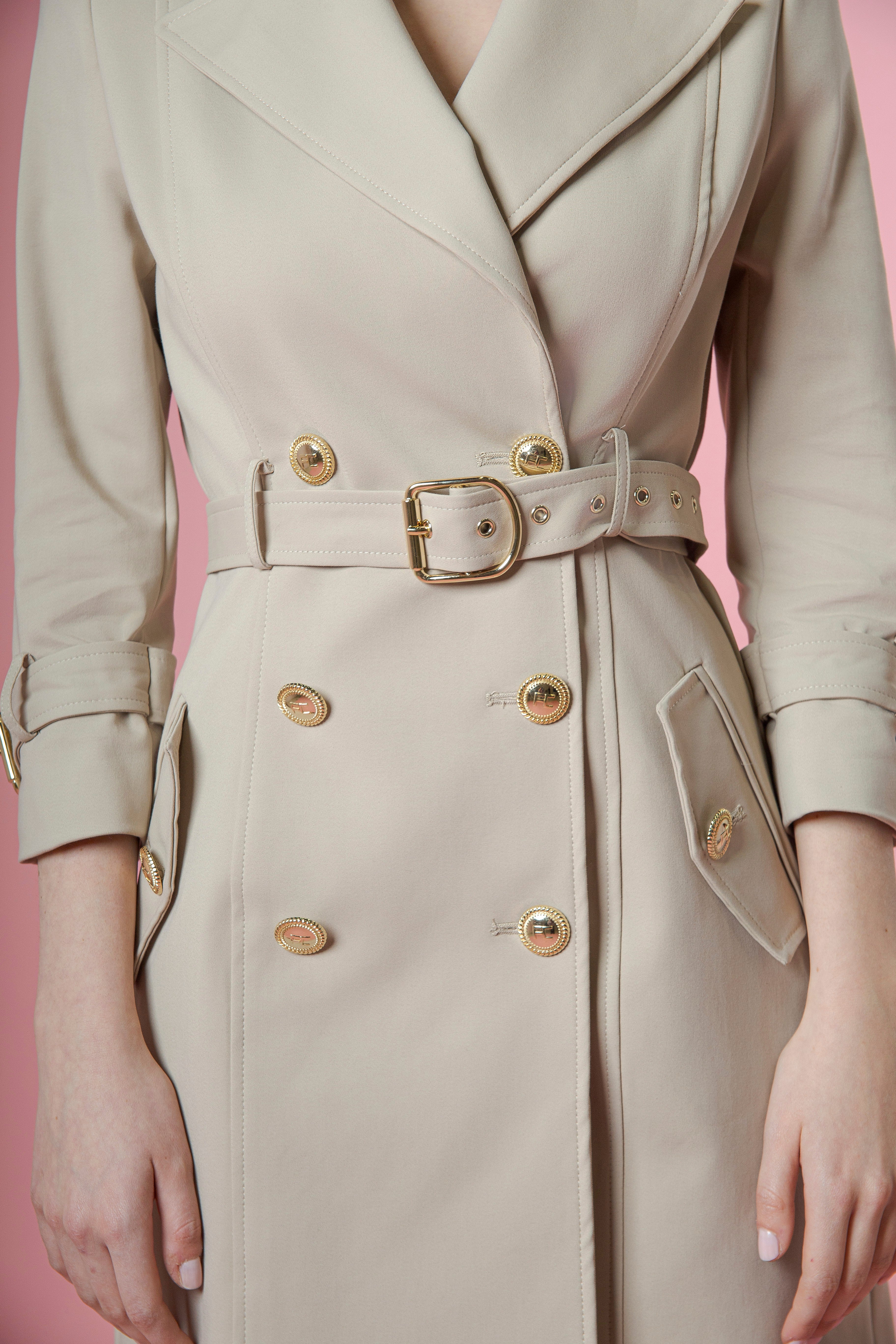 I bottoni oro, luminosi e preziosi, punteggiano il davanti come piccoli gioielli, catturando la luce e regalando al capo un’allure sofisticata e decisa. La cintura in vita, impreziosita da una fibbia oro, stringe delicatamente il punto vita, valorizzandolo con un gesto elegante e sensuale, mentre le cinture sui polsi, rifinite con la stessa fibbia dorata, aggiungono un dettaglio ricercato che parla di cura sartoriale e stile senza tempo.