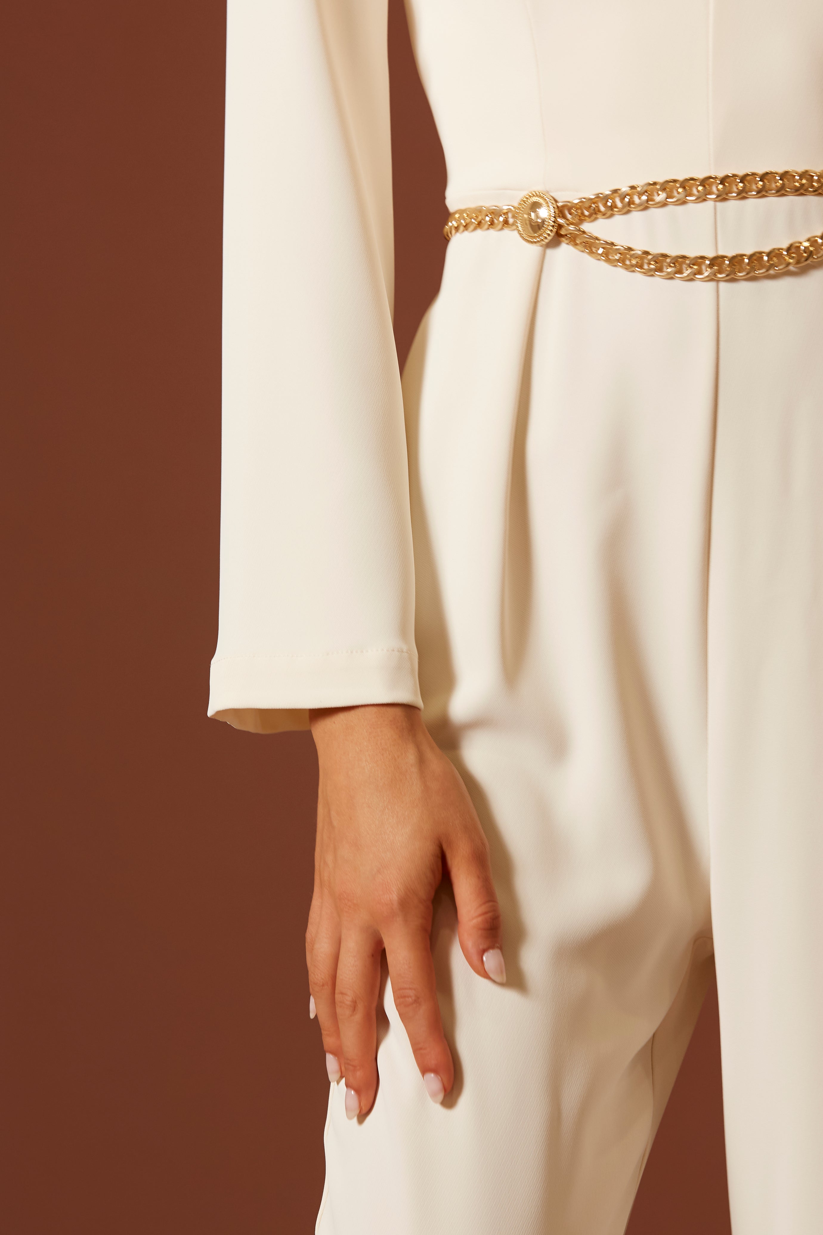 Realizzata in un tessuto morbido ma compatto, la tuta si adatta con naturalezza alle forme, mantenendo il suo portamento anche dopo ore di indosso. È un capo nato per accompagnare con disinvoltura le occasioni più importanti: una cena elegante, un evento serale, una giornata di lavoro dove la presenza conta.