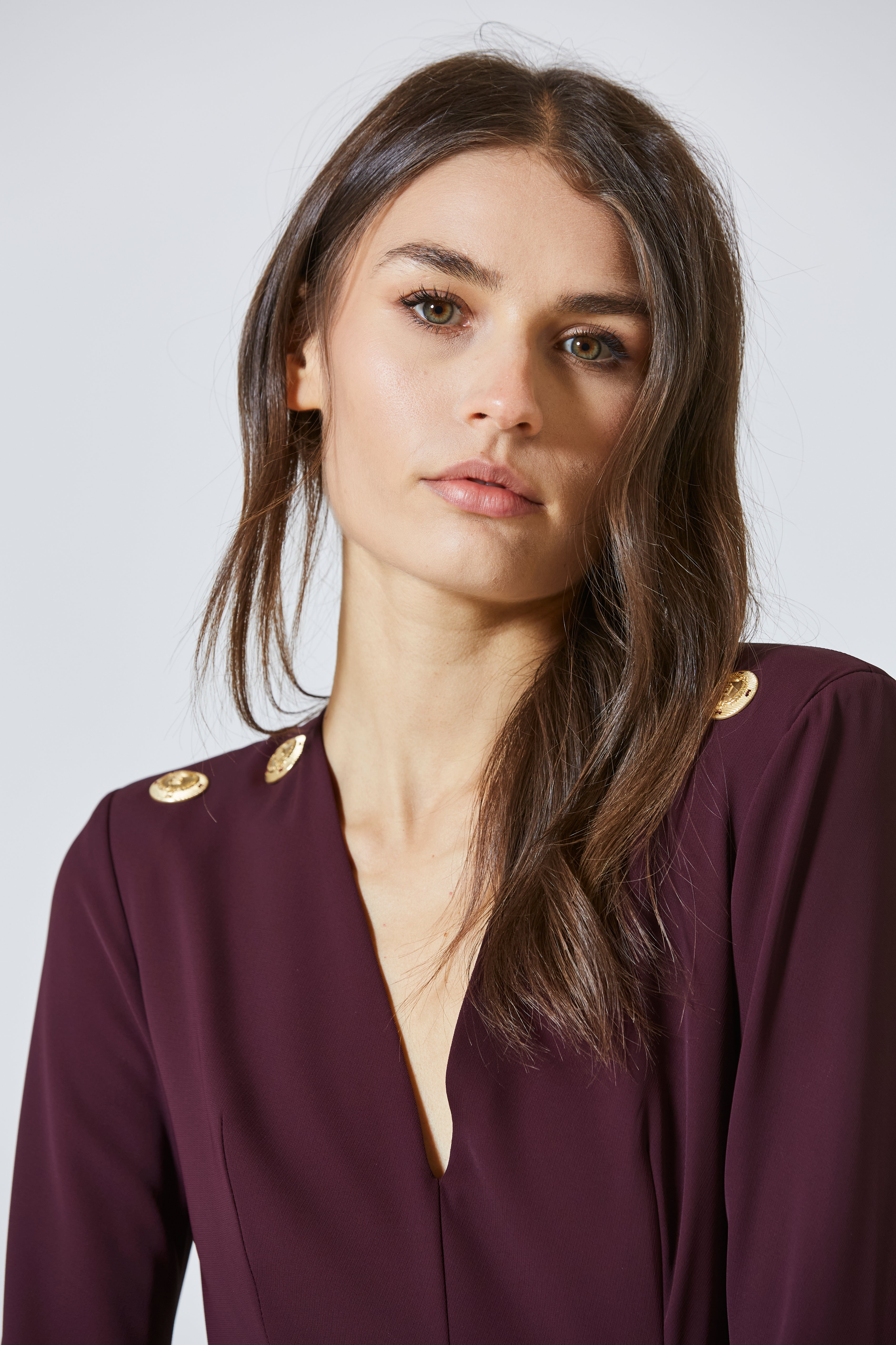 Ma sono i dettagli sulle spalle a raccontare la vera identità della tuta: spalline sartoriali che danno struttura e potenza alla parte superiore del capo, arricchite da bottoni dorati Flavio Castellani, piccoli elementi luminosi che catturano la luce e firmano con discreta autorevolezza l’intero look. Ogni bottone è più di un dettaglio: è un simbolo di stile, un richiamo al savoir-faire italiano, alla cura per il particolare, alla forza del minimalismo prezioso.