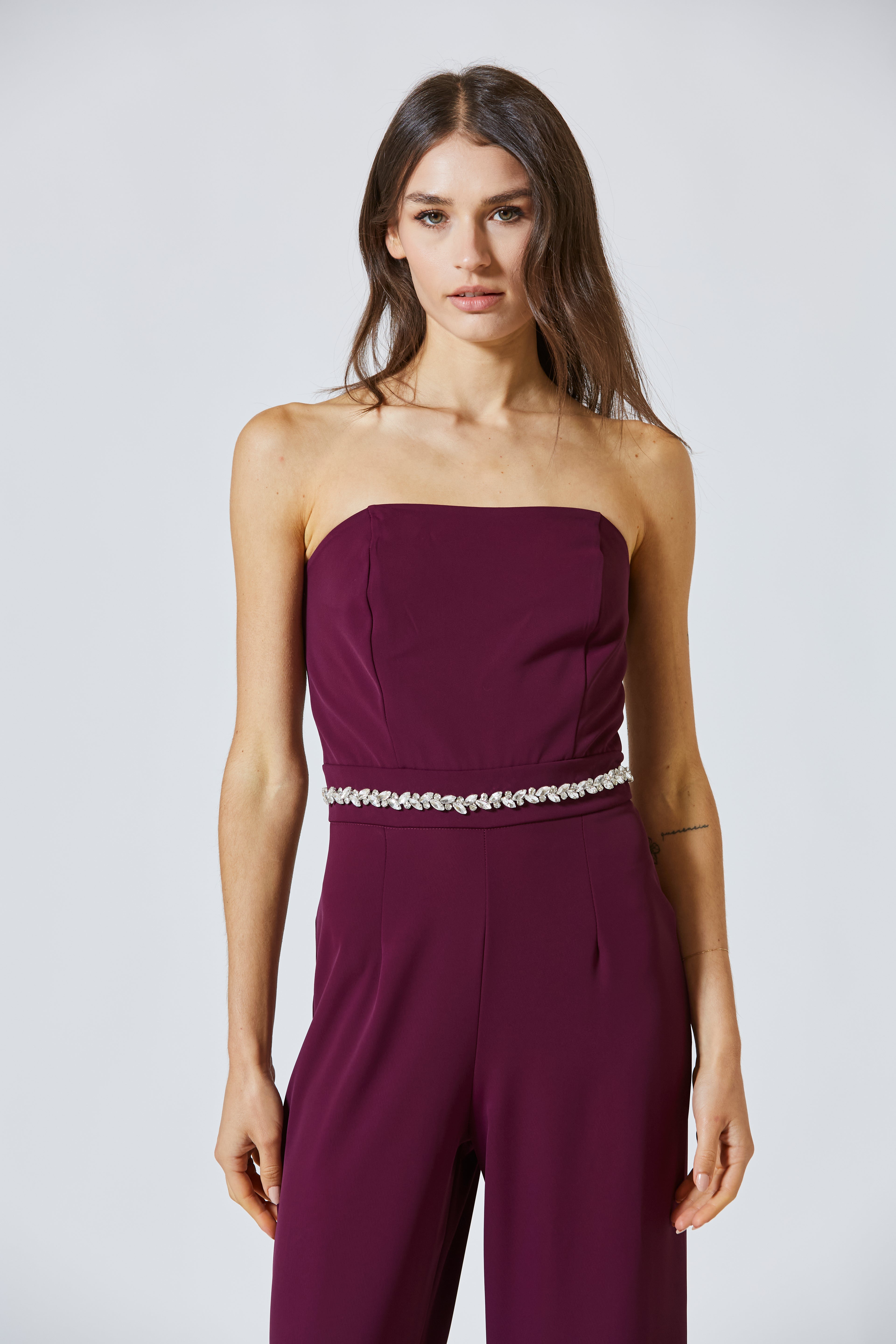 La tuta a fascia con gioiello applicato in vita e pantalone lungo ampio è la quintessenza dell’eleganza contemporanea: un capo unico, scenografico ma essenziale, pensato per esaltare la silhouette con naturalezza e magnetismo. Firmata Flavio Castellani, questa tuta è l’espressione di una femminilità che non ha bisogno di eccessi per essere protagonista.