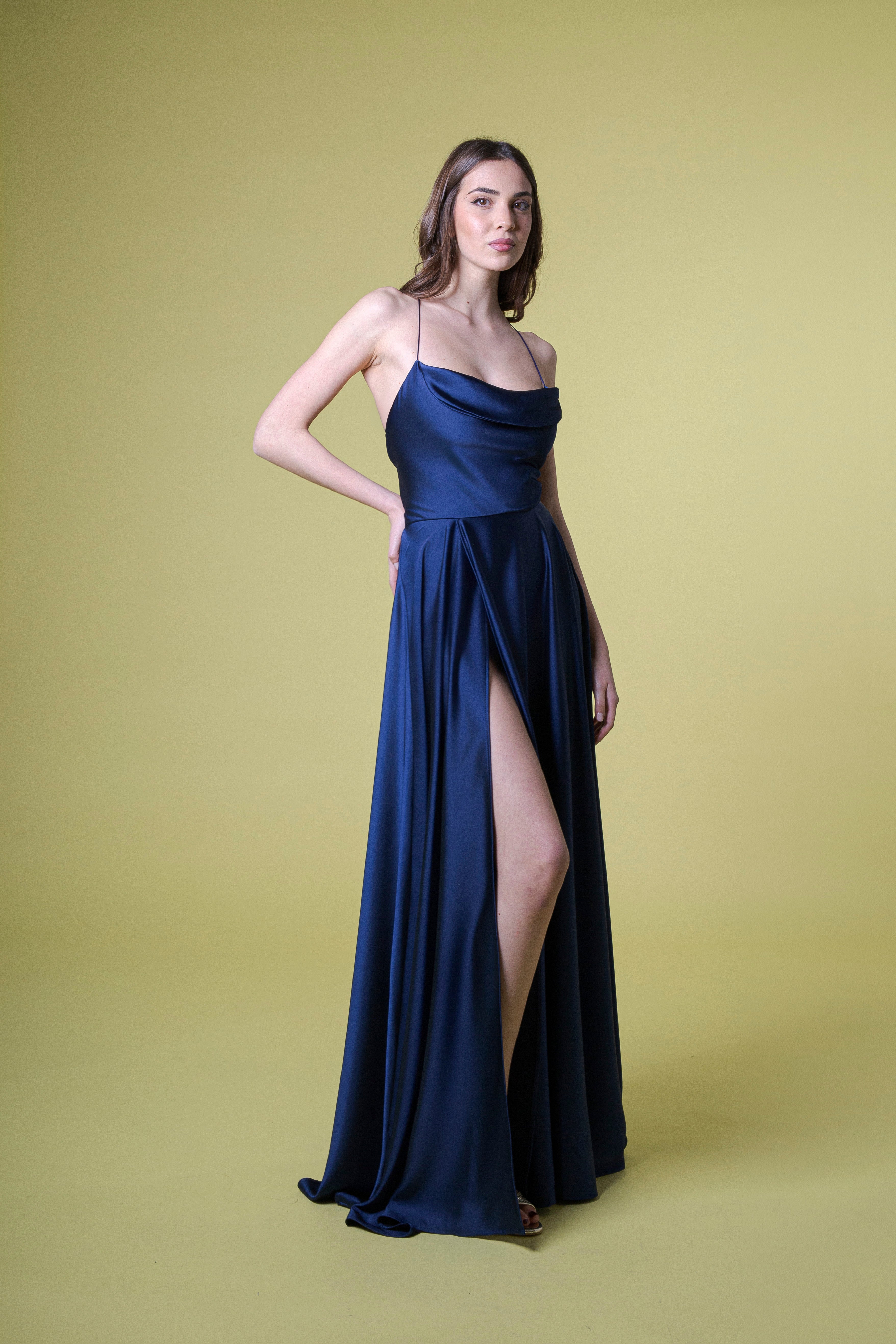 Il davanti si apre con uno scollo morbido, delicato e sinuoso, che avvolge il décolleté con naturalezza, regalando grazia e sensualità senza mai risultare eccessivo. L’inedito spacco laterale, lungo e sofisticato, aggiunge dinamismo e movimento, lasciando intravedere la gamba ad ogni passo e trasformando ogni gesto in un piccolo momento di leggerezza e audacia raffinata.