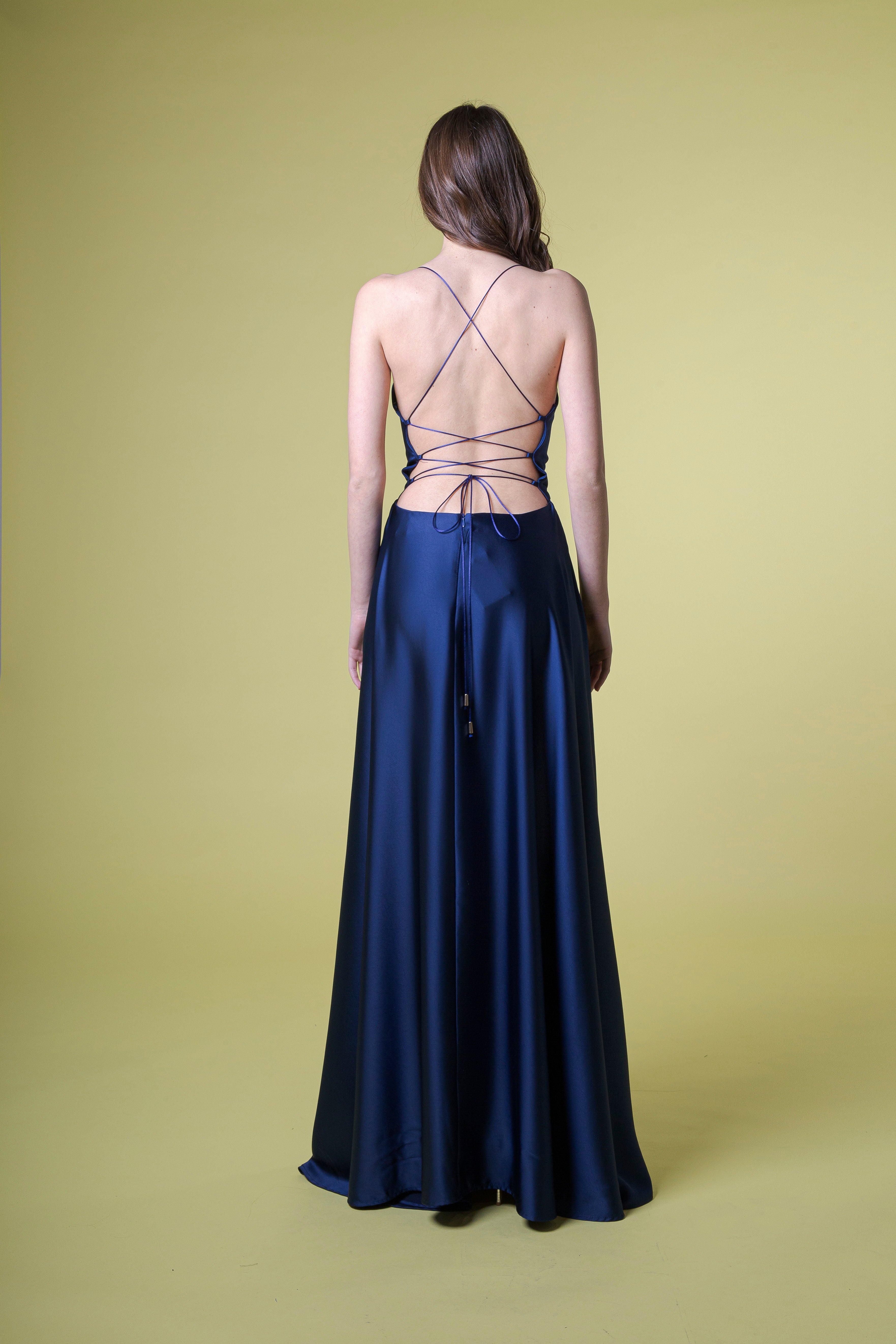 La schiena resta il cuore poetico dell’abito: gli incroci in filo di raso disegnano linee eleganti e sinuose, intrecciando raffinatezza e sensualità in un dettaglio studiato con maestria. Le spalline fini, sottili come un sussurro, completano il capo permettendo al tessuto di scivolare liberamente, accentuando la fluidità della silhouette e donando un senso di libertà e armonia senza tempo.