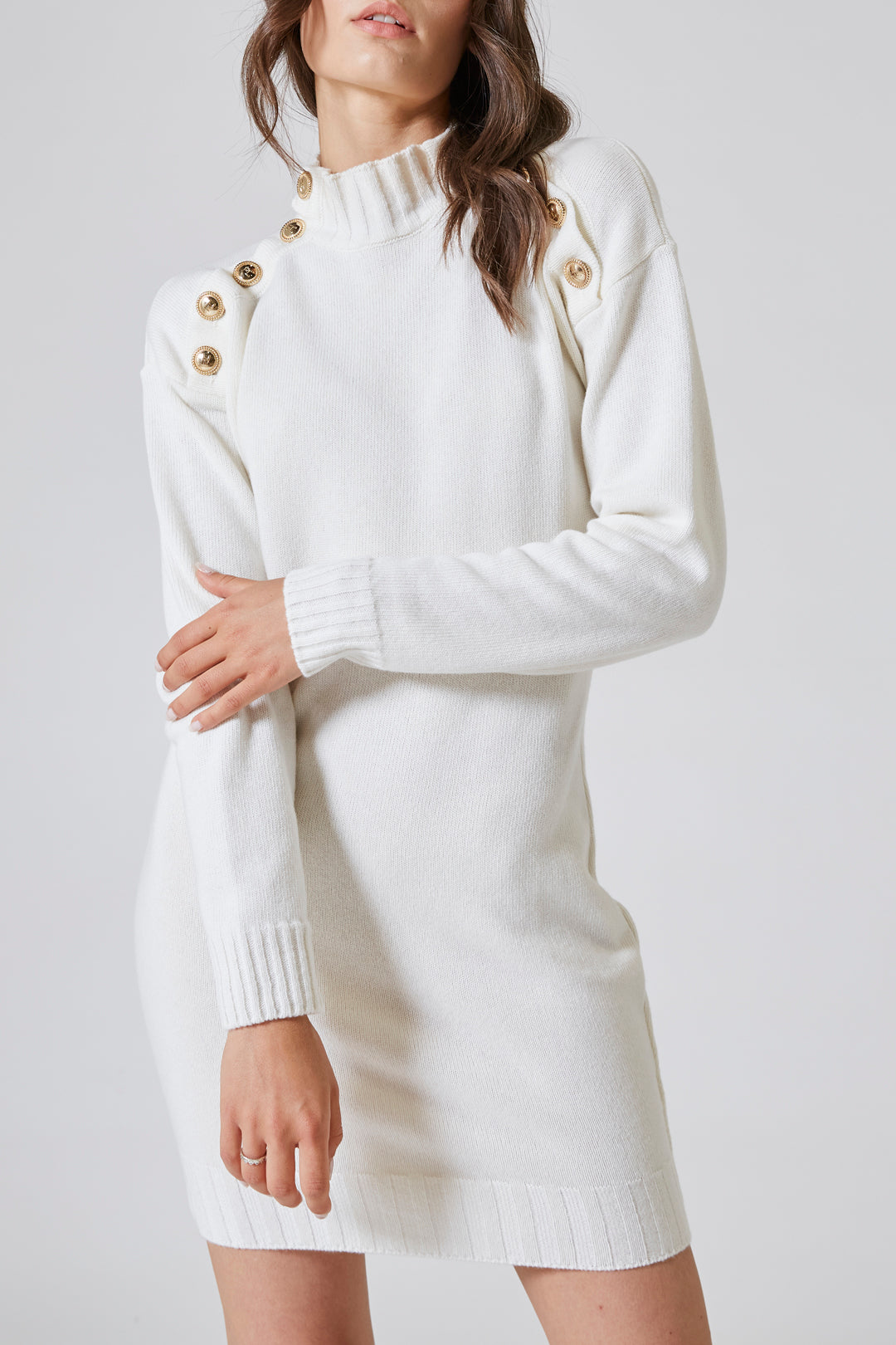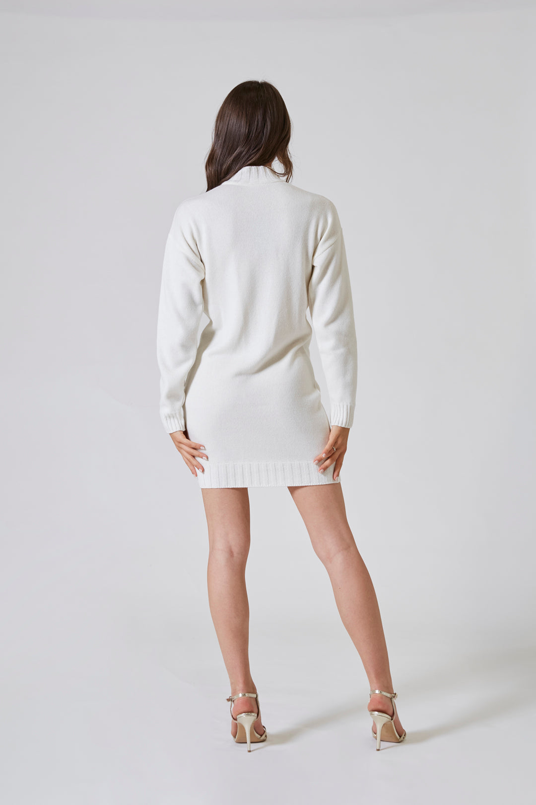 Leggero come un pensiero gentile, l’abito corto in maglia si posava sul corpo con la naturalezza delle cose autentiche. Il filato in misto lana, caldo ma impalpabile, seguiva i movimenti con un ritmo fluido, morbido, quasi intimo. Ogni passo era accompagnato da un’onda silenziosa di tessuto che accarezzava la pelle, regalando quella sensazione di comfort raffinato che appartiene solo ai capi ben costruiti.