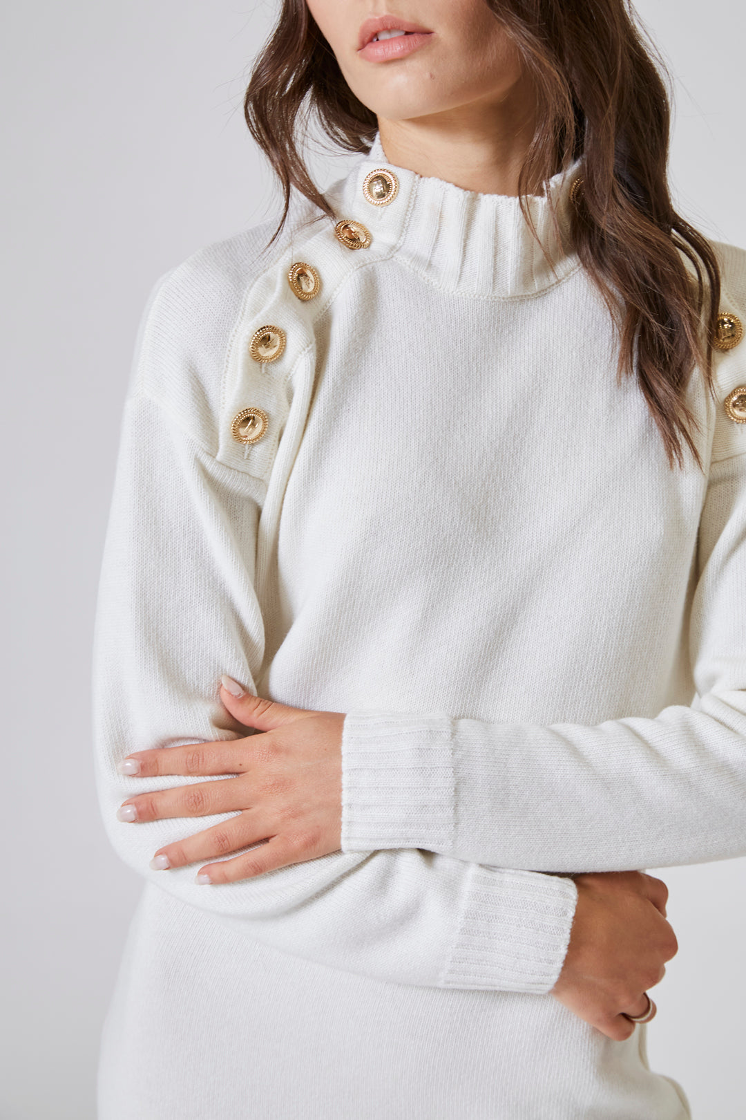 Ma erano i bottoni dorati posati sulle spalle a dare luce all’insieme. Brillavano con discrezione, come gioielli cuciti nella trama. Simmetrici, ordinati, preziosi senza eccesso, richiamavano l’estetica raffinata che da sempre contraddistingue la firma Flavio Castellani. Un tocco di luce che rompeva la morbidezza del tessuto con una nota decisa, sottolineando la forza femminile nascosta nei piccoli dettagli.