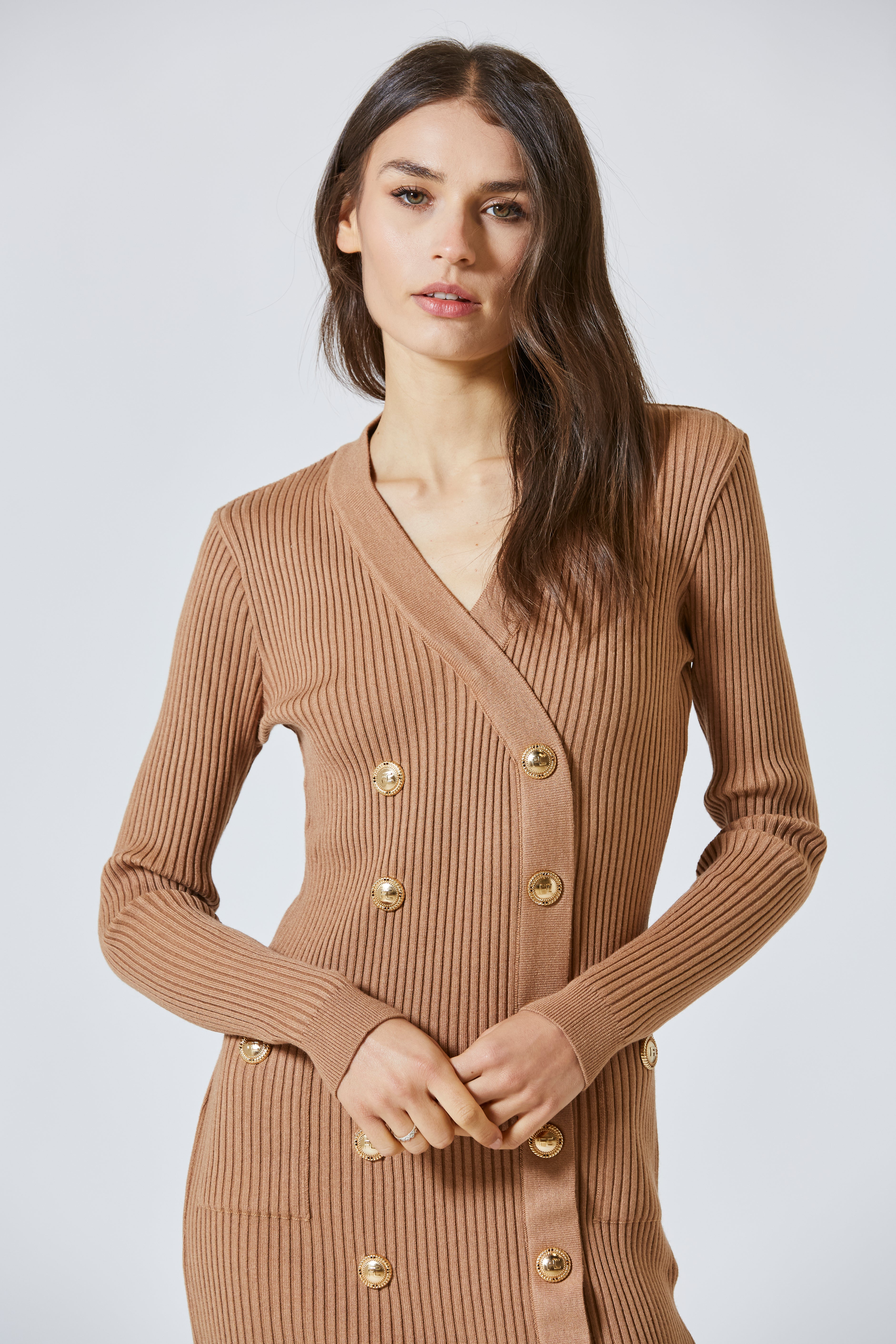 La maglia a costine, finemente lavorata, avvolge il corpo con una texture calda e avvolgente, capace di donare movimento e struttura allo stesso tempo. La linea doppio petto, reinterpretata in chiave femminile, regala un’allure sofisticata e decisa, esaltata dai bottoni oro FC, piccoli gioielli che brillano come punte di luce su un tessuto prezioso.
