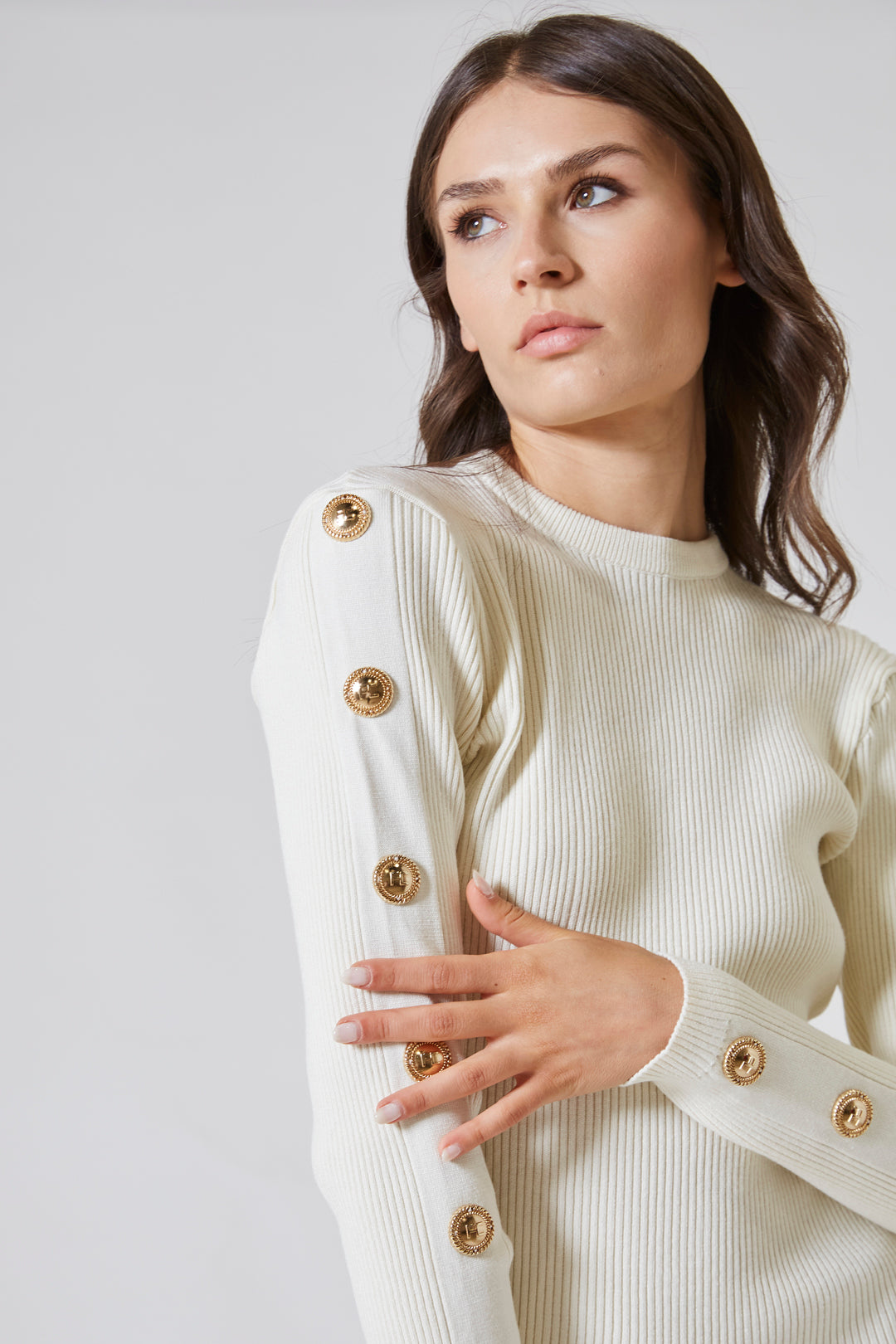 Ma erano i bottoni dorati, distribuiti con sapienza sulle maniche , a trasformare il silenzio dell’abito in sussurro. Lungo le braccia, punteggiavano il polso come piccoli riflessi di luce, aggiungendo un tocco di raffinatezza militare, misurata e potente.