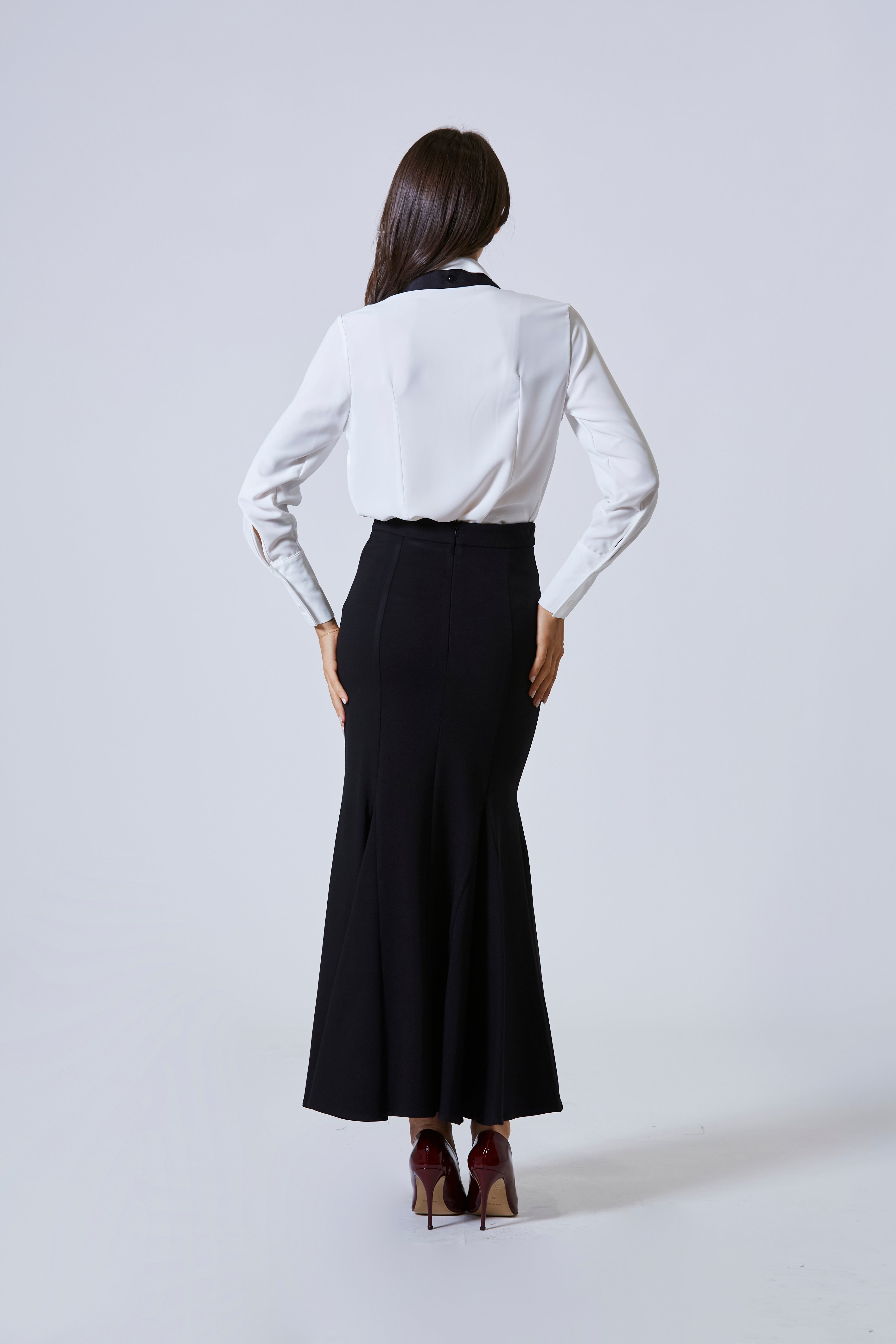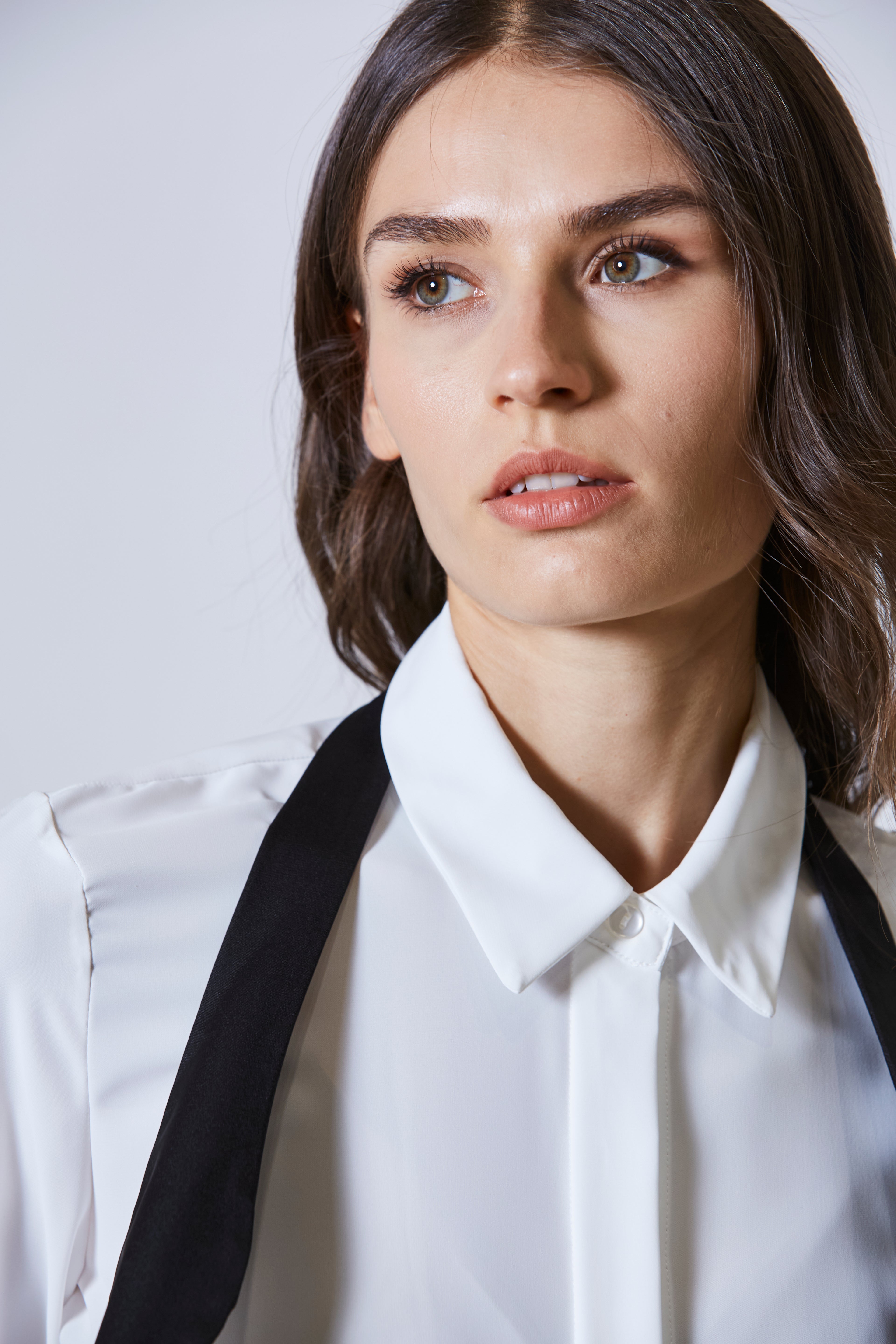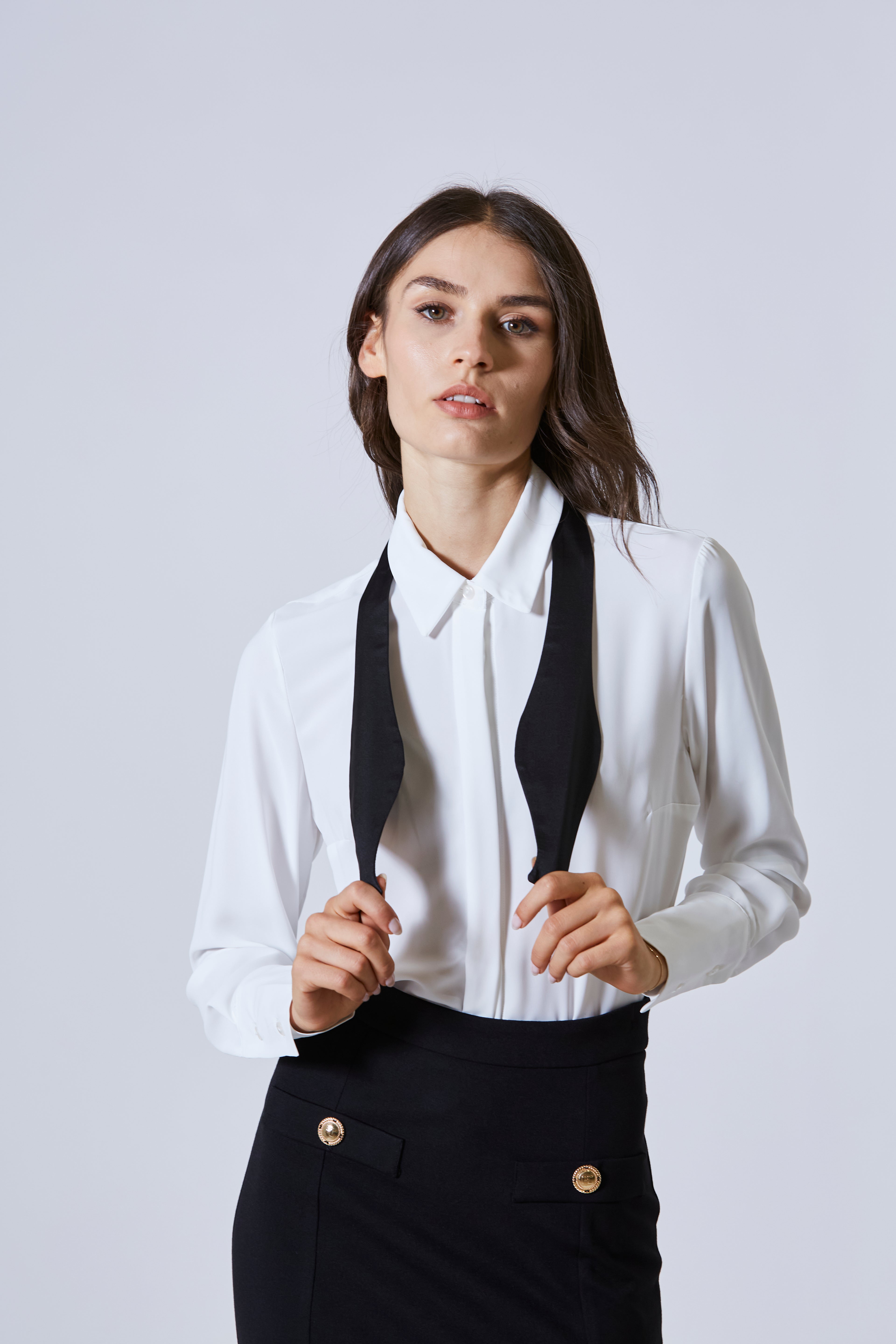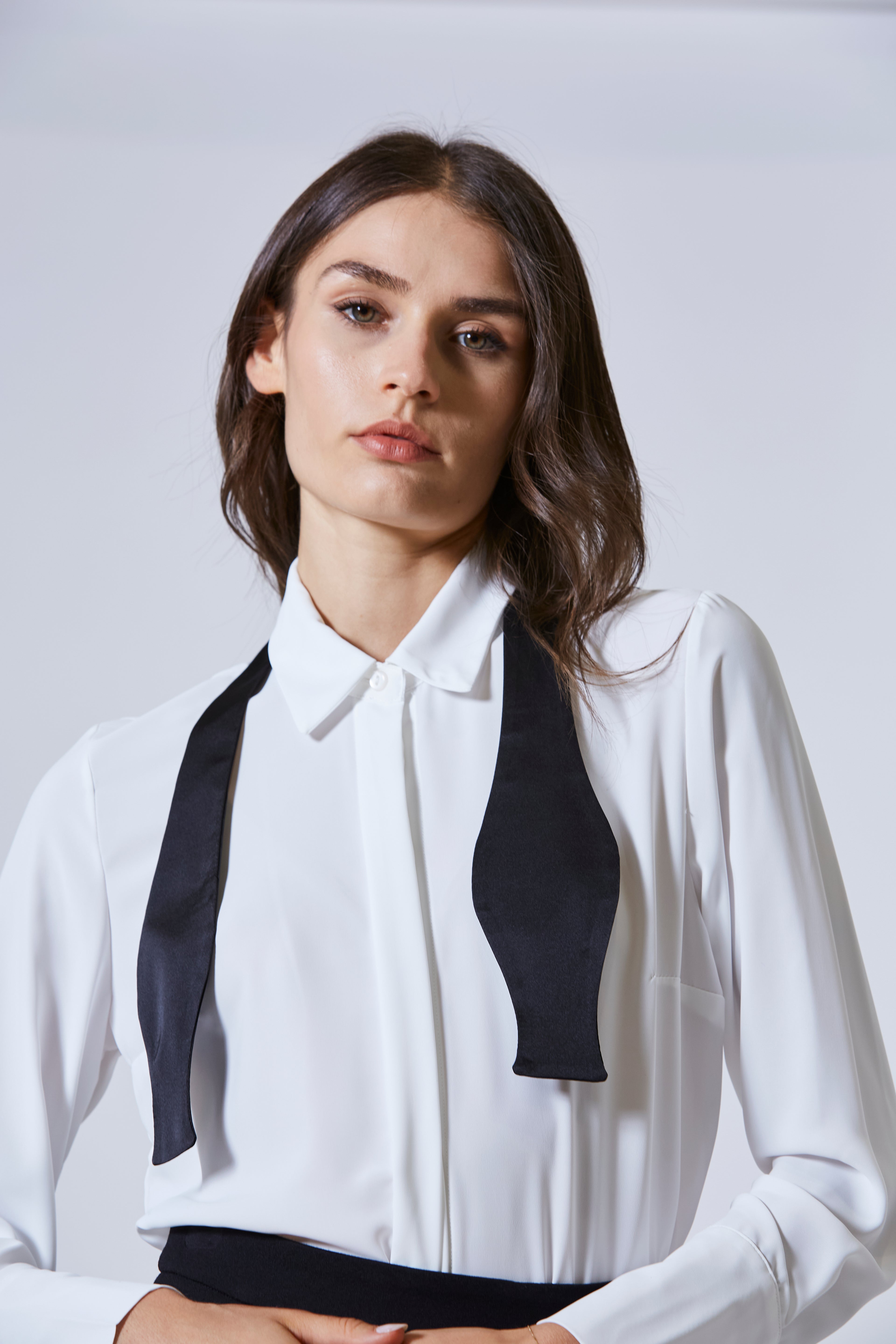 Perfetta da sola, protagonista assoluta con un pantalone a vita alta o una gonna midi. Splendida anche sotto una giacca, dove il papillon rimane visibile, una piccola opera d’arte in movimento. È la camicia da scegliere quando vuoi che sia il dettaglio a parlare per te — sottile, elegante, e assolutamente indimenticabile.