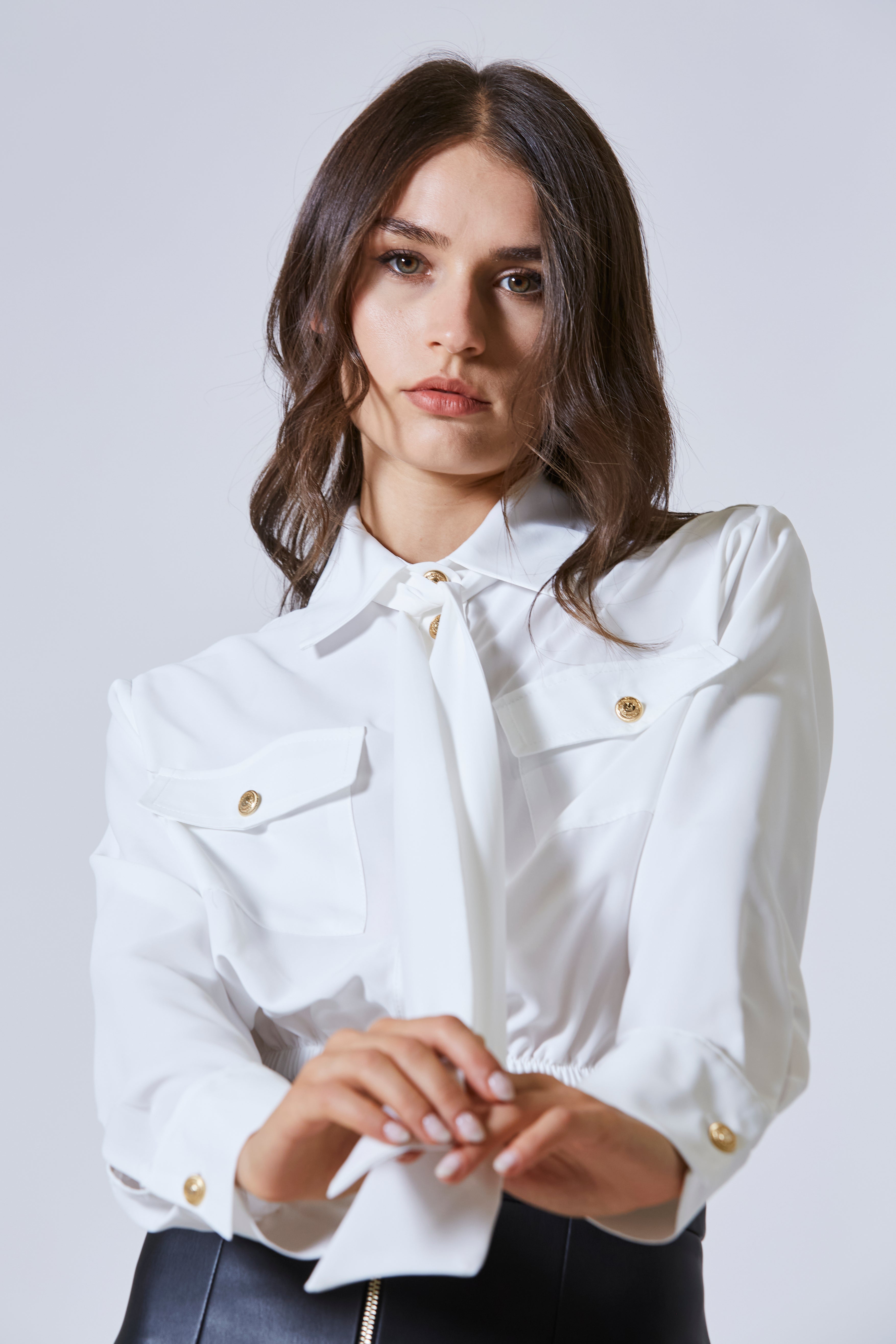 Ma il vero colpo di scena è al collo: un foulard applicato, in tono o a contrasto, morbido e leggermente annodato, che scivola con eleganza lungo il décolleté o si lascia avvolgere come un accessorio couture. È il dettaglio che trasforma la camicia in qualcosa di più: un gesto di stile, una firma, un vezzo elegante che richiama le passerelle ma si lascia indossare ogni giorno.