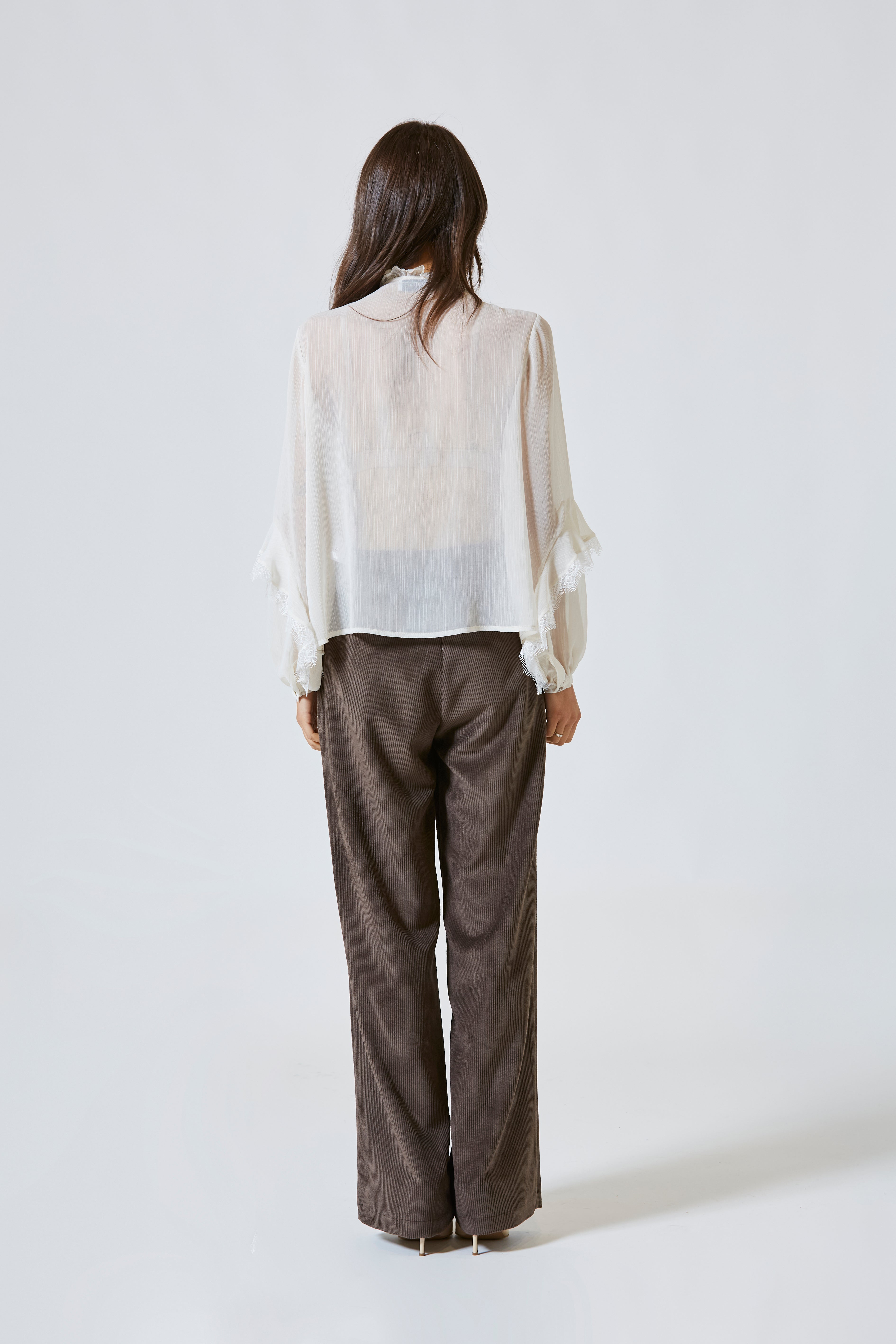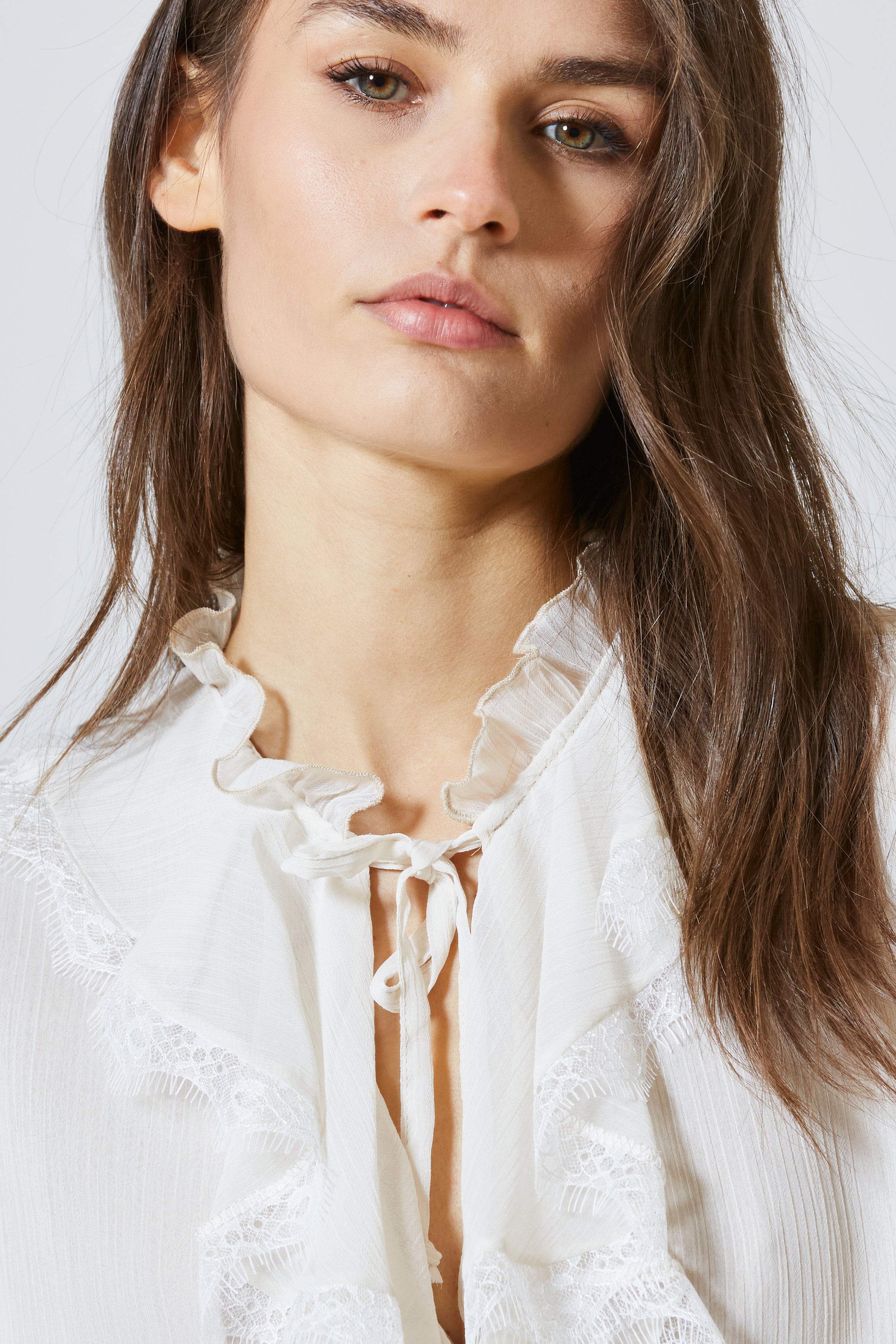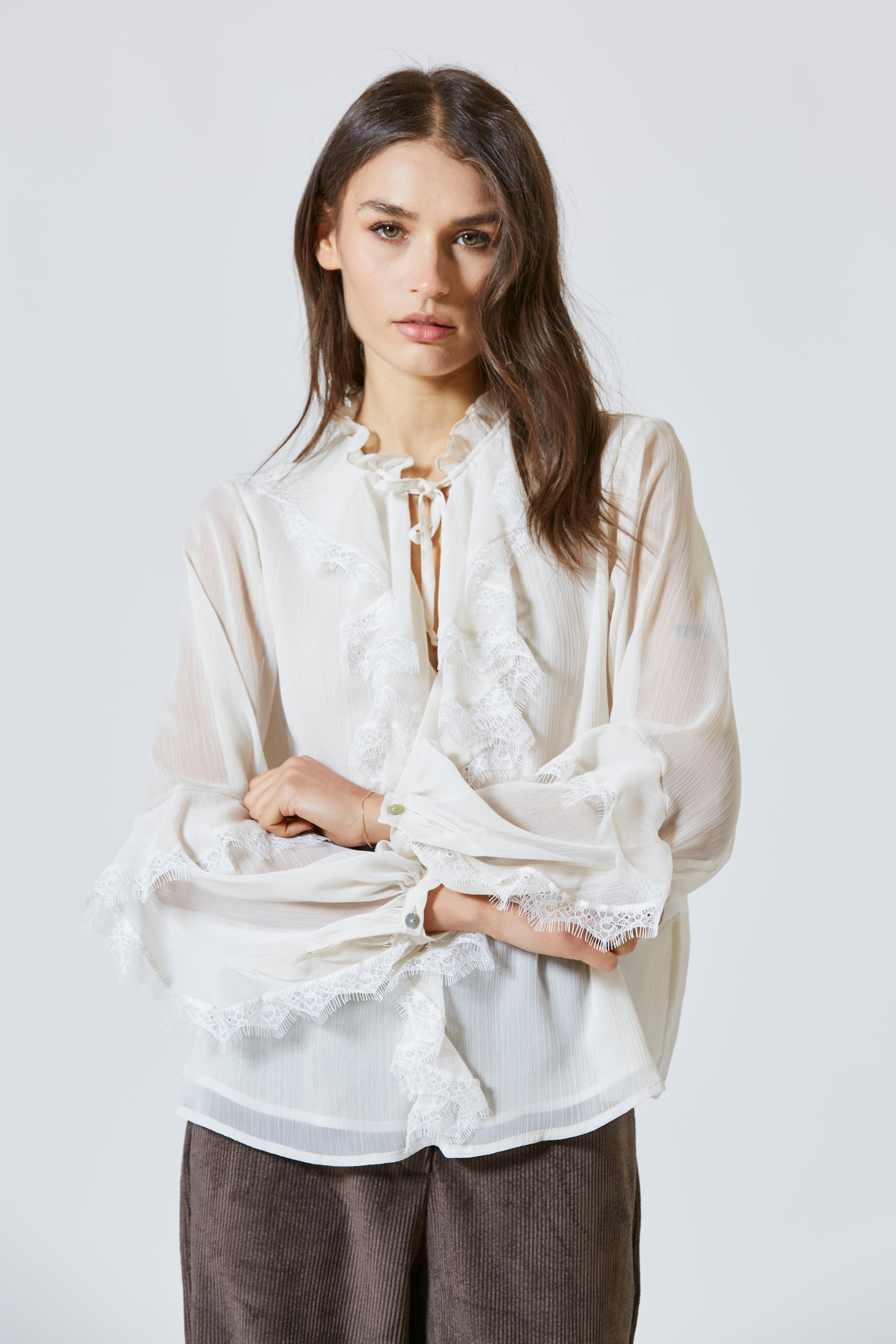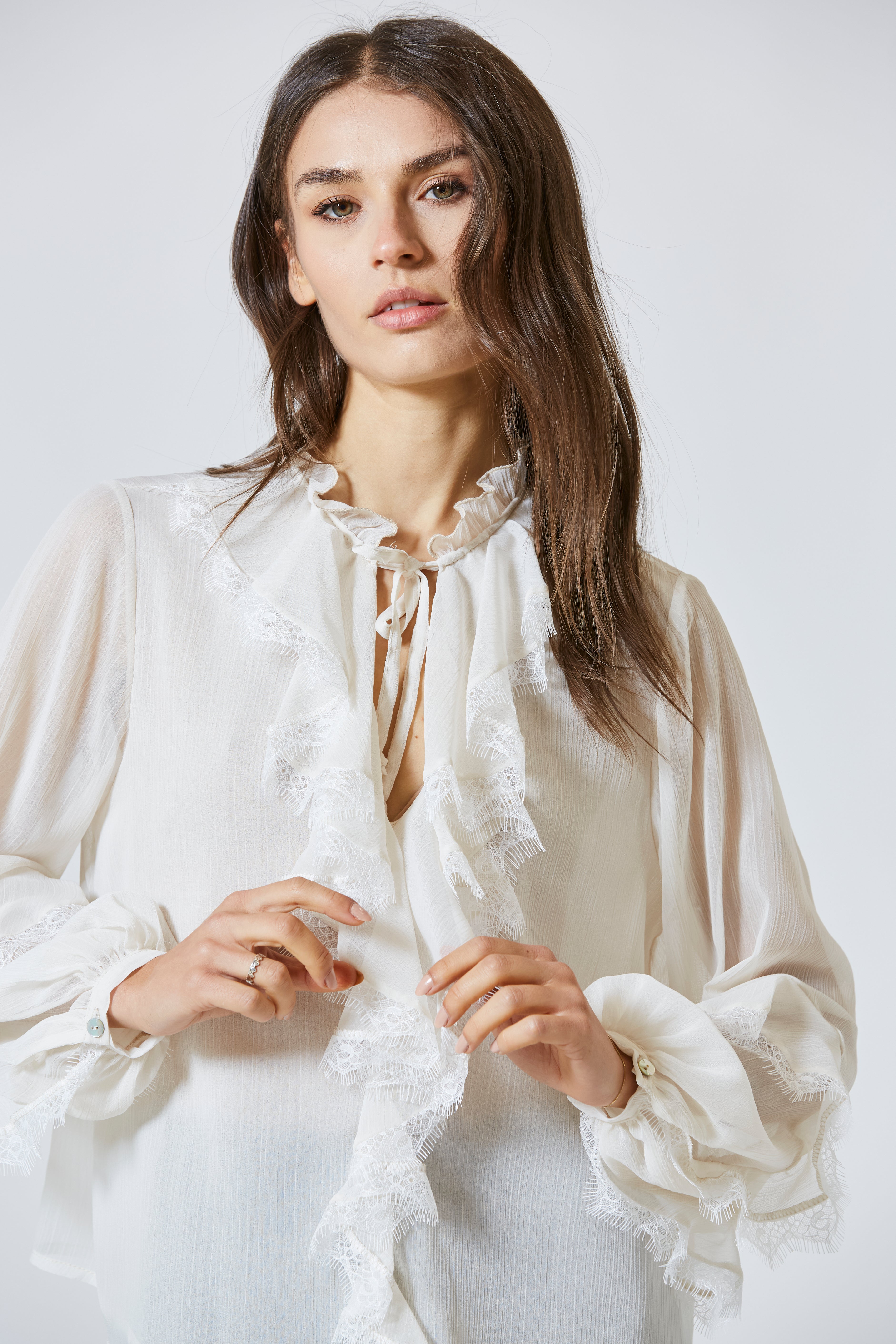 Indossare la casacca con rouches e pizzo significava sentirsi femminili e forti, leggere ma sicure, sofisticate con spontaneità. Era un capo che non chiedeva di essere notato: lo diventava da sé, con la dolcezza dei suoi dettagli e la poesia della sua costruzione.