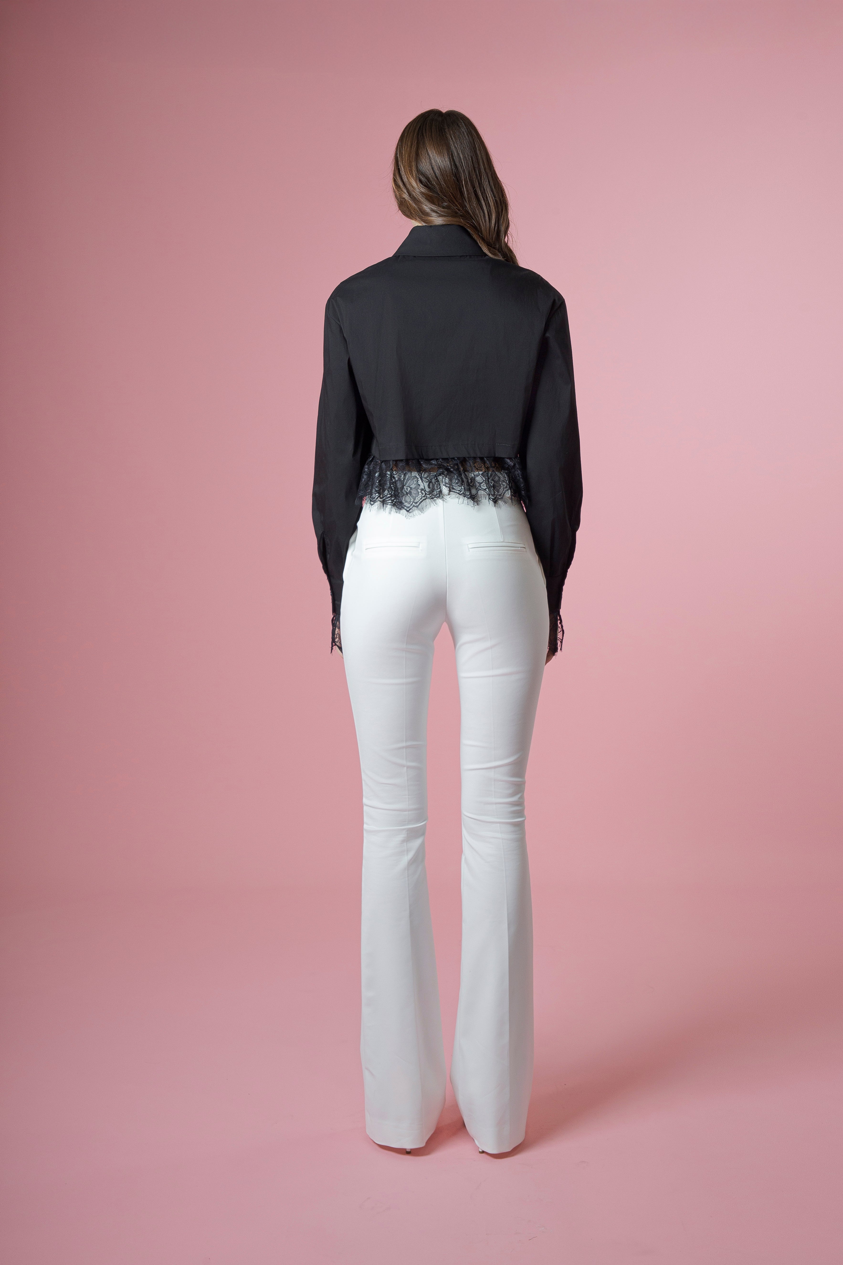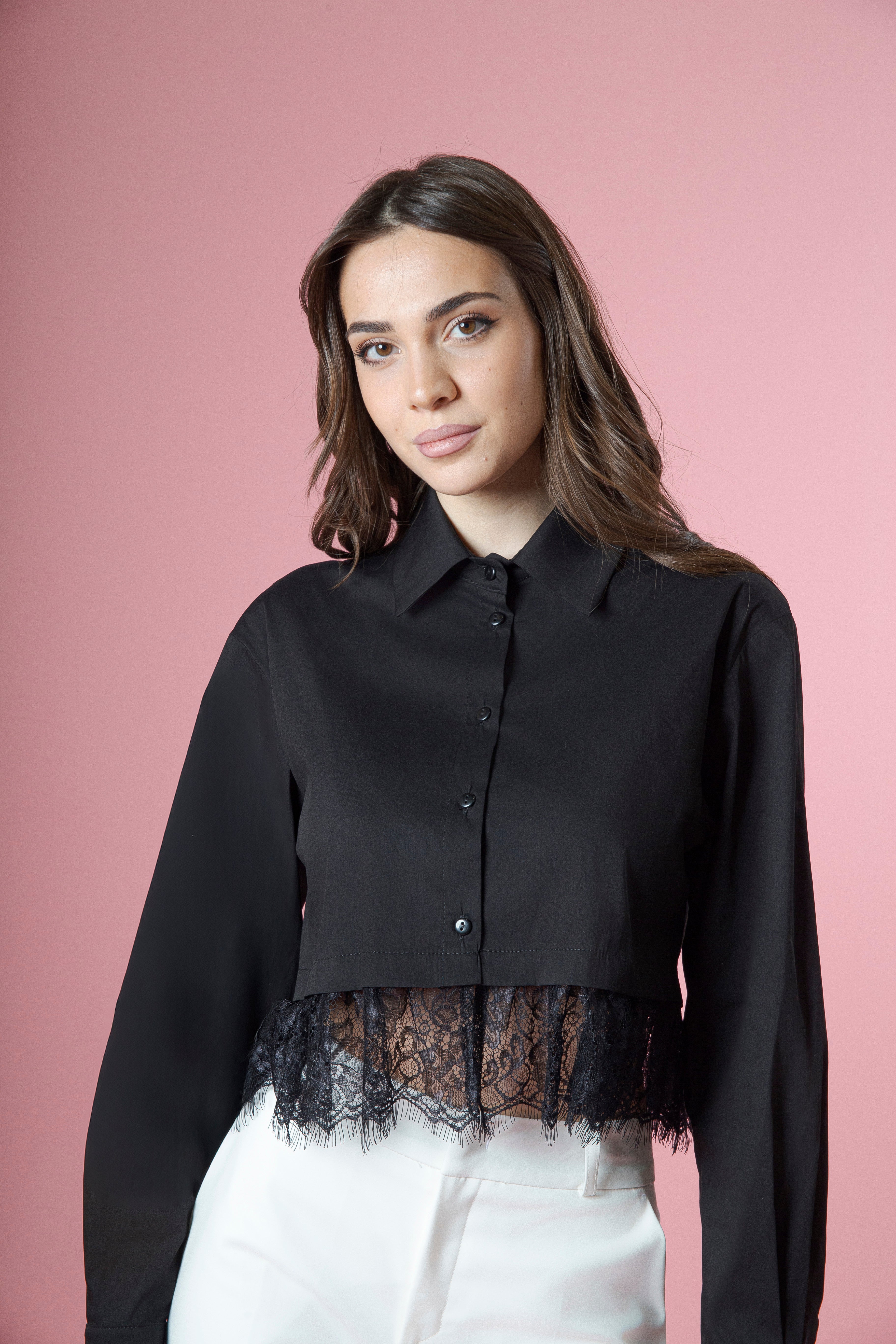 Leggera, romantica e ricca di dettagli raffinati, la camicia crop in cotone con balza in pizzo sulla vita diventa ancora più preziosa grazie al pizzo applicato anche sui polsi.