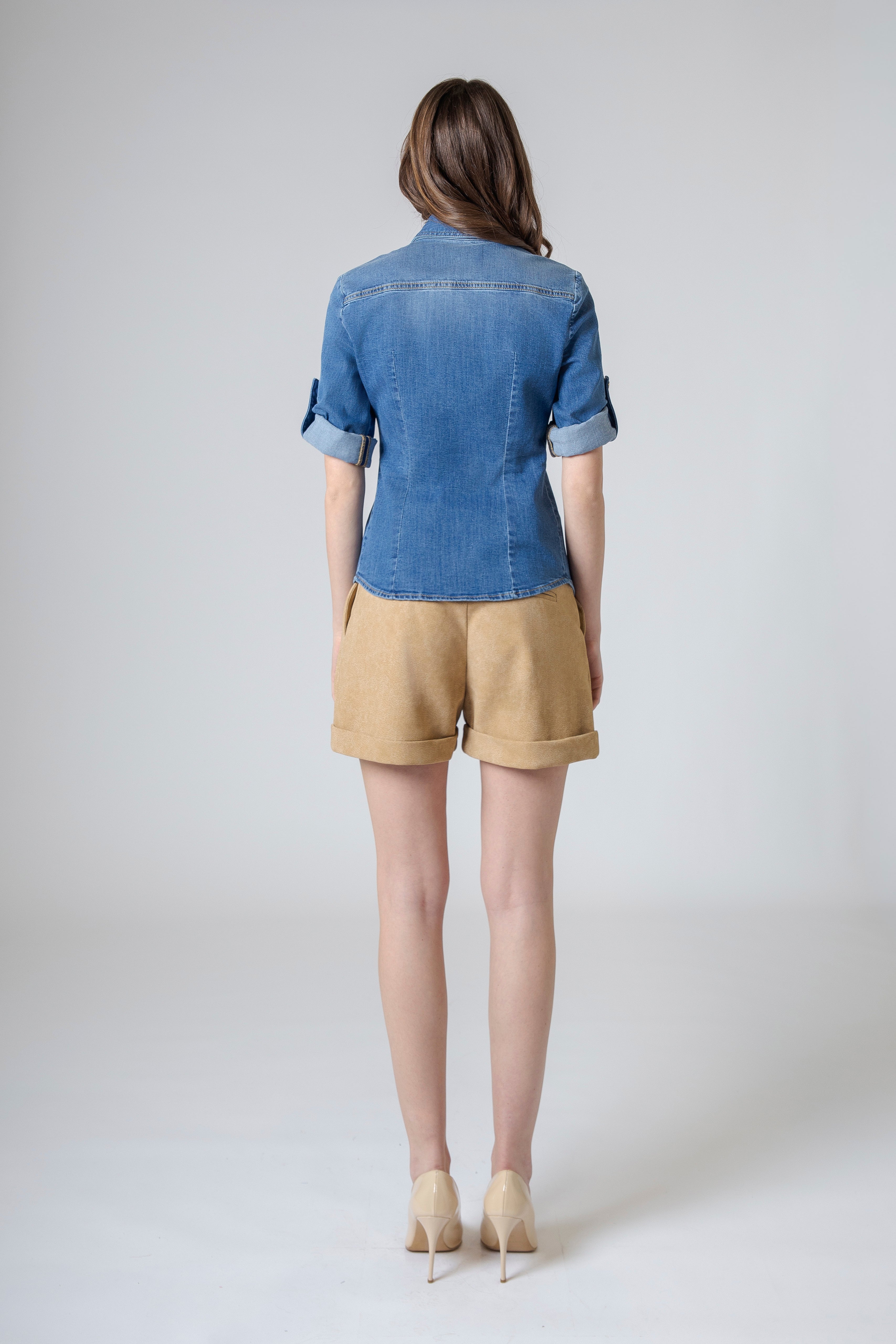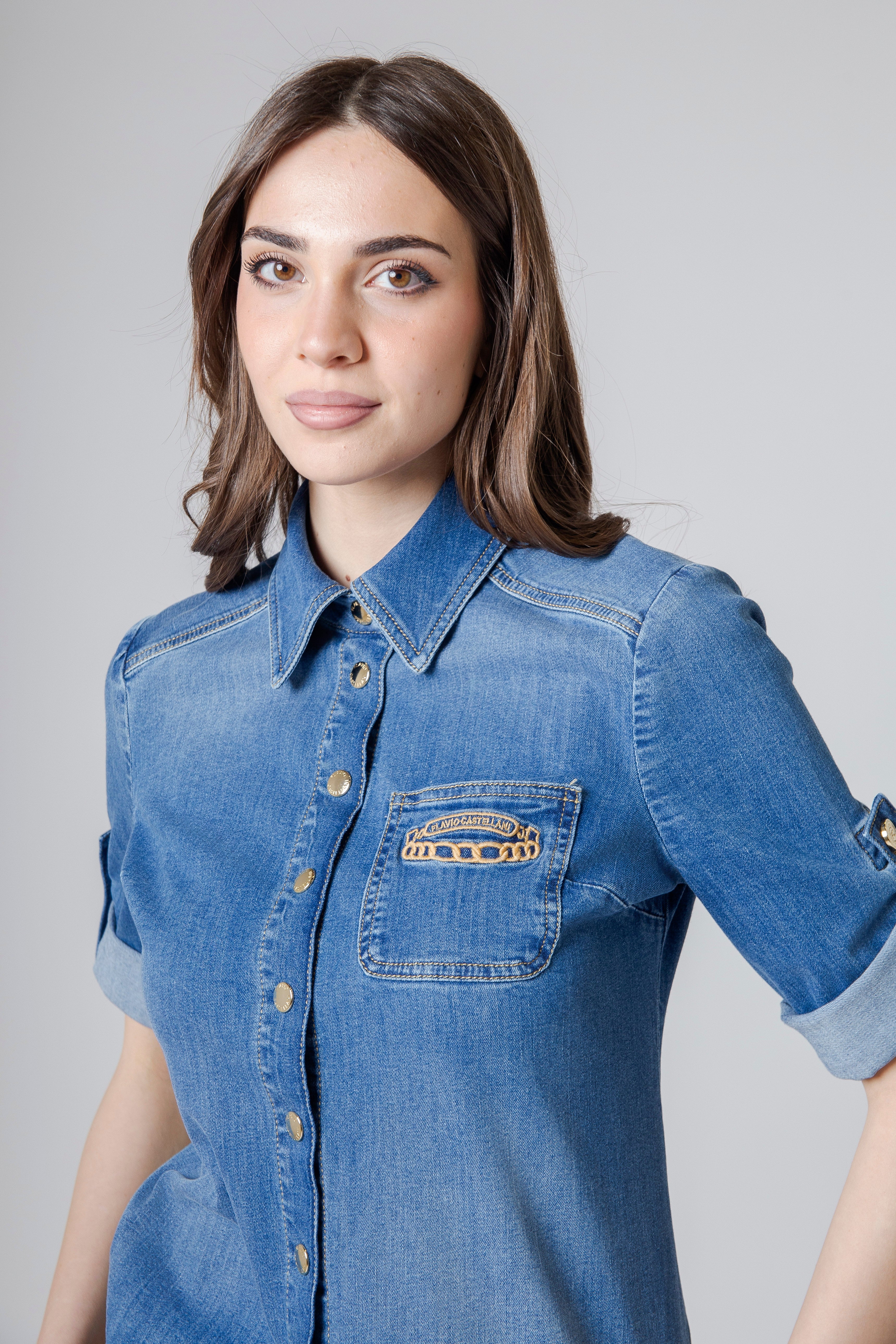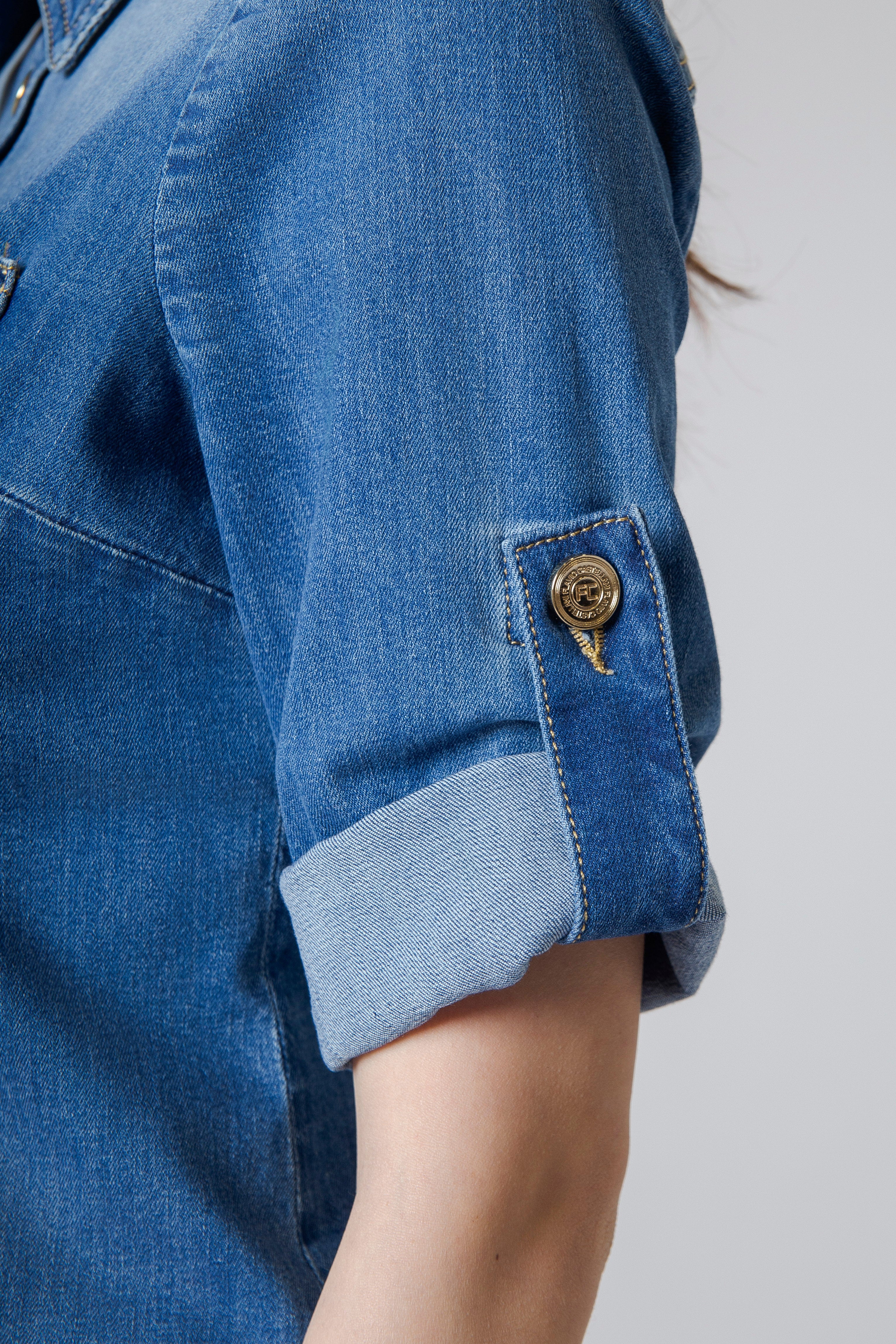 A completare la camicia troviamo la chiusura frontale con bottoni oro a clip, un dettaglio luminoso che dona al capo un tocco prezioso e contemporaneo. I bottoni dorati si aprono e si chiudono con un gesto semplice e deciso, aggiungendo al design una nota sofisticata che contrasta elegantemente con la naturalezza del jeans.