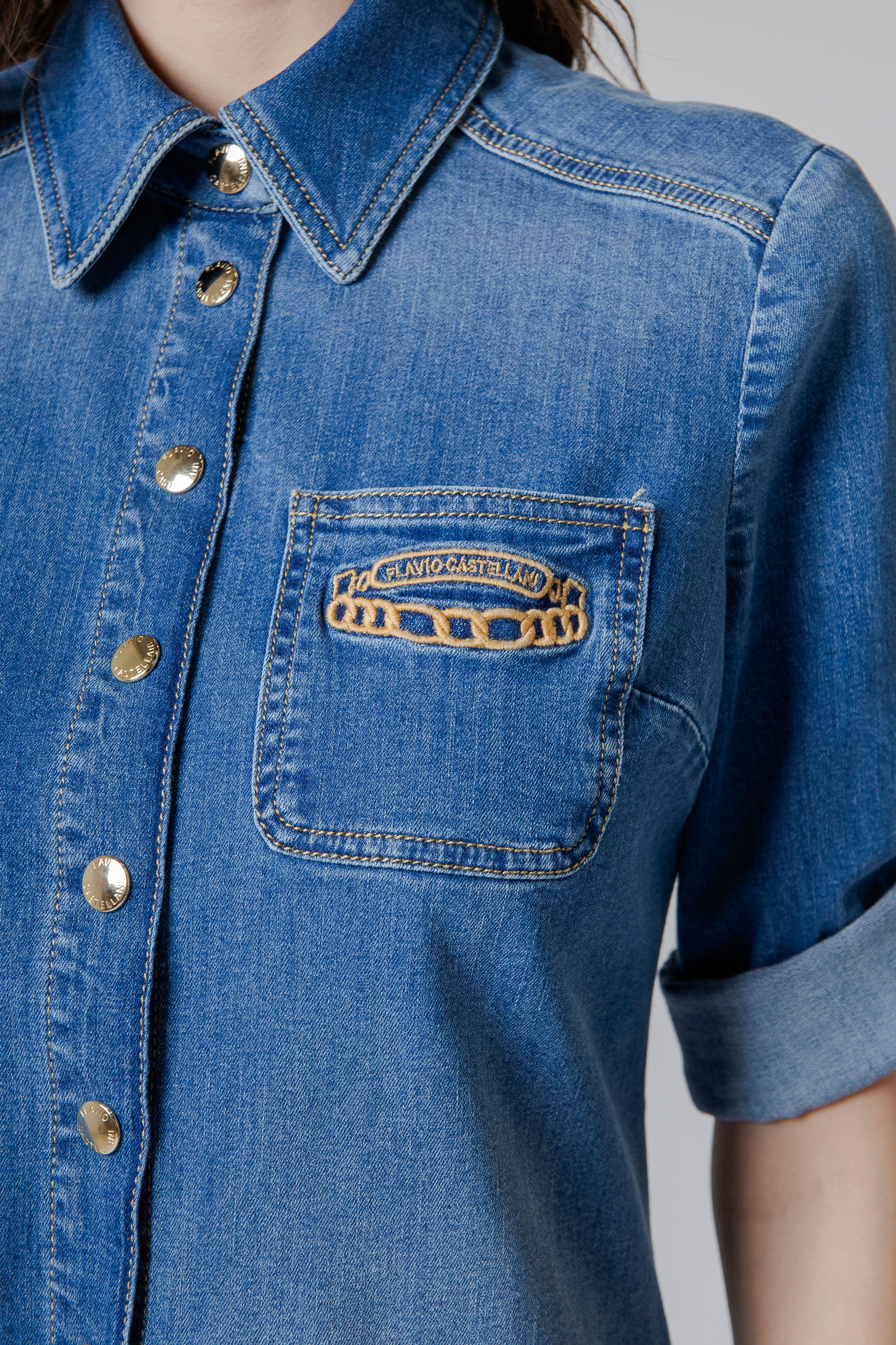 Il risultato è una camicia di jeans dal carattere autentico e raffinato: un capo che conserva l’anima libera e senza tempo del denim, arricchita però da dettagli preziosi come il ricamo personalizzato sulla tasca e i bottoni oro a clip, capaci di raccontare una storia di stile contemporaneo, femminile e distintivo.