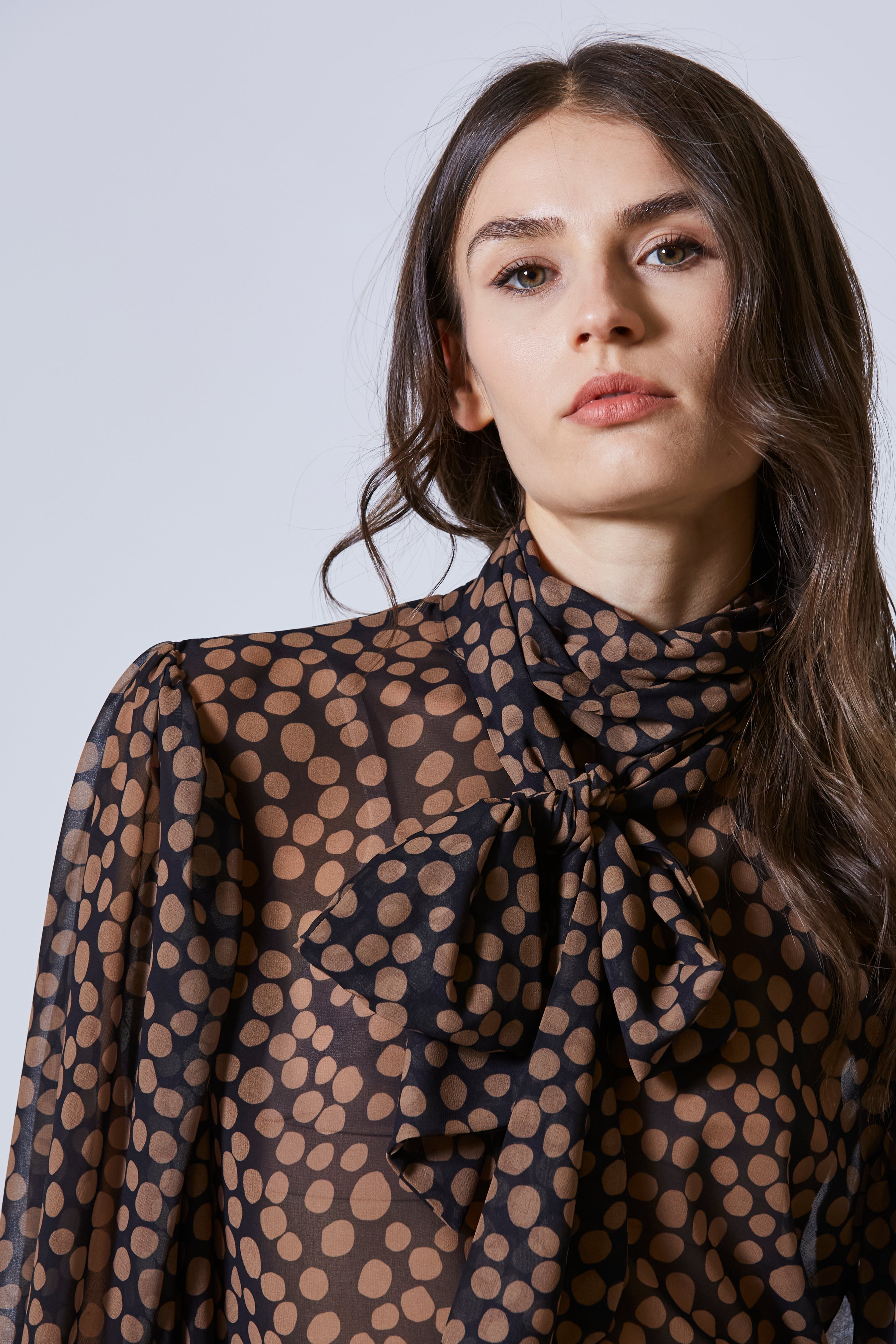 La linea della casacca è morbida, fluida, pensata per scivolare sul corpo senza costringerlo, donando libertà e grazia a ogni movimento. Ma è il fiocco al collo a catturare subito l’attenzione: morbido, vezzoso, da annodare a piacere. Può essere lasciato sciolto per un effetto più rilassato, oppure stretto in un nodo perfetto per evocare quell’allure rétro che non smette mai di sedurre.