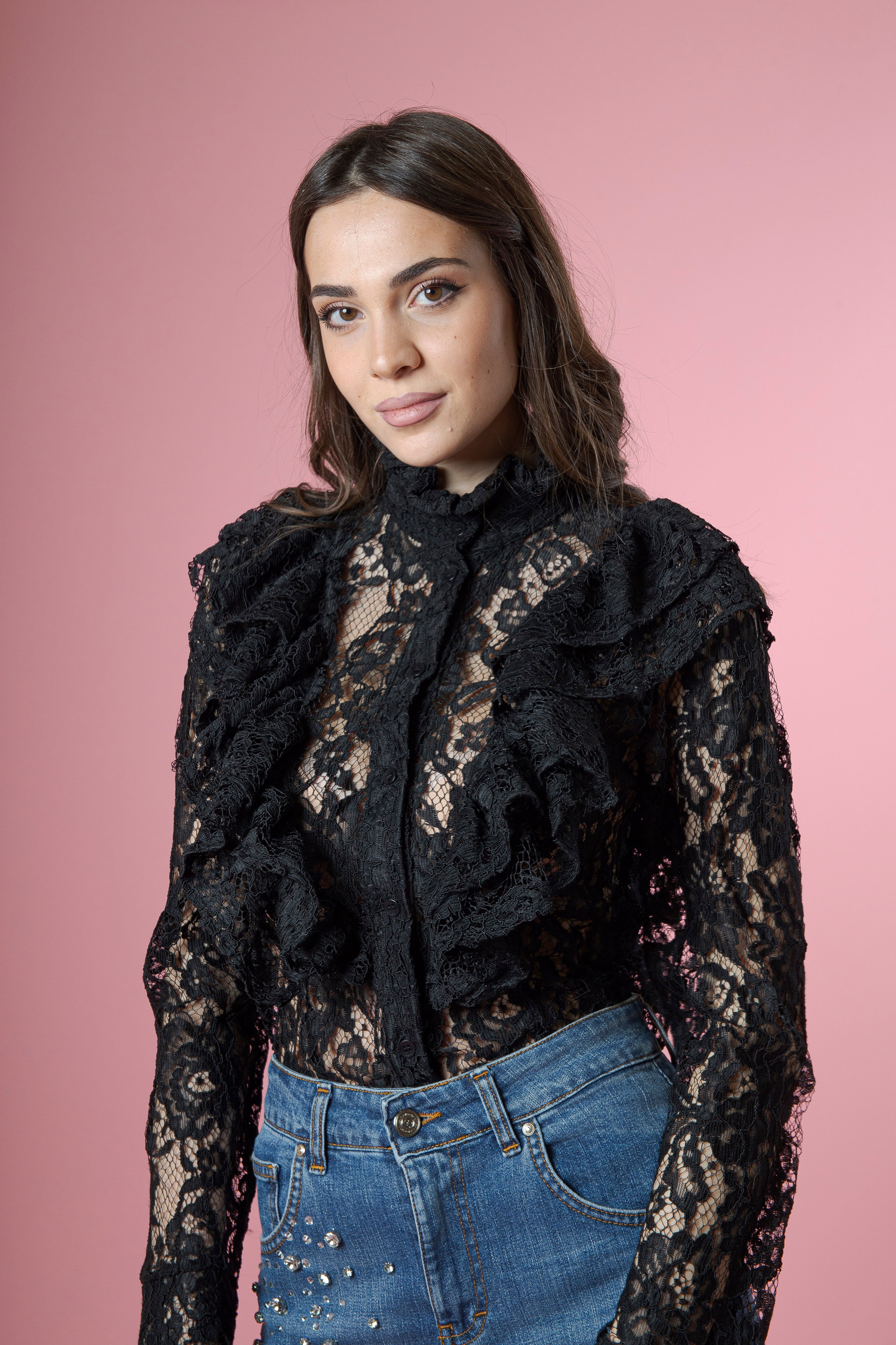 Una camicia che sembra nata dalla leggerezza di una nuvola e dalla pazienza di mani sapienti: pizzo finissimo, intessuto come un giardino segreto di trame e trasparenze, dove ogni dettaglio vibra di femminilità e delicatezza. La luce vi scivola dentro e ne esce trasformata, come se il tessuto avesse il potere di filtrare il mondo e restituirlo più morbido, più poetico.