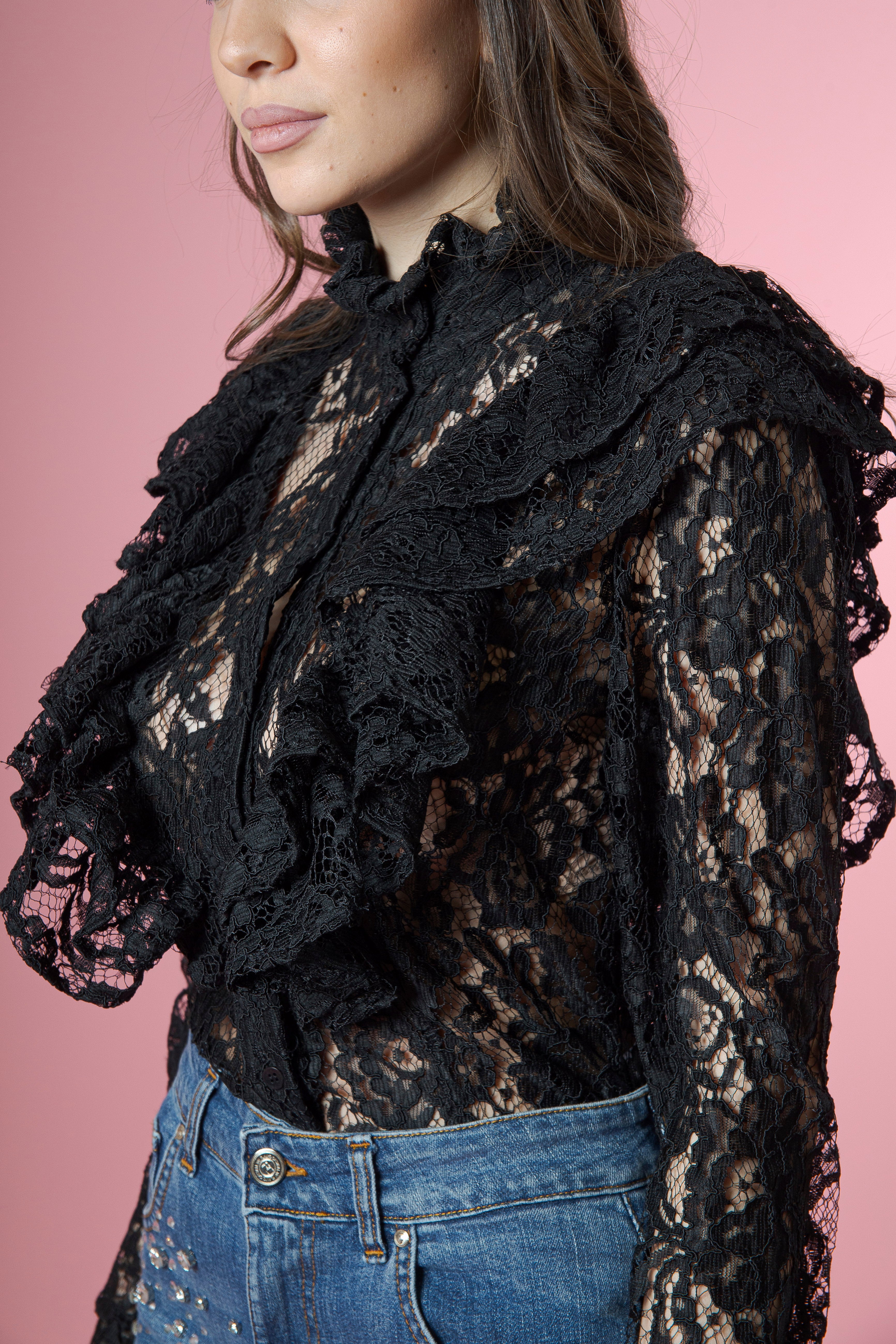 Sul davanti, ad accendere l’eleganza con un tocco scenografico, si apre una gala fluente: un movimento di stoffa che ricade come un piccolo cascata, onde morbide che sfiorano il busto e aggiungono un ritmo romantico al capo. È un dettaglio che respira, che si muove con la donna, che conferisce alla camicia un’allure teatrale senza mai risultare eccessiva.