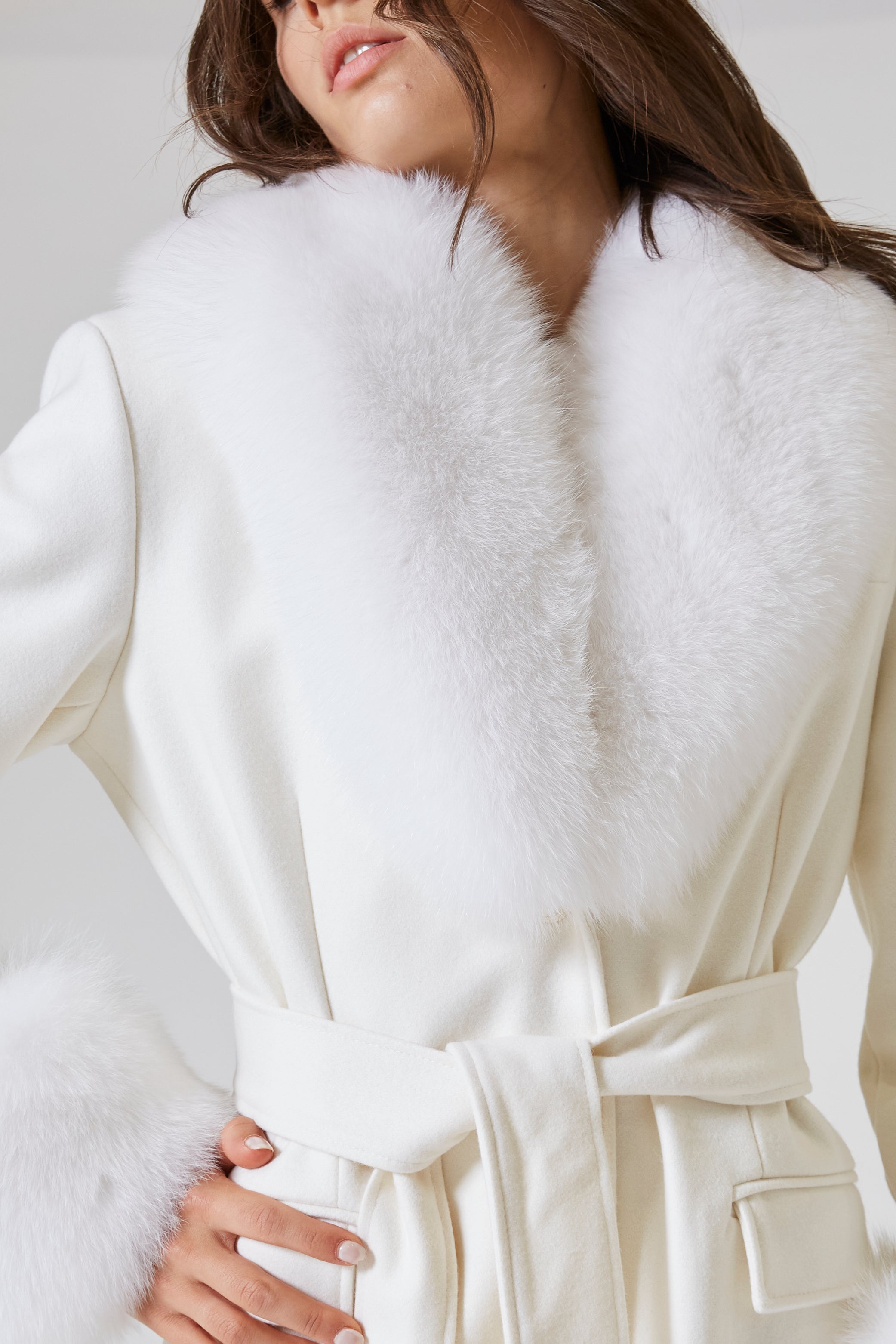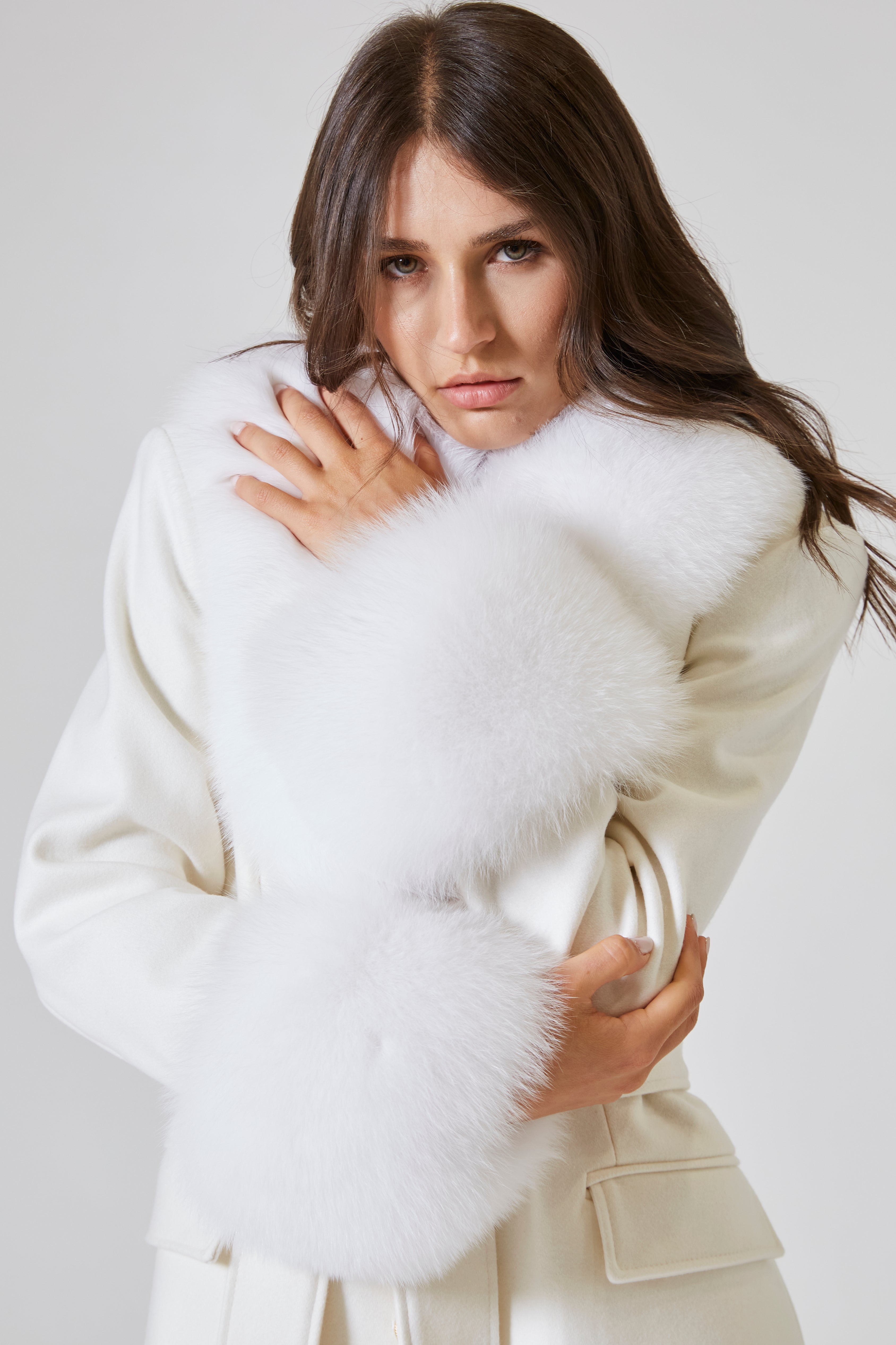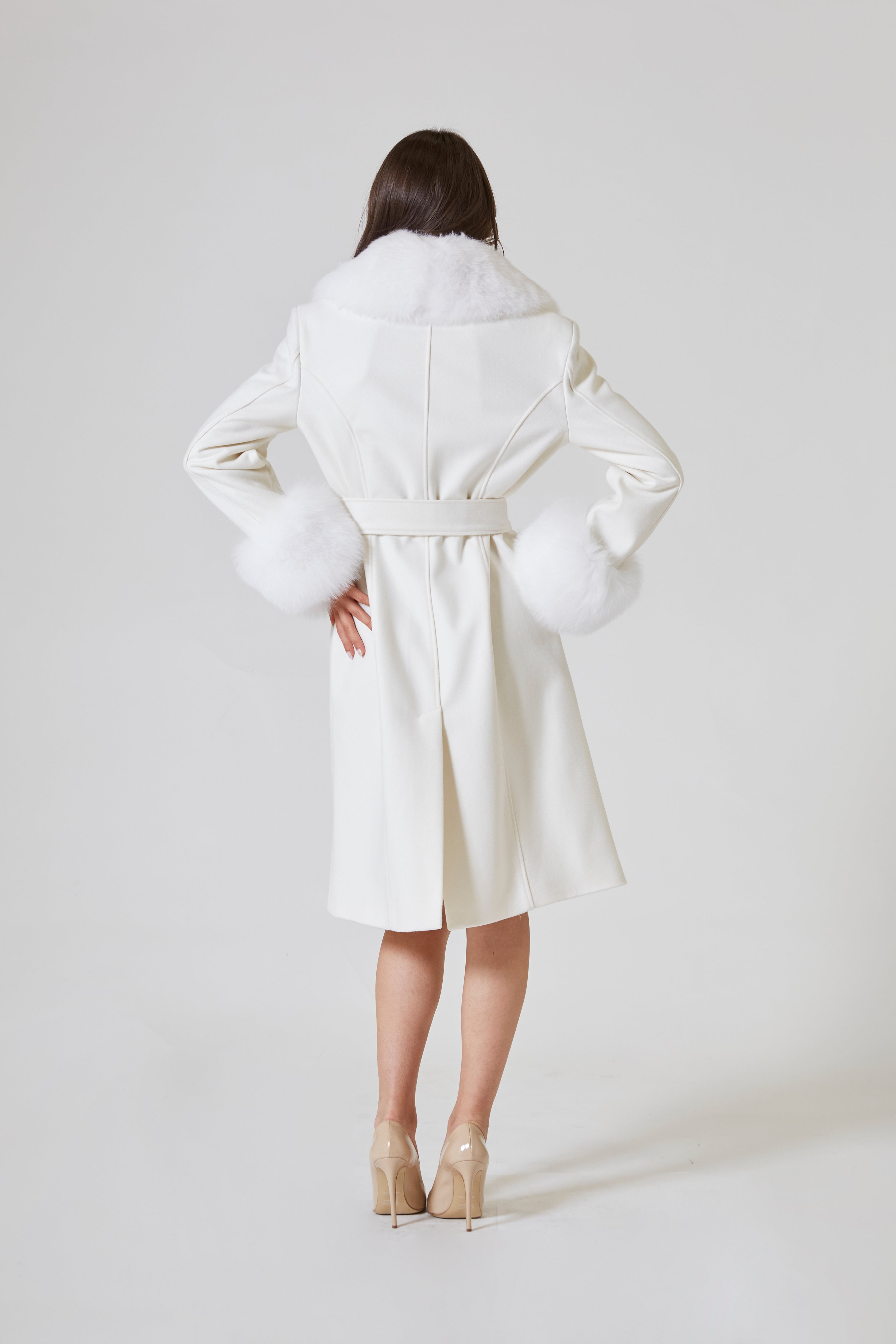 Ogni volta che il cappotto si apre e si chiude con il suono di un bottone cesellato con una cura infinita, è come se il tempo si fermasse. La pelliccia che adorna il reverse sembra essere stata scelta non solo per scaldare, ma per proteggere il cuore di chi lo indossa. È un gesto di lusso, ma mai ostentato, come un abbraccio che ti avvolge senza preavviso, delicato ma potente. La pelliccia scivola sulle spalle, una carezza che sfida il freddo, che rende ogni movimento più lento, più raffinato, come se il cappotto avesse il potere di rallentare il battito del cuore.