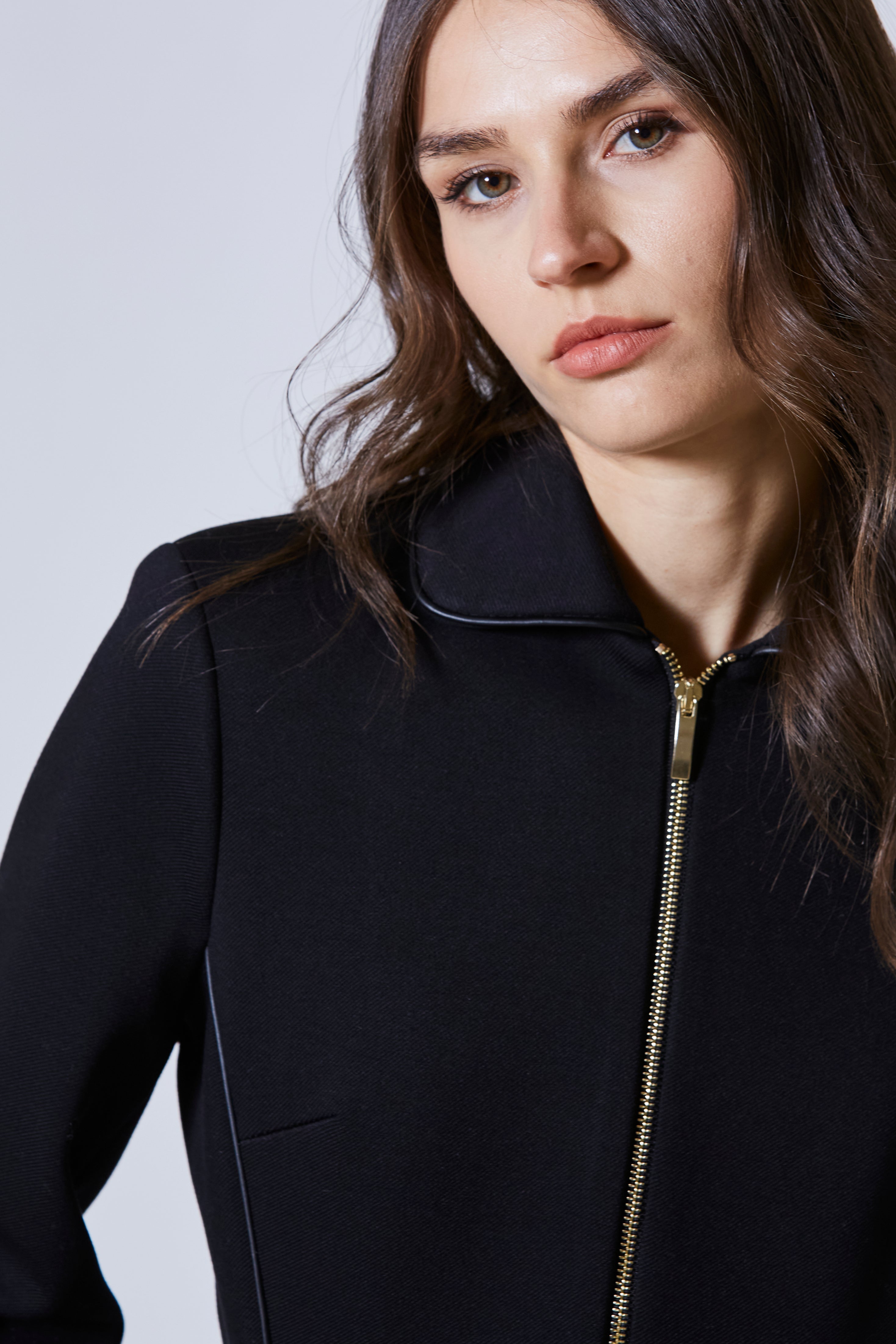 La zip — lineare, discreta, quasi mimetica — corre dritta lungo il centro del capo come una spina dorsale metallica. Niente bottoni appariscenti, nessuna complicazione. Solo una chiusura netta, decisa, che si apre e si chiude con la sicurezza di chi sa dove vuole andare. È un gesto che basta a se stesso: tirare su la zip, sentirla chiudersi con un suono secco e pulito, è come sigillare un momento, un pensiero, un’intenzione.