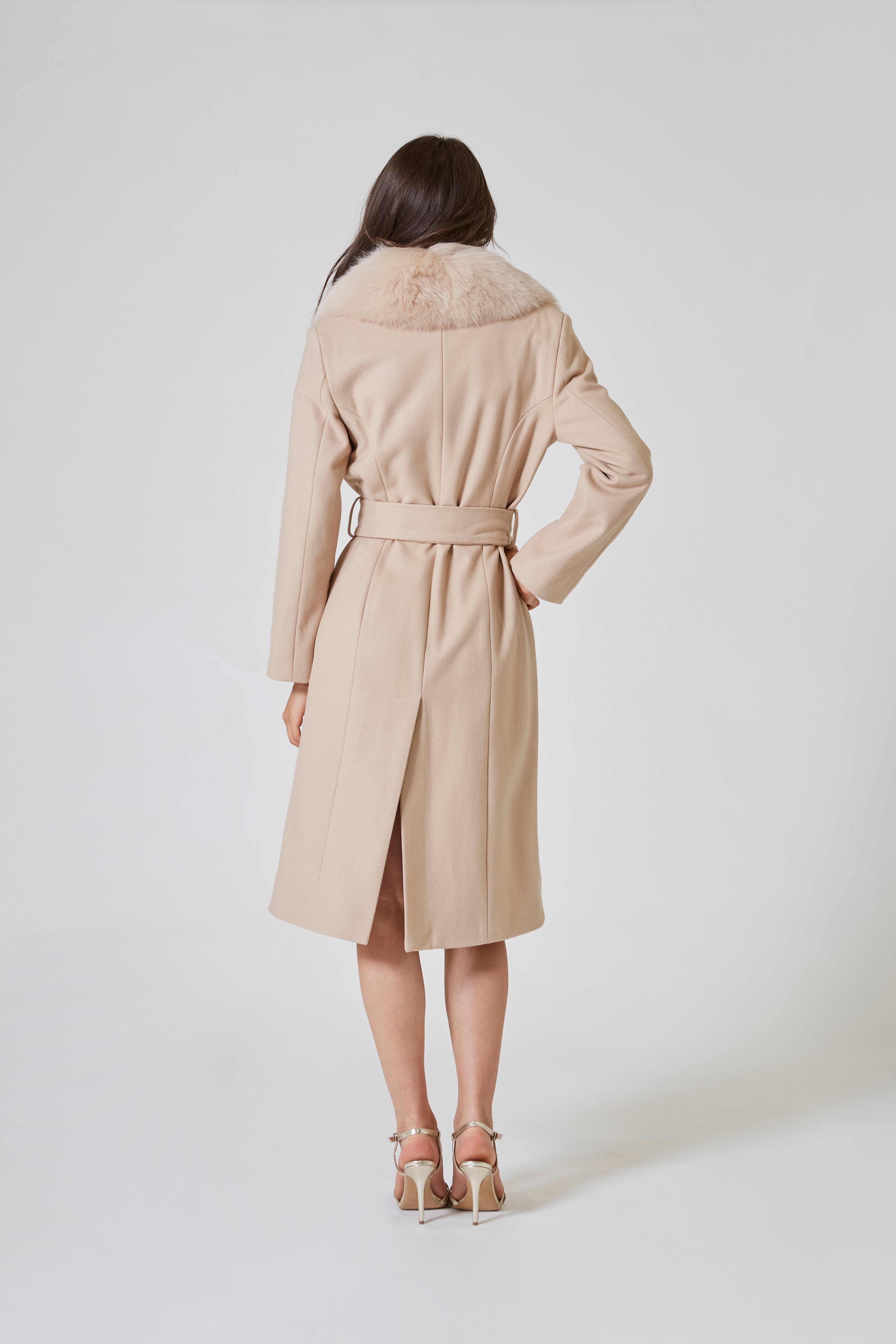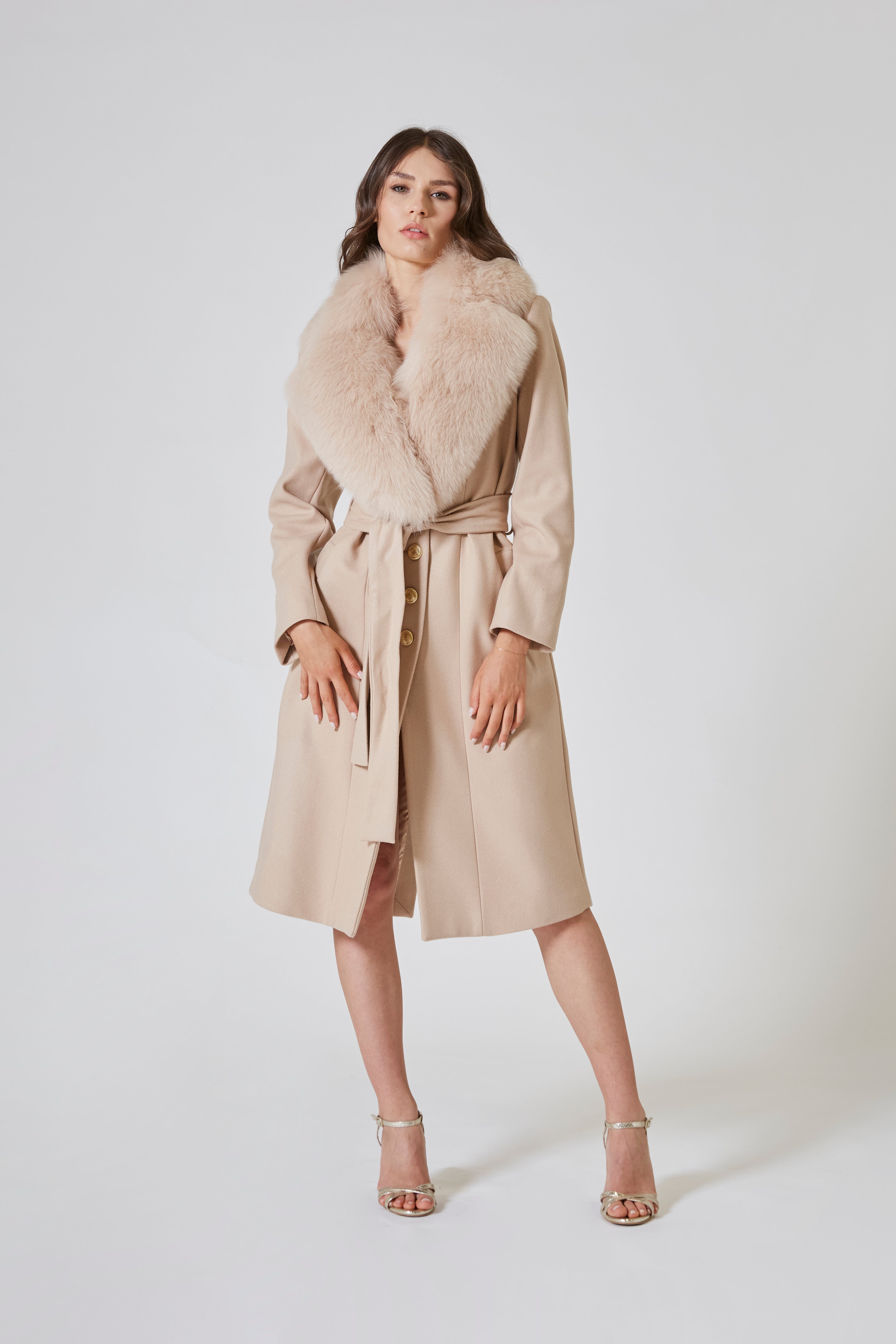 Il collo, che si ergeva alto e fiero, sembrava una torre che custodiva il mistero della bellezza più pura. Lì, dove il vento dell'inverno si infrangeva, il cappotto rivelava il suo segreto: un reverse di pelliccia che scivolava come una carezza preziosa. Morbida, lucente, quasi sussurrante, la pelliccia era come un bacio che si faceva strada tra il freddo, promettendo calore e tenerezza in ogni istante. Era un invito a lasciarsi avvolgere dalla bellezza, a farsi cullare dal lusso senza mai esserne sopraffatti.