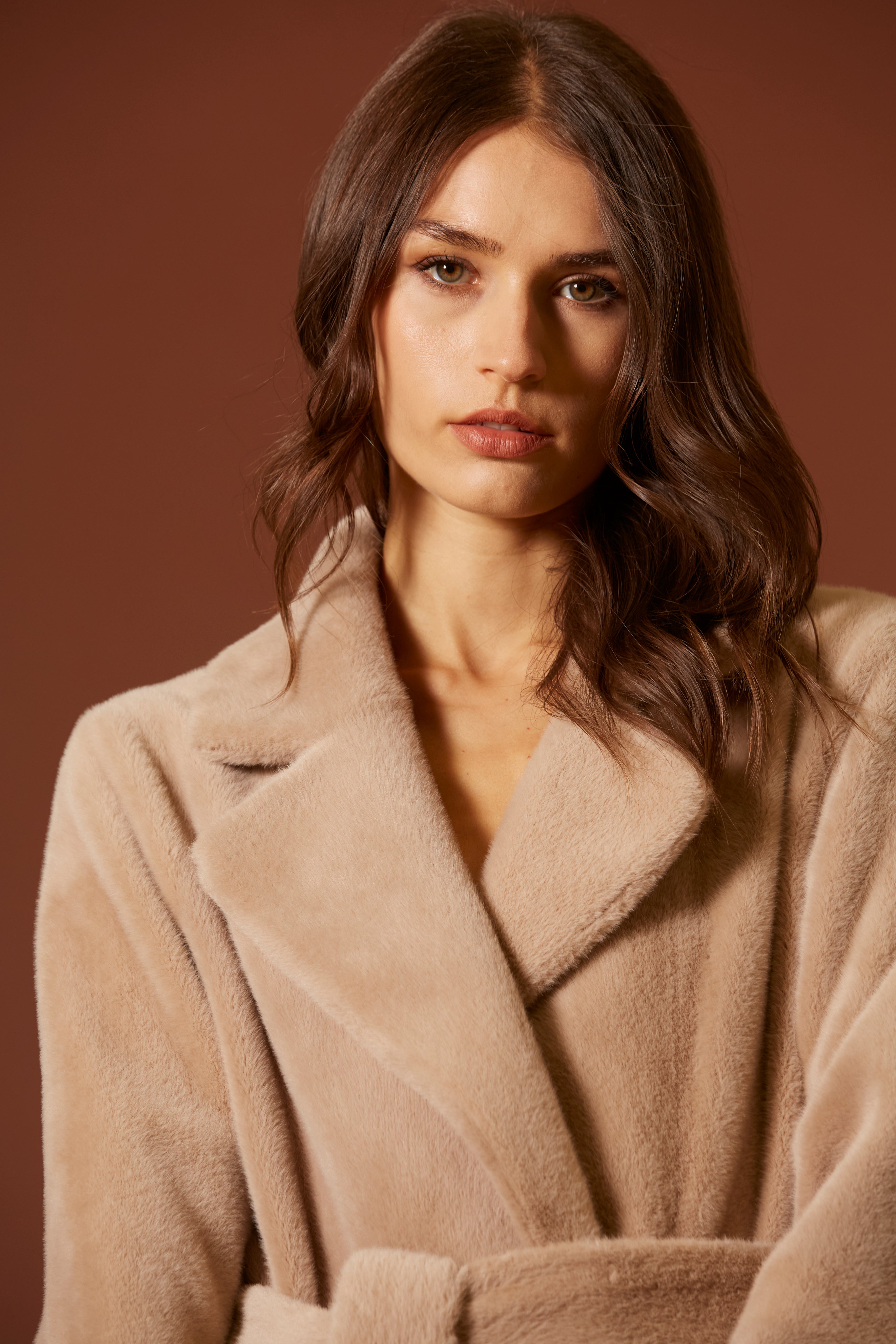 A segnare la vita, una fusciacca anch’essa in ecopelliccia. Non un accessorio, ma un’estensione del capo stesso, un gesto morbido che stringeva senza costringere, come una frase detta sottovoce per cambiare il senso di tutto. Bastava annodarla e la silhouette cambiava, si scolpiva, prendeva direzione.