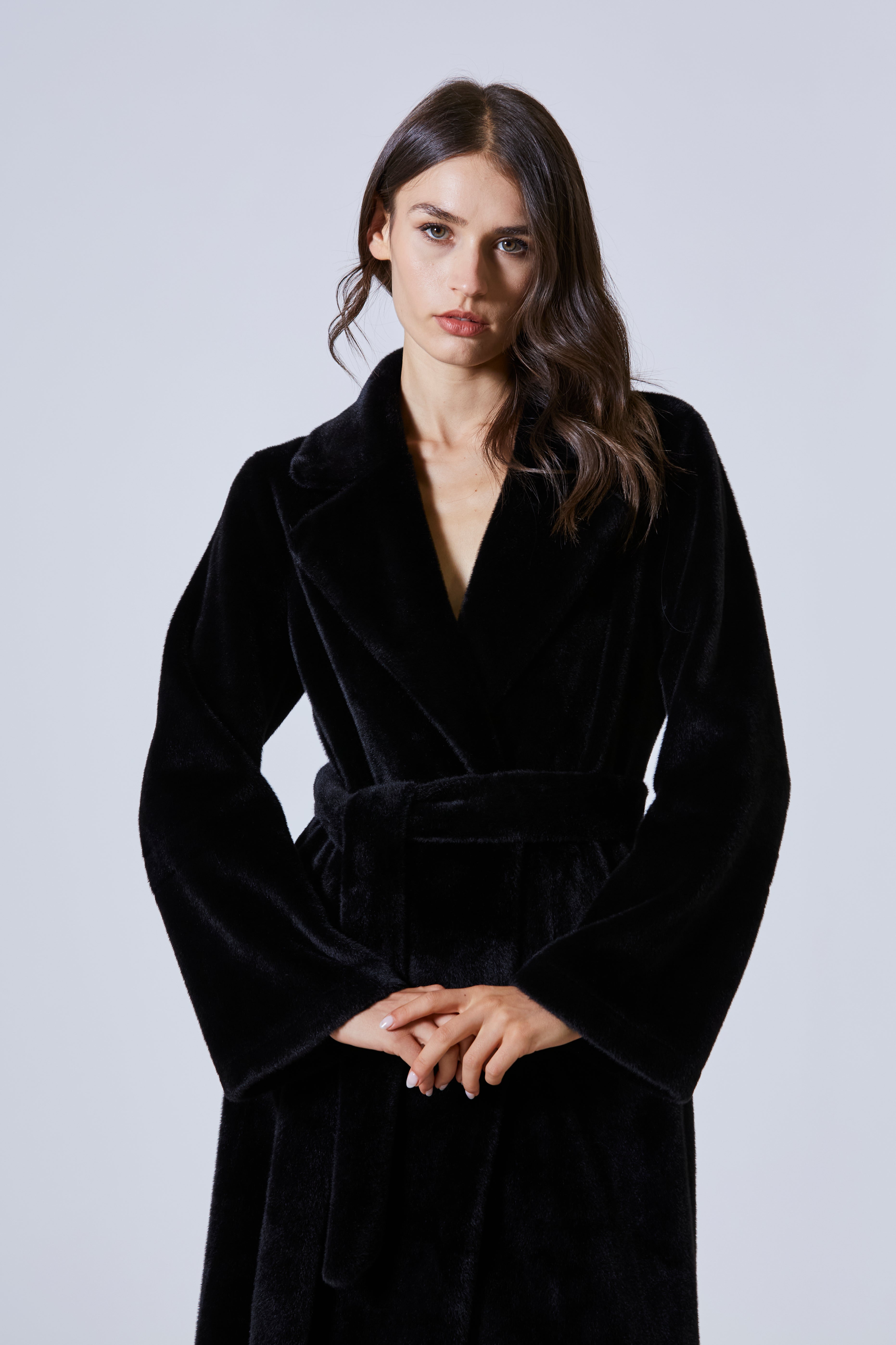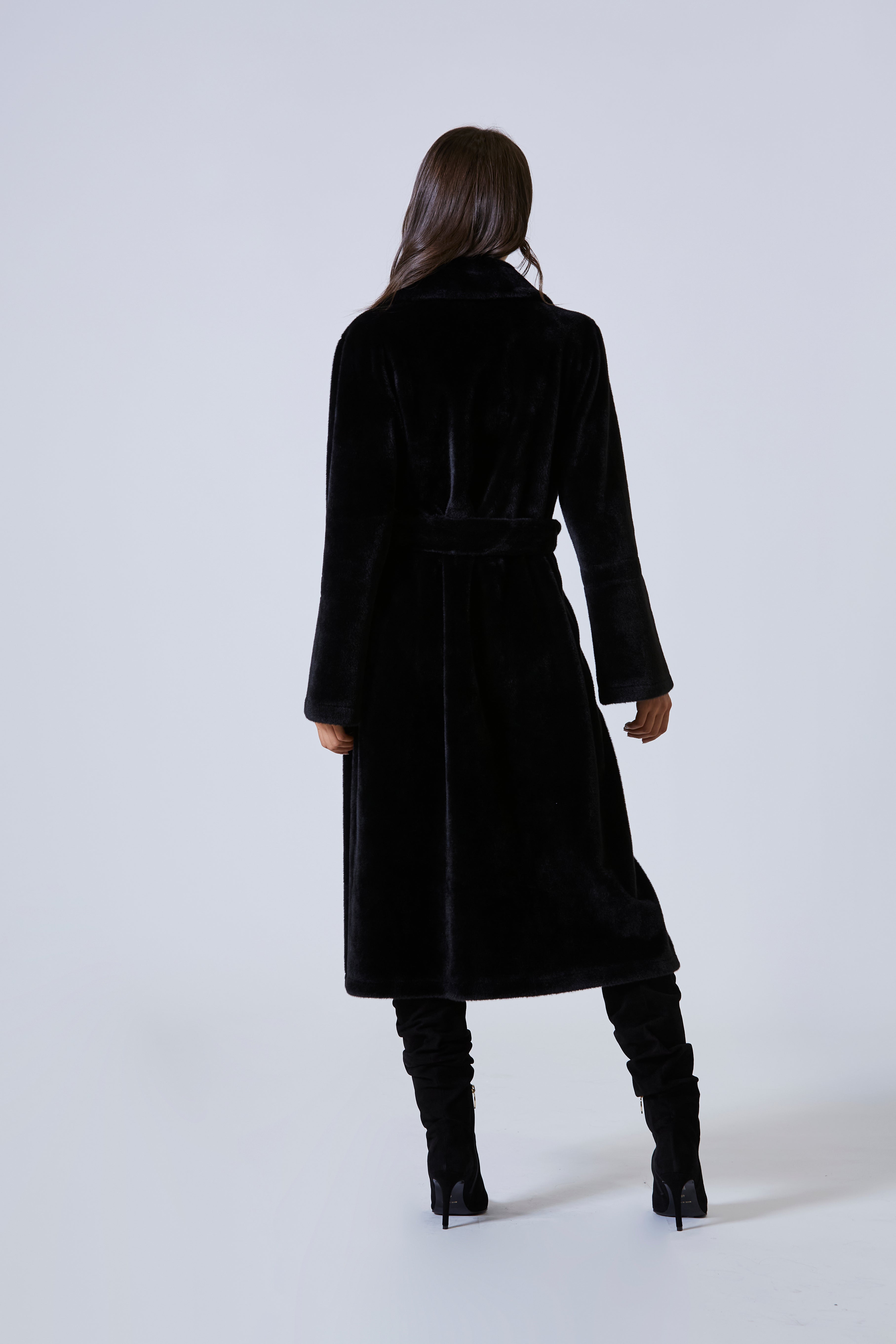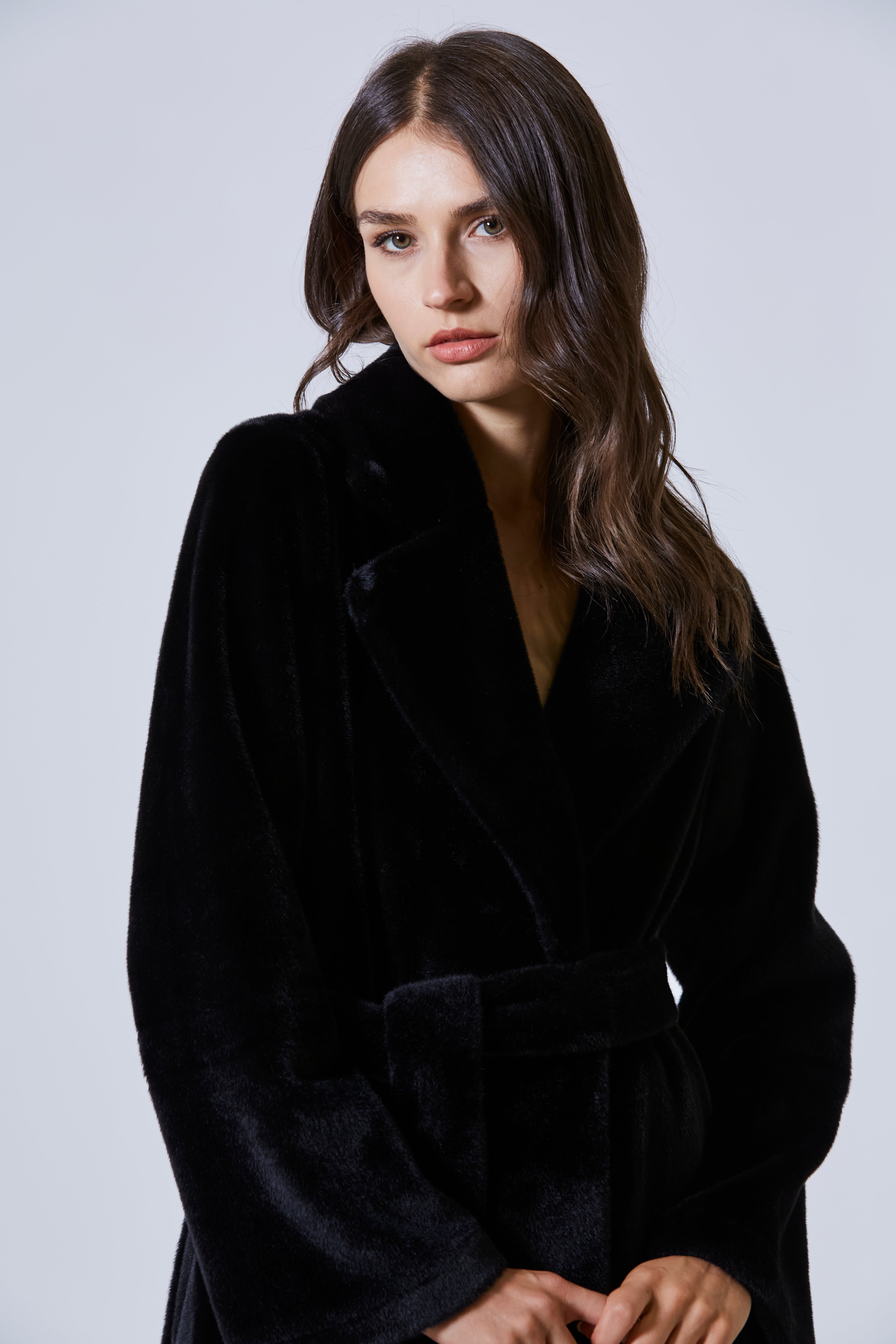 A segnare la vita, una fusciacca anch’essa in ecopelliccia. Non un accessorio, ma un’estensione del capo stesso, un gesto morbido che stringeva senza costringere, come una frase detta sottovoce per cambiare il senso di tutto. Bastava annodarla e la silhouette cambiava, si scolpiva, prendeva direzione.