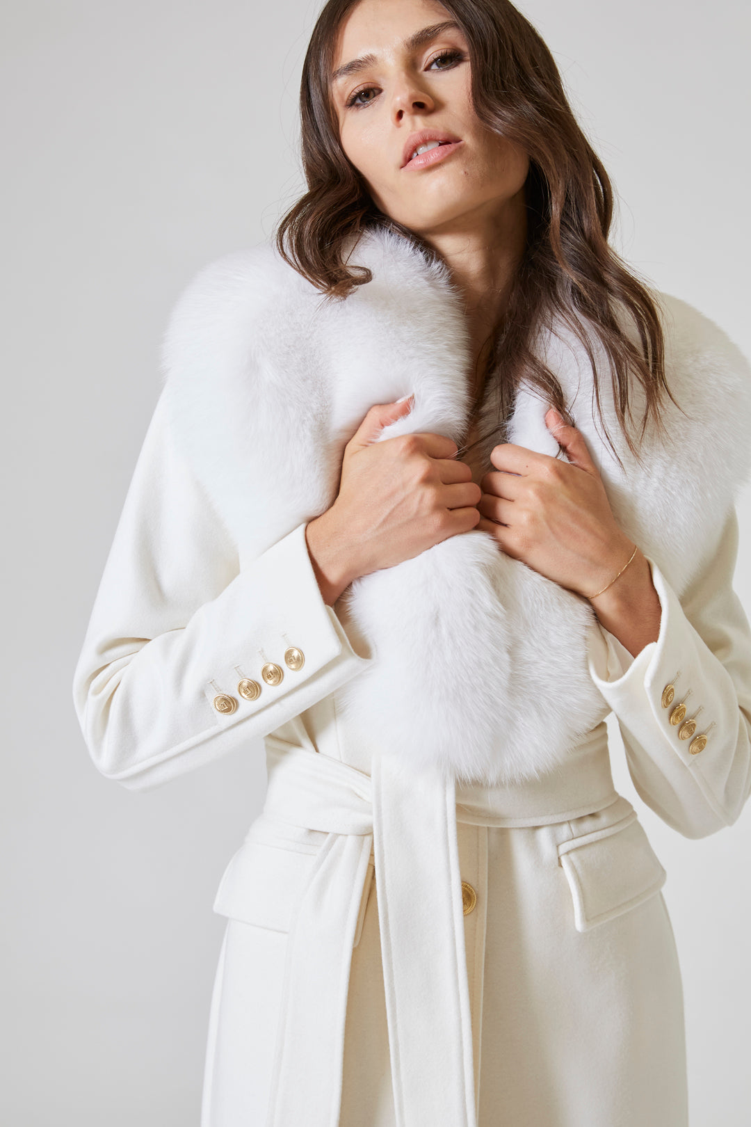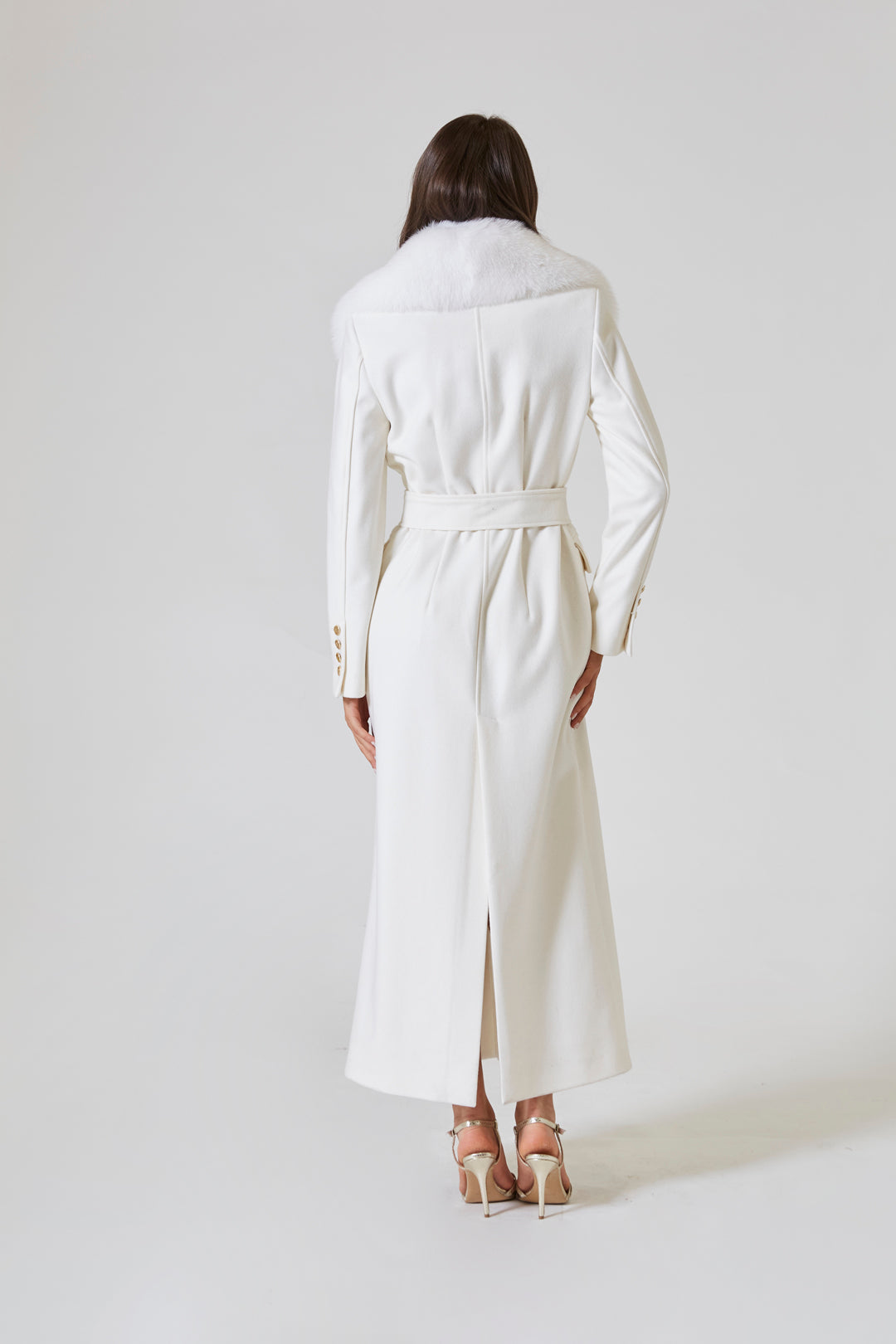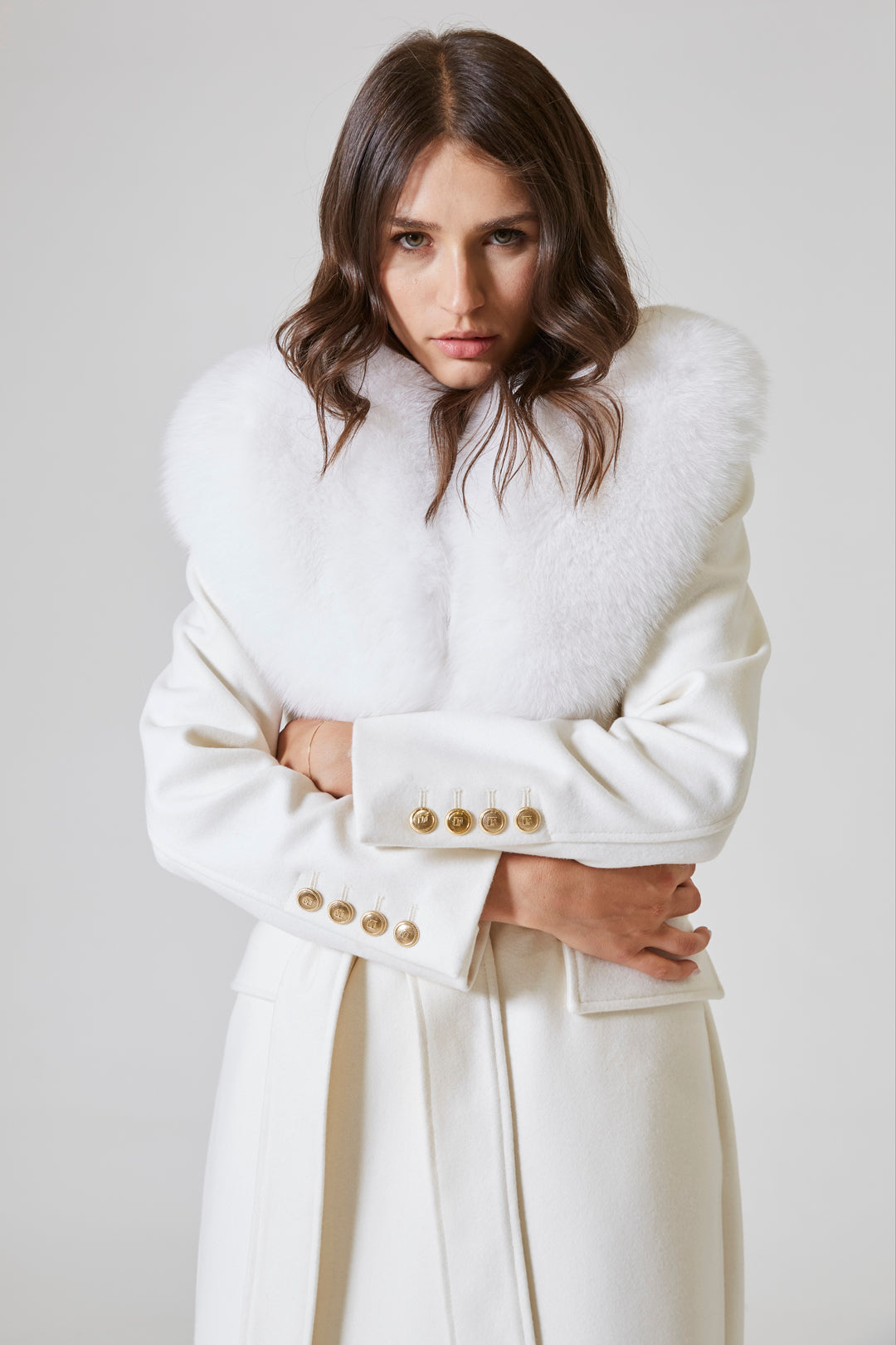 Ma ciò che rende questo cappotto davvero unico è il suo collo, un reverse di pelliccia che emerge come un capolavoro di morbidezza e raffinatezza. La pelliccia, come un bacio delicato, accarezza le spalle e il collo, offrendo una protezione che è al contempo calda e preziosa. È come se ogni fibra di pelliccia fosse stata cucita con l’intenzione di donare non solo calore, ma anche un tocco di lusso inconfondibile. La sua lucentezza sembra danzare con la luce, rendendo ogni movimento più elegante, ogni respiro più profondo.