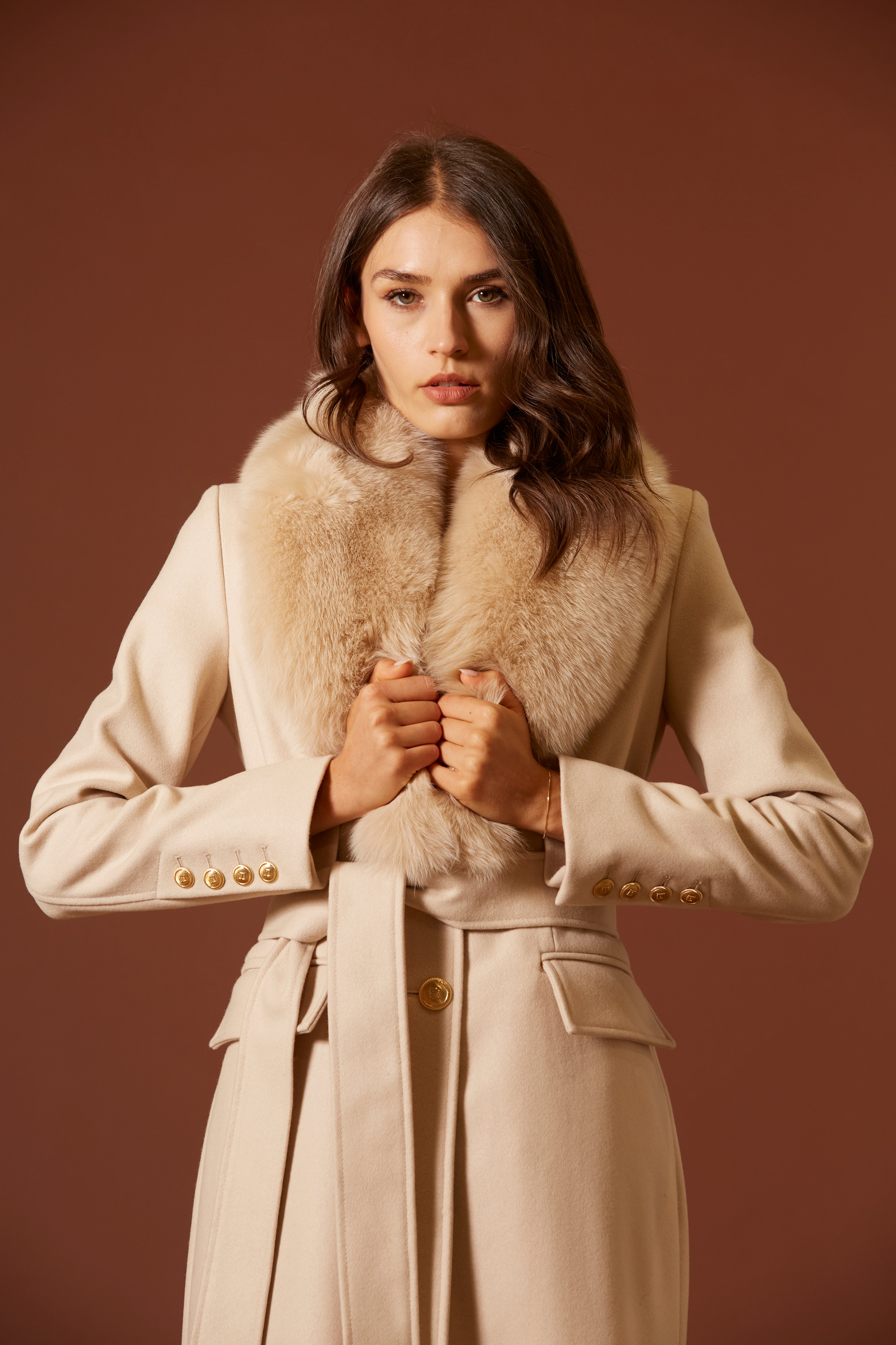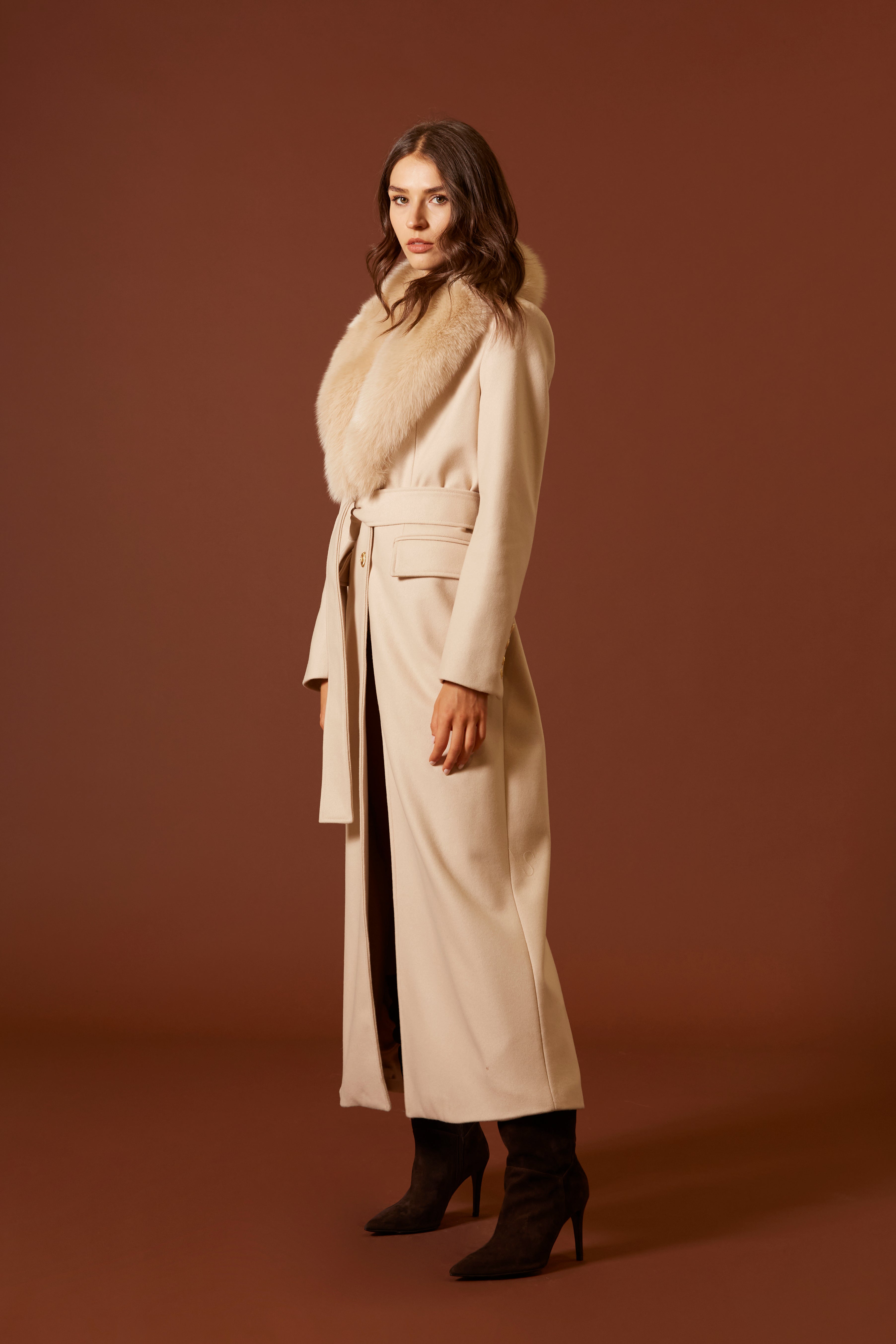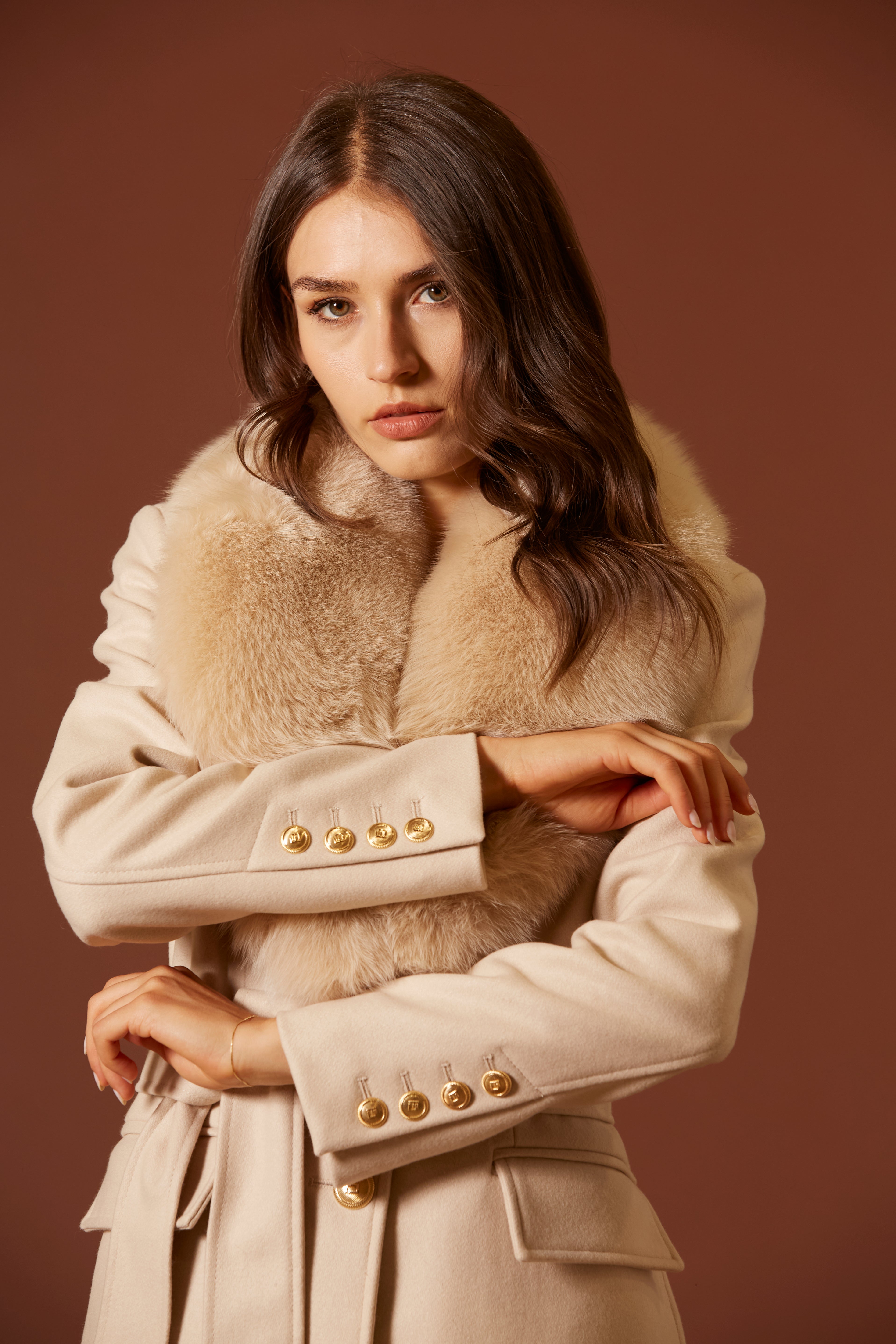 Ma ciò che rende questo cappotto davvero unico è il suo collo, un reverse di pelliccia che emerge come un capolavoro di morbidezza e raffinatezza. La pelliccia, come un bacio delicato, accarezza le spalle e il collo, offrendo una protezione che è al contempo calda e preziosa. È come se ogni fibra di pelliccia fosse stata cucita con l’intenzione di donare non solo calore, ma anche un tocco di lusso inconfondibile. La sua lucentezza sembra danzare con la luce, rendendo ogni movimento più elegante, ogni respiro più profondo.