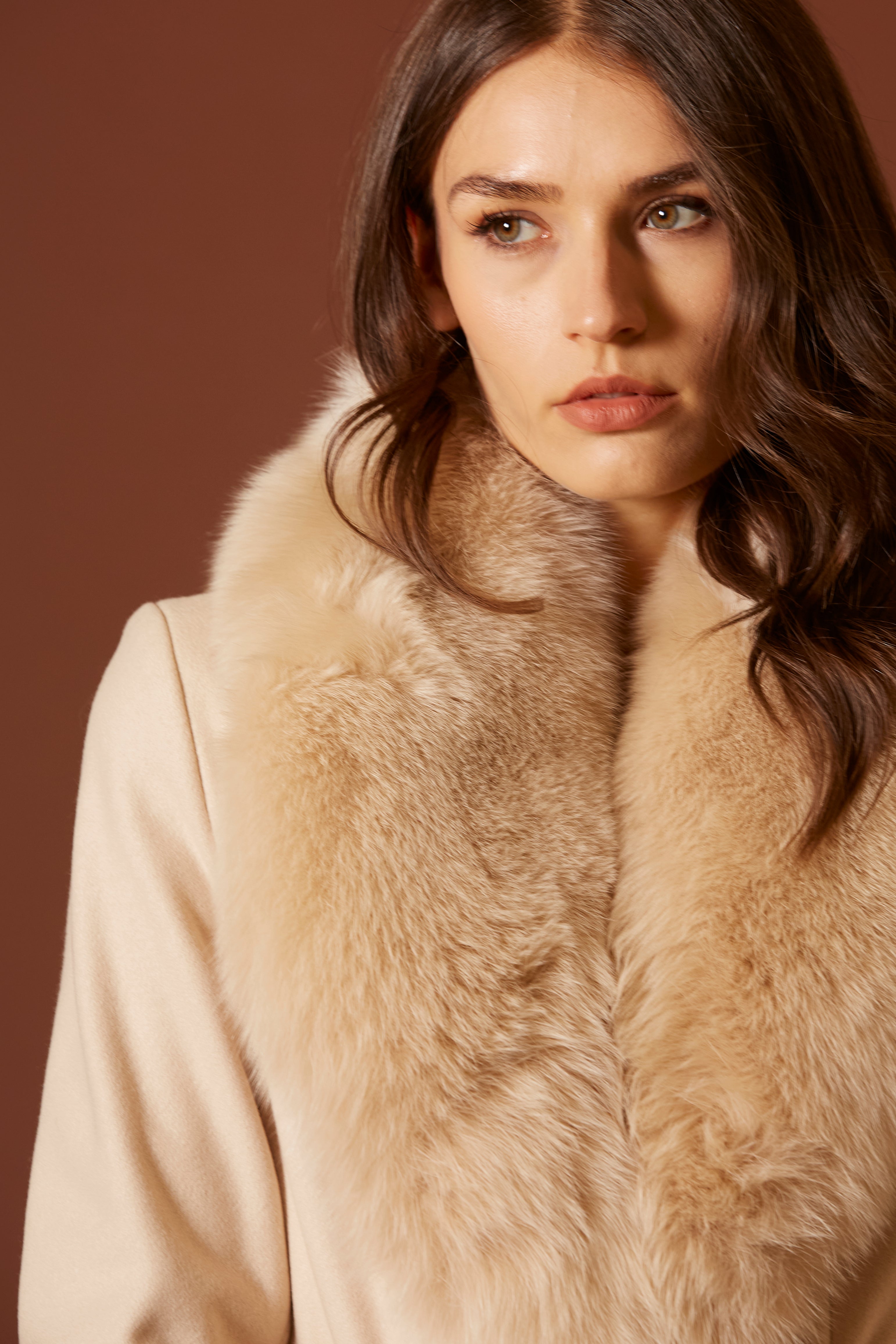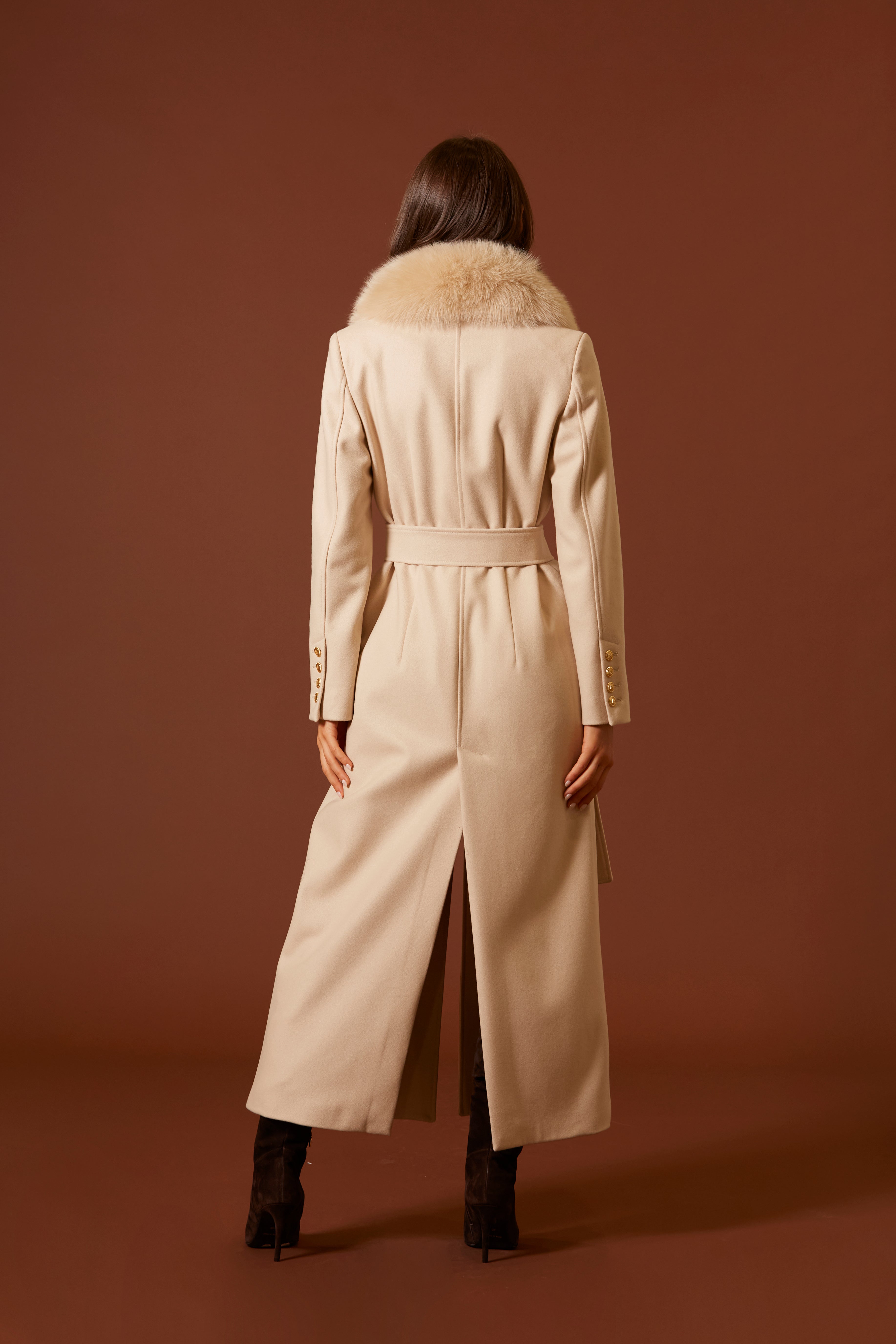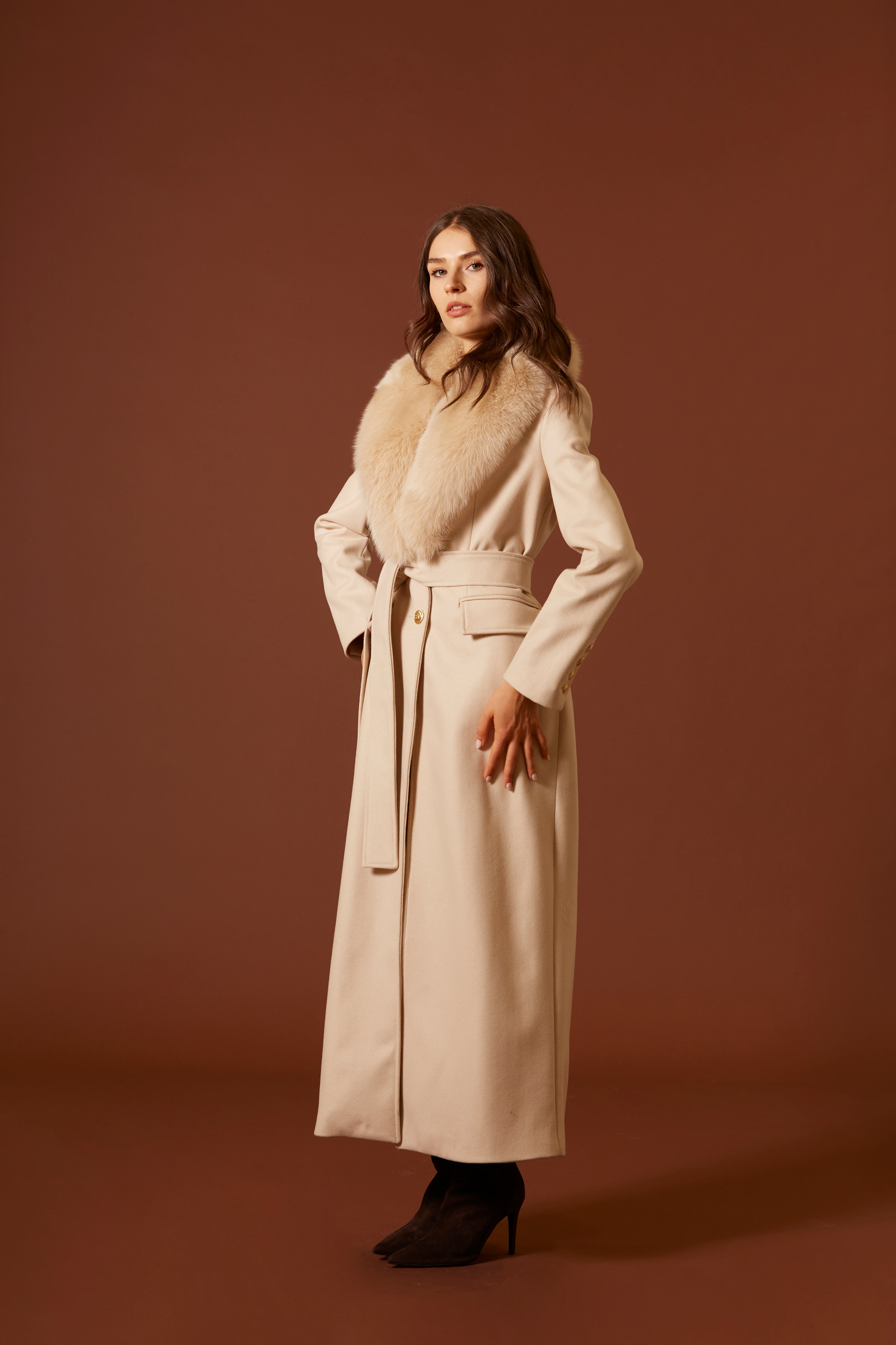 Ma ciò che rende questo cappotto davvero unico è il suo collo, un reverse di pelliccia che emerge come un capolavoro di morbidezza e raffinatezza. La pelliccia, come un bacio delicato, accarezza le spalle e il collo, offrendo una protezione che è al contempo calda e preziosa. È come se ogni fibra di pelliccia fosse stata cucita con l’intenzione di donare non solo calore, ma anche un tocco di lusso inconfondibile. La sua lucentezza sembra danzare con la luce, rendendo ogni movimento più elegante, ogni respiro più profondo.
