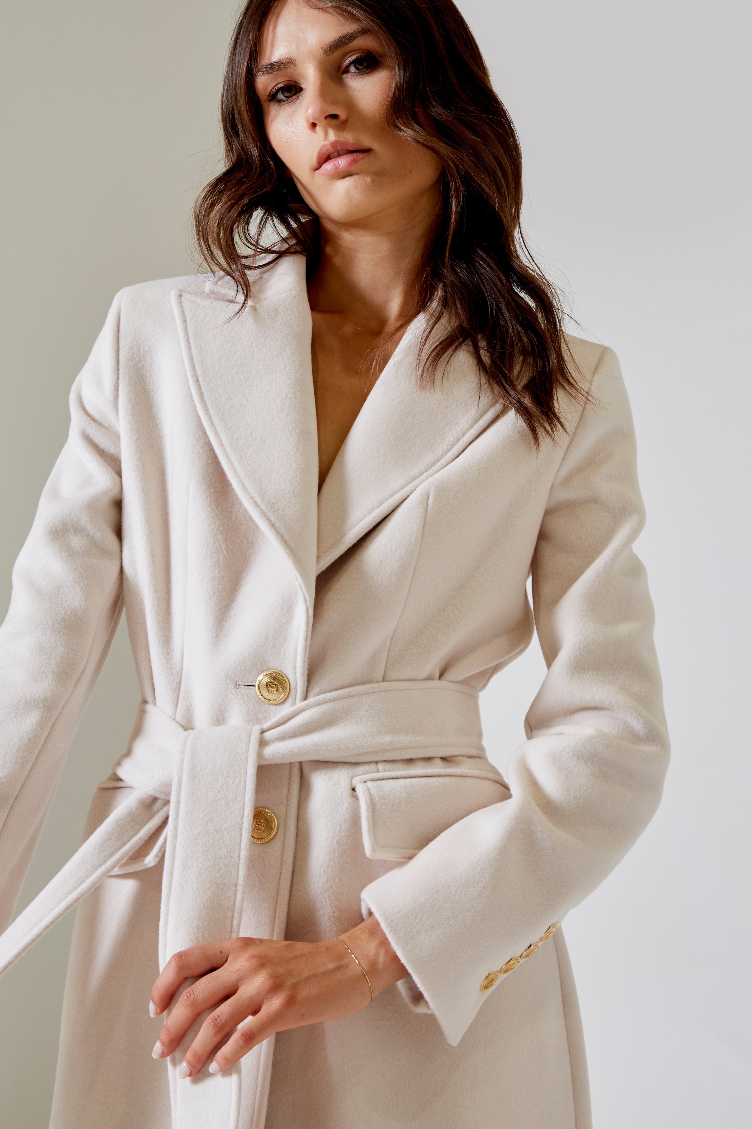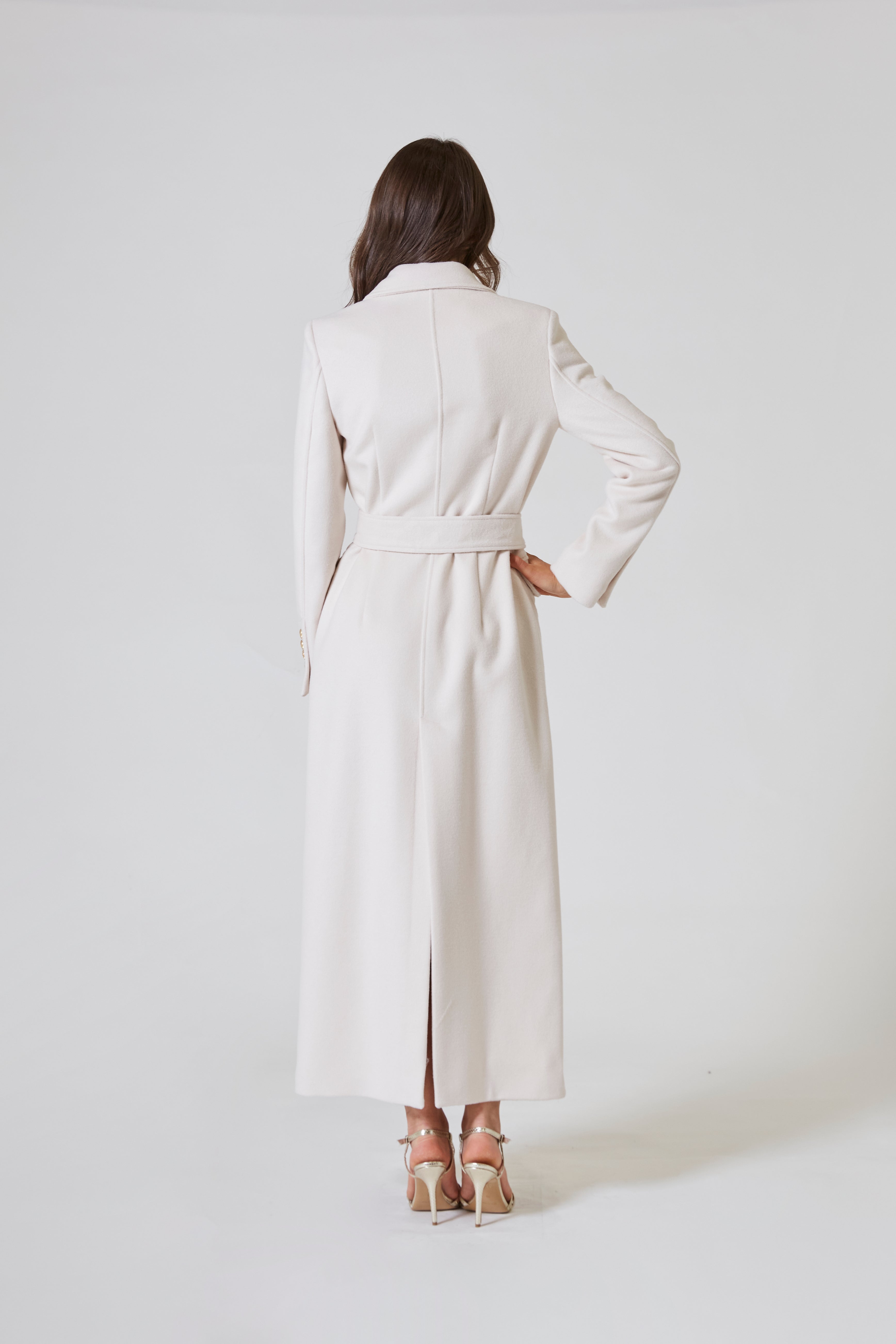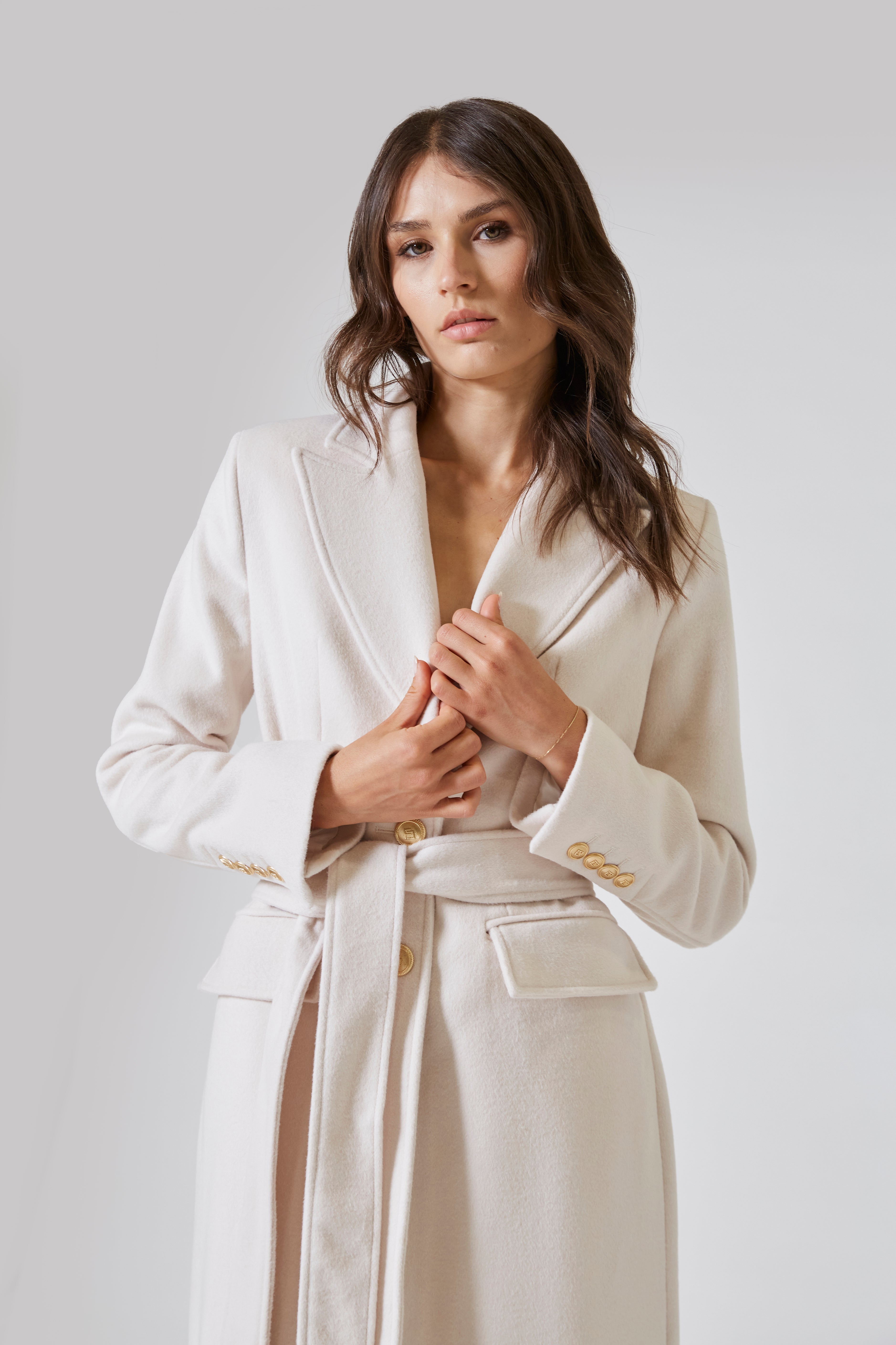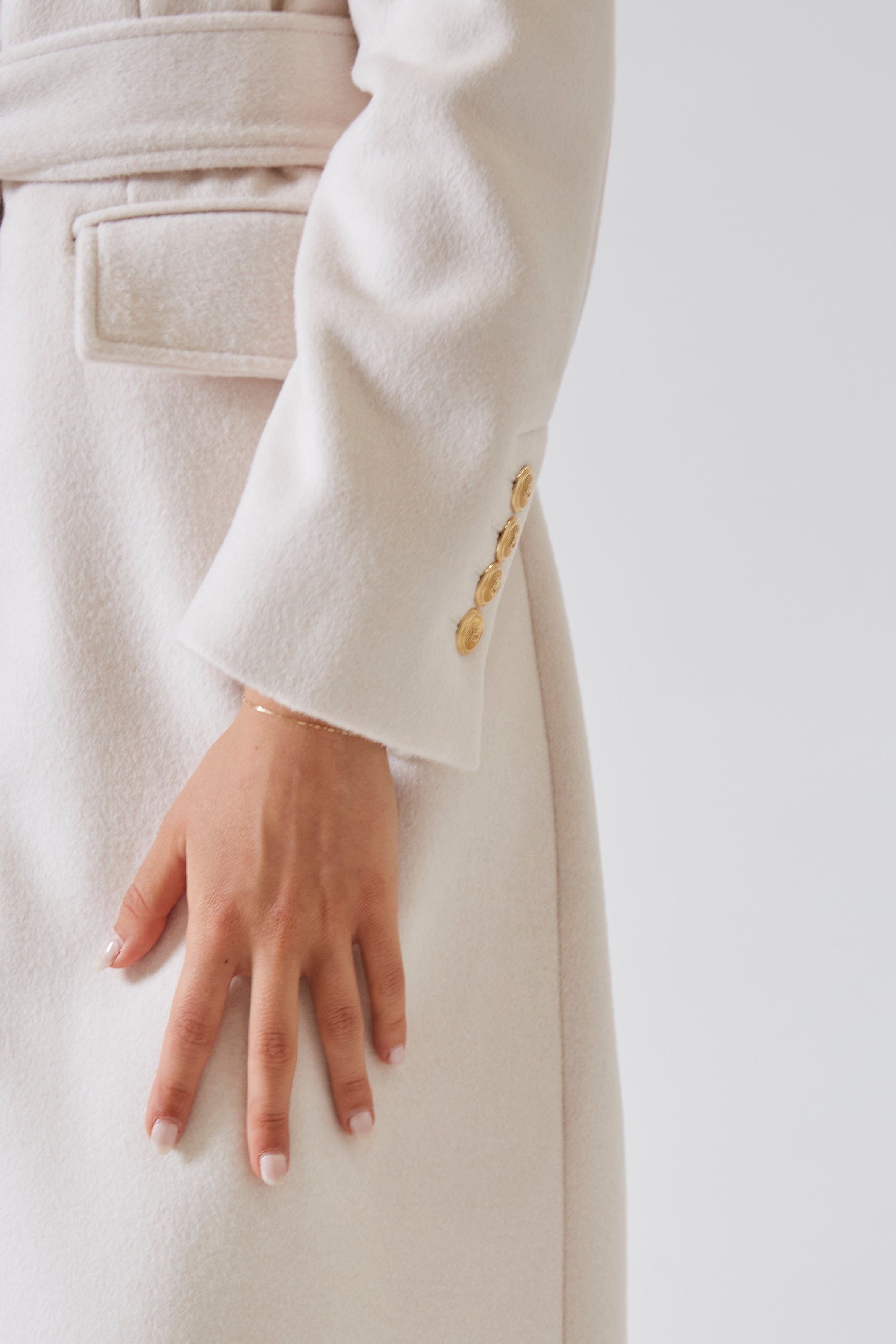 Avvolgersi in questo cappotto è un gesto lento, quasi rituale. Lo si poggia sulle spalle come si fa con una promessa, lasciando che il tessuto scivoli con la morbidezza di una carezza appena accennata. E in quell’abbraccio caldo e deciso, ogni dettaglio diventa un segreto svelato solo a chi sa osservare: il bagliore delicato dei bottoni oro che si confondono con la luce opaca dei pomeriggi di pioggia, il collo importante che sfiora il viso come una protezione antica, la linea pulita che segue i movimenti come se ne conoscesse da sempre i desideri.