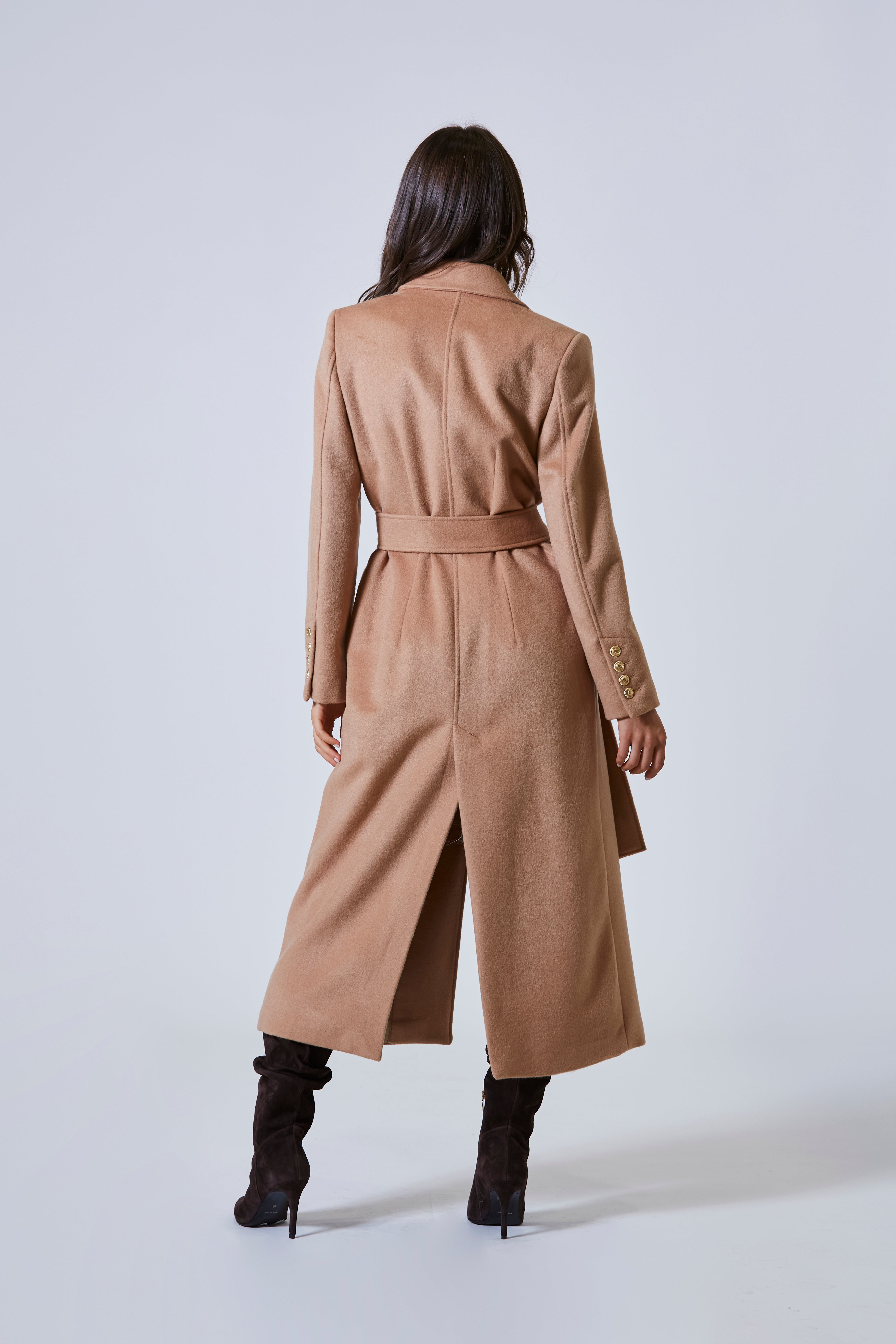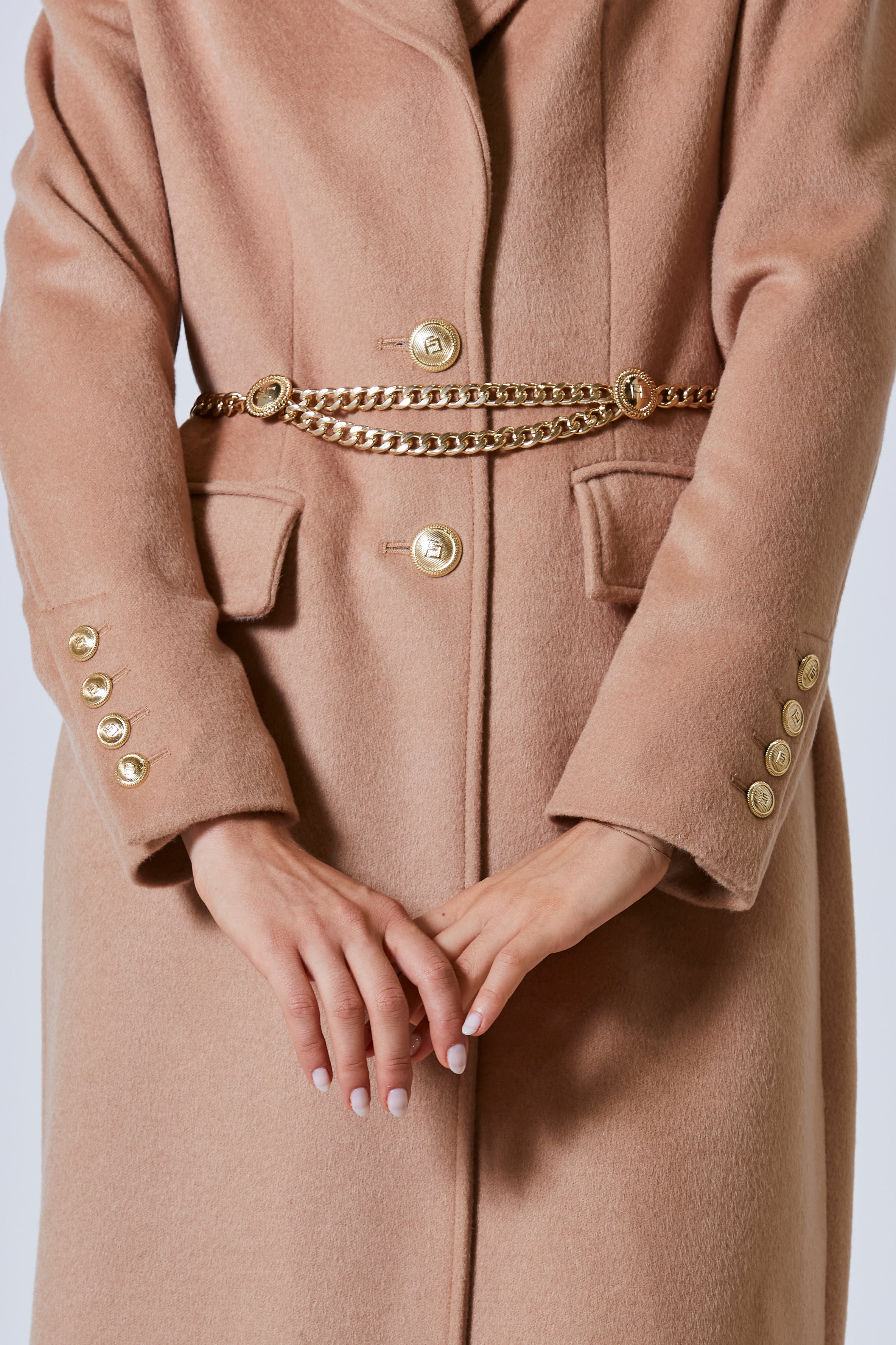Avvolgersi in questo cappotto è un gesto lento, quasi rituale. Lo si poggia sulle spalle come si fa con una promessa, lasciando che il tessuto scivoli con la morbidezza di una carezza appena accennata. E in quell’abbraccio caldo e deciso, ogni dettaglio diventa un segreto svelato solo a chi sa osservare: il bagliore delicato dei bottoni oro che si confondono con la luce opaca dei pomeriggi di pioggia, il collo importante che sfiora il viso come una protezione antica, la linea pulita che segue i movimenti come se ne conoscesse da sempre i desideri.