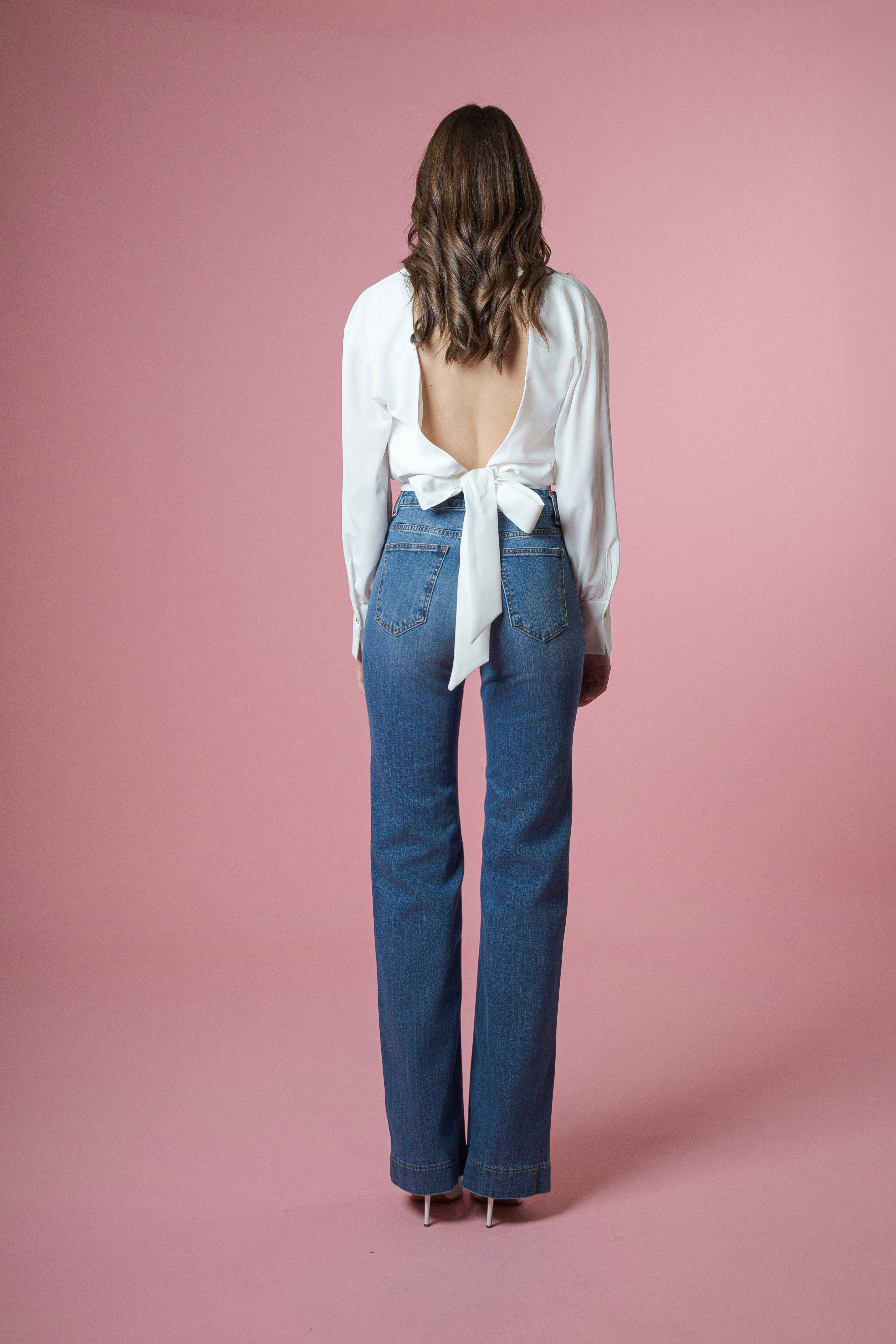 Il collo camicia conferisce al capo struttura e raffinatezza, mentre il design incrociato sia sul davanti che sul retro aggiunge movimento e originalità, trasformando una silhouette tradizionale in un gioco di volumi elegante e dinamico. Il fiocco, posto strategicamente, diventa protagonista: morbido e scenografico, dona un tocco romantico e couture, incorniciando la figura con leggerezza e armonia.