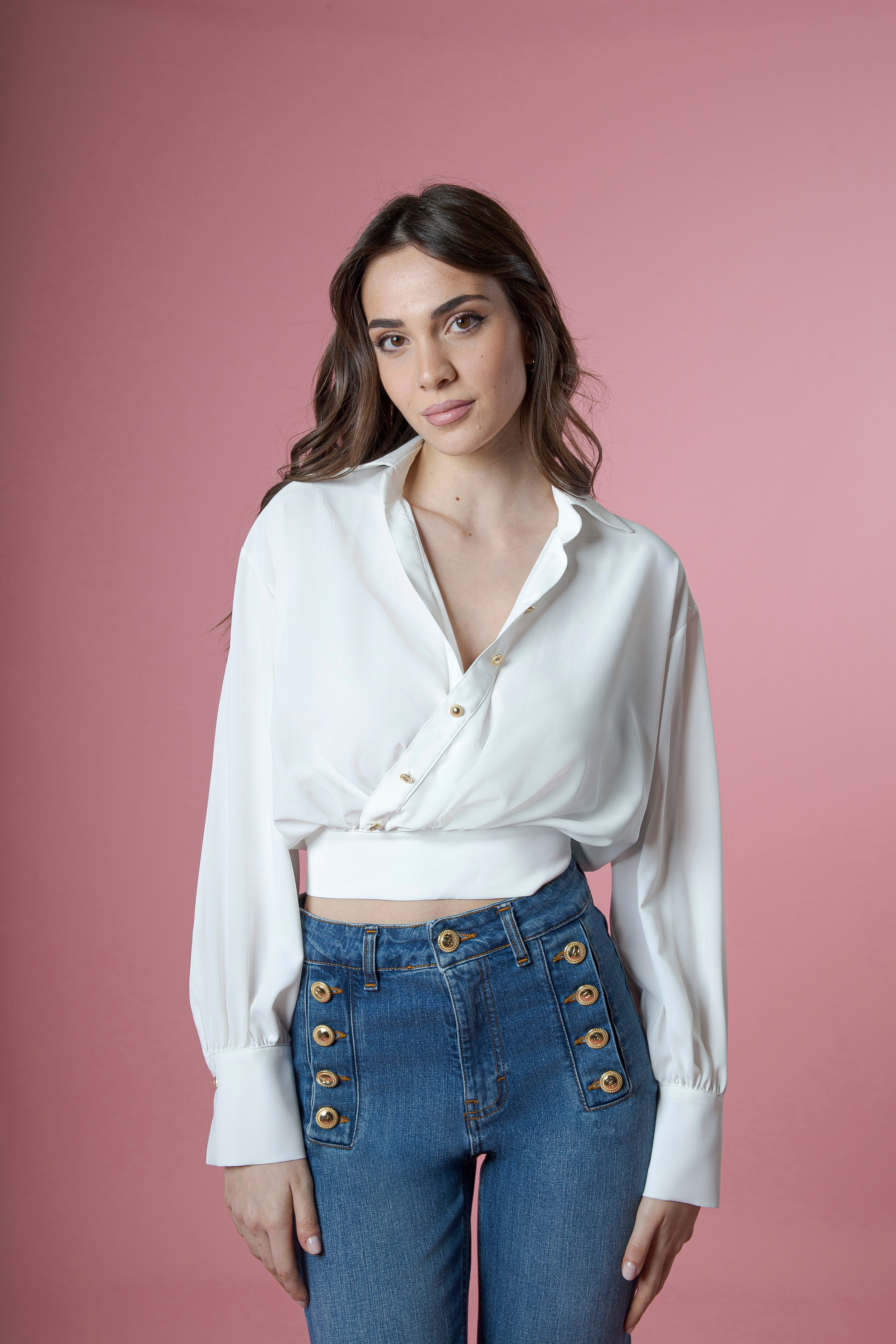 Delicata e sofisticata, la casacca con collo camicia firmata FC Flavio Castellani è un capolavoro di femminilità contemporanea, capace di unire linee classiche e dettagli preziosi in un equilibrio perfetto.