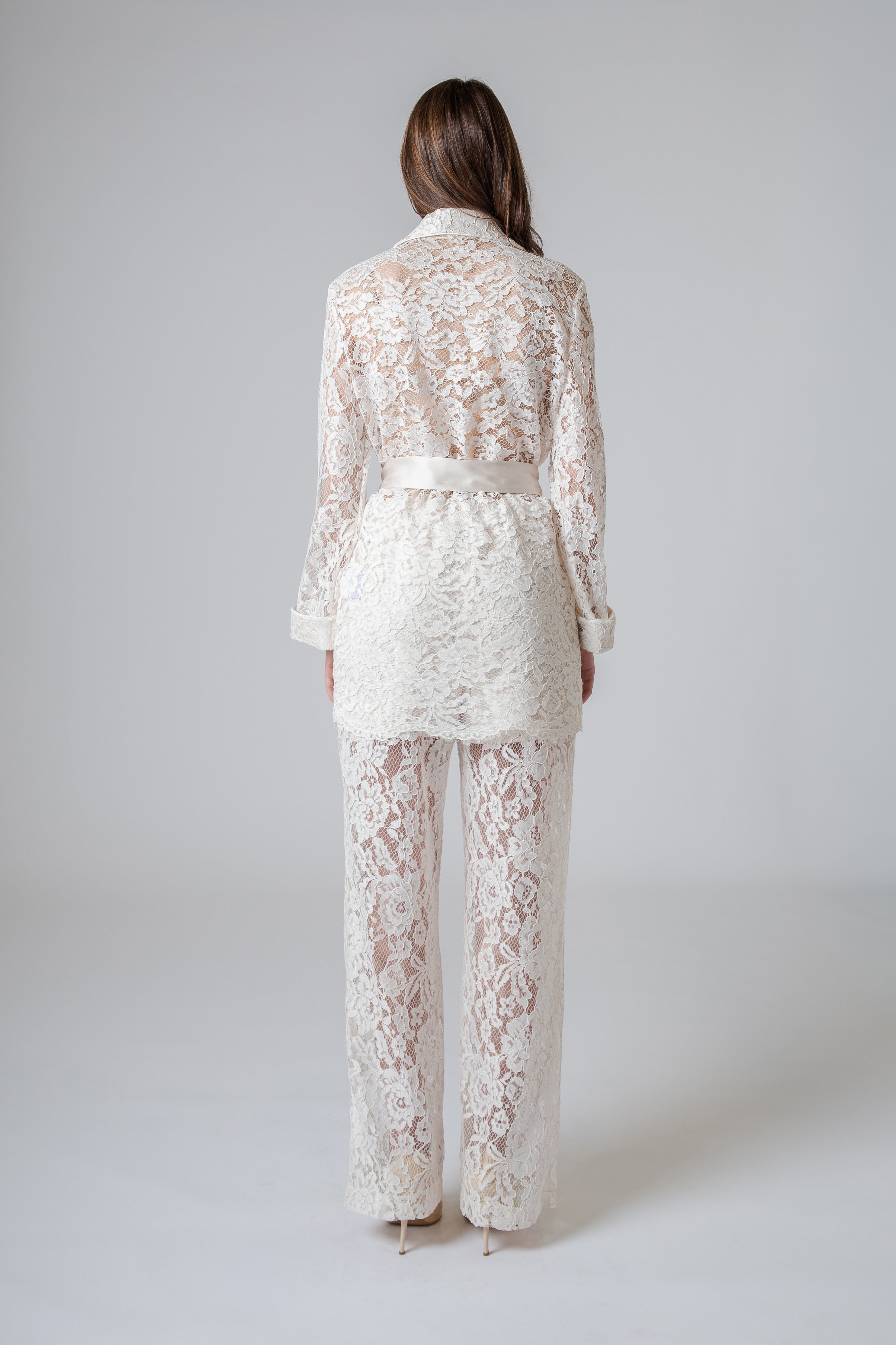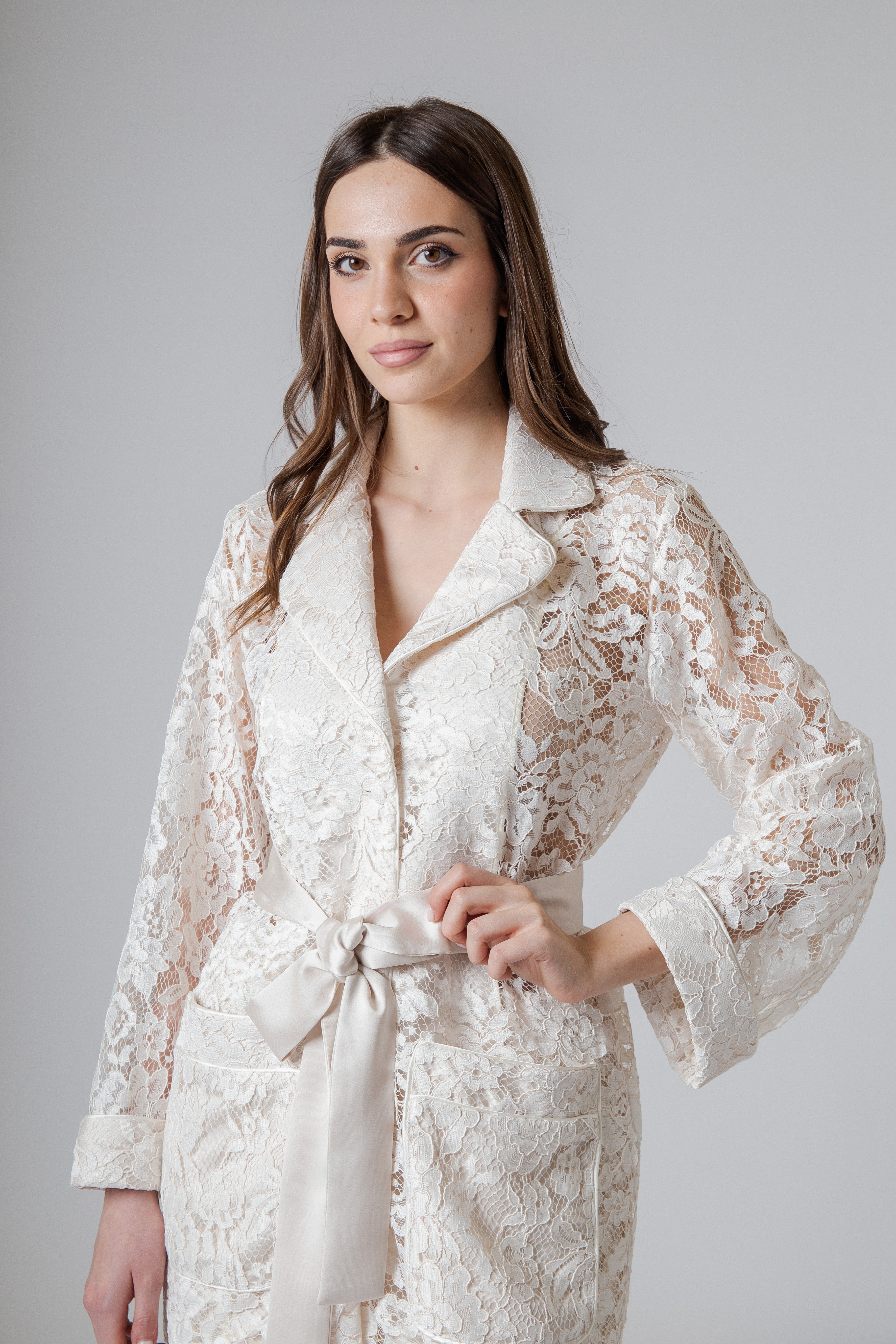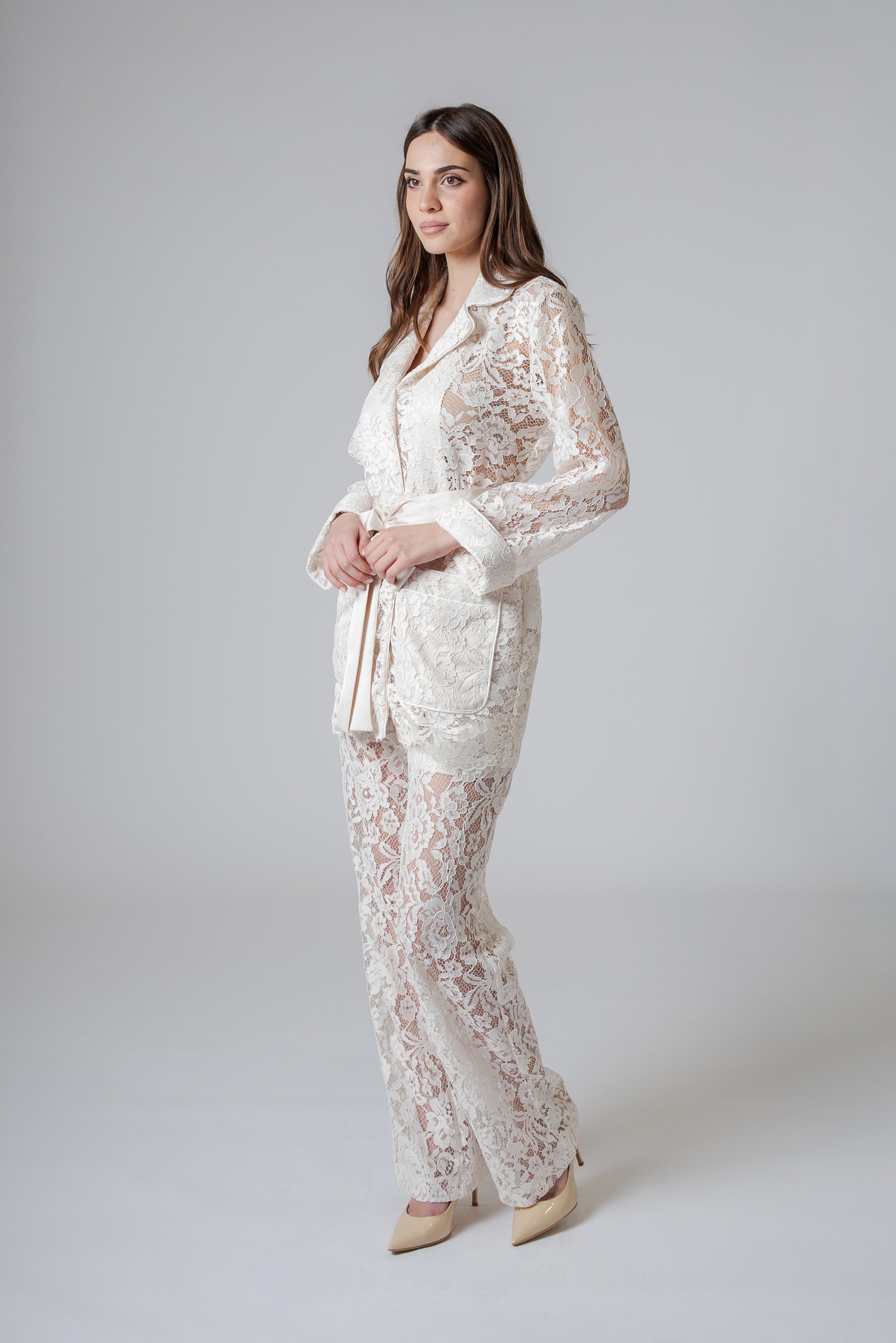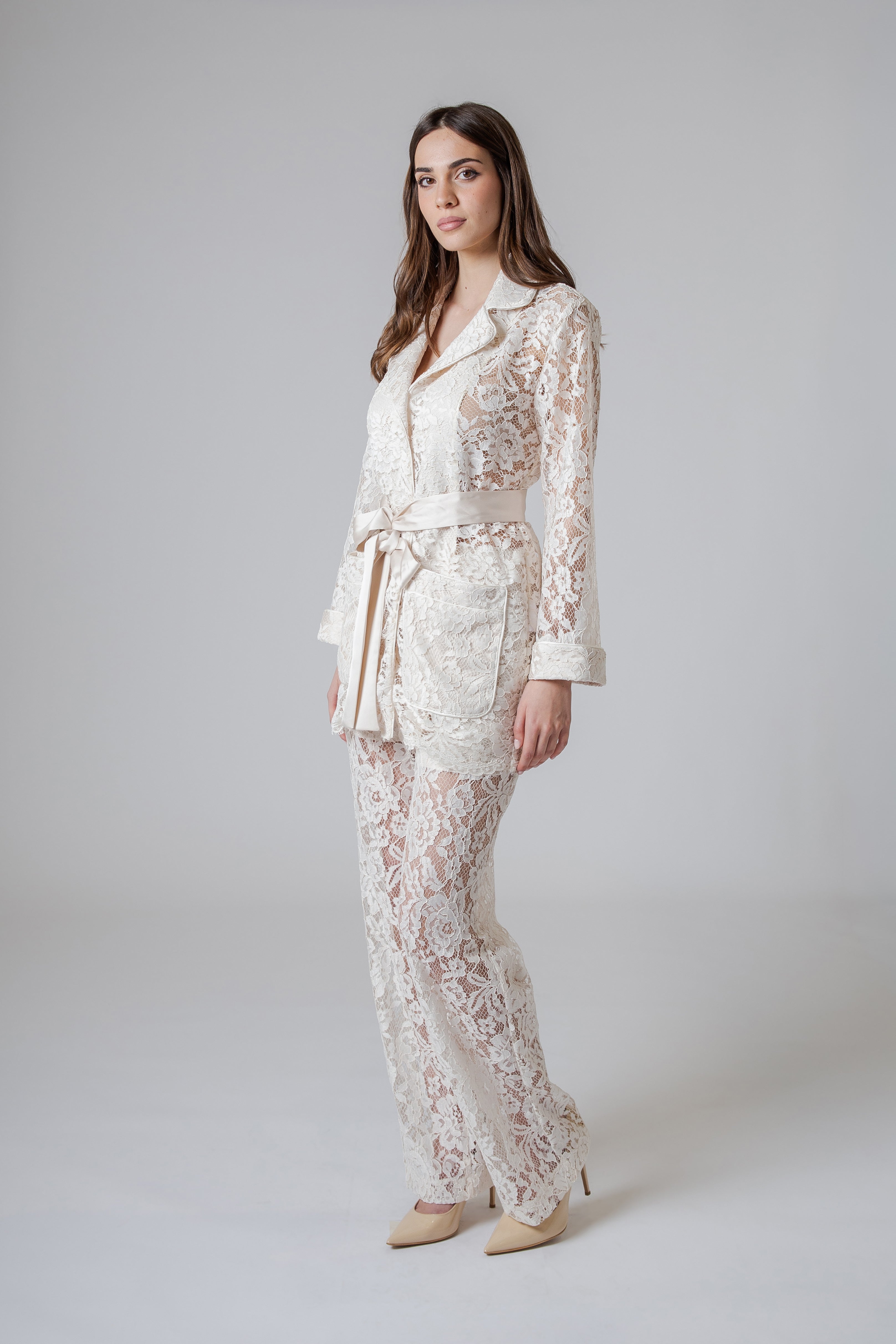 Il risultato è una casacca-giacca in pizzo dal fascino sofisticato e contemporaneo, dove la delicatezza del tessuto ricamato incontra la fluidità della linea over e la luminosità della fusciacca in raso. Un capo elegante e versatile, capace di trasformare anche il look più semplice in un insieme raffinato e ricco di personalità.