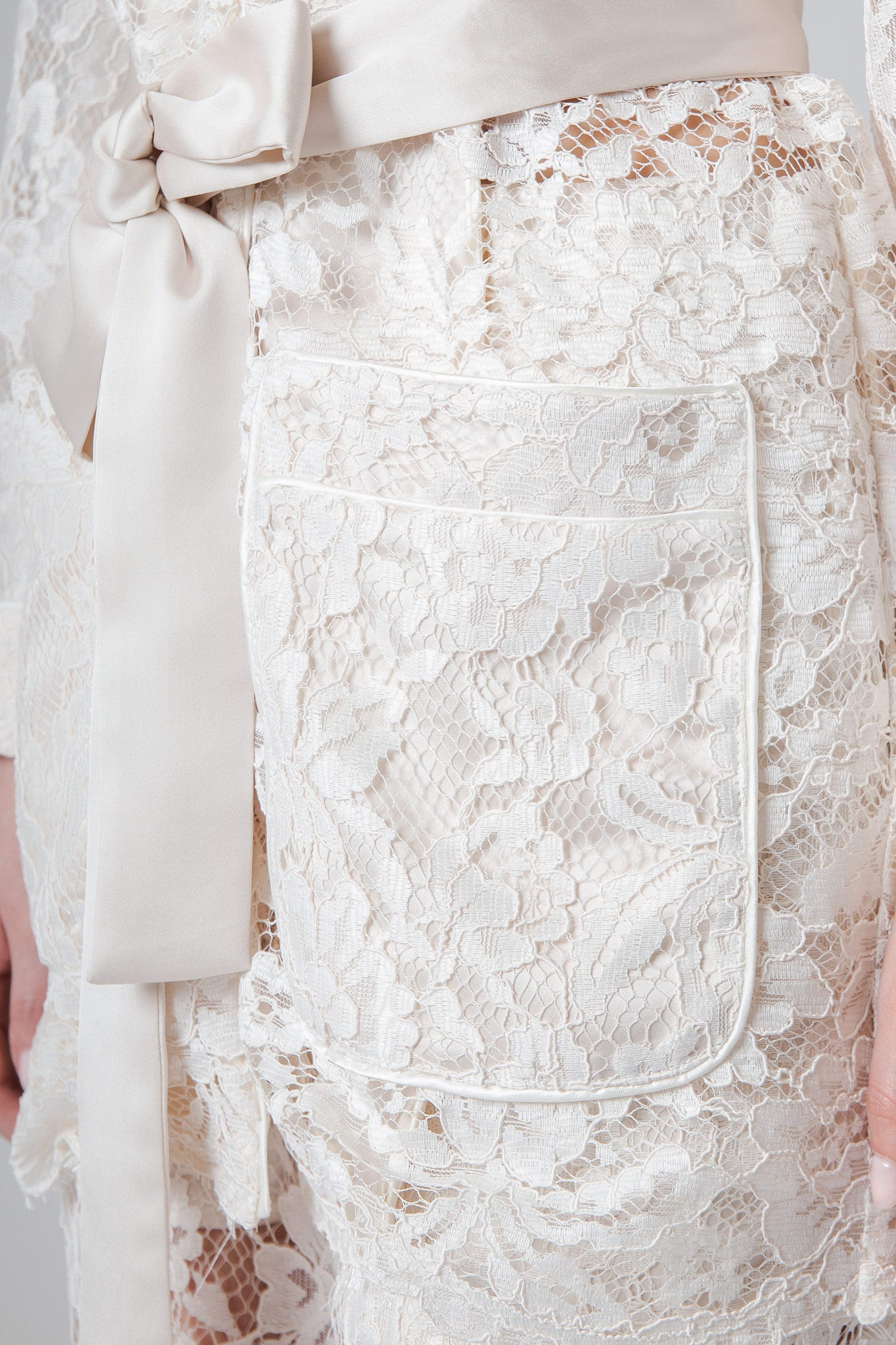 A valorizzare la figura interviene la fusciacca in raso in vita, un dettaglio raffinato che crea un contrasto armonioso con la texture del pizzo. Il raso, liscio e luminoso, avvolge il punto vita con delicatezza e permette di modulare la silhouette: annodato morbido o leggermente stretto, definisce la figura mantenendo l’equilibrio tra struttura e leggerezza.