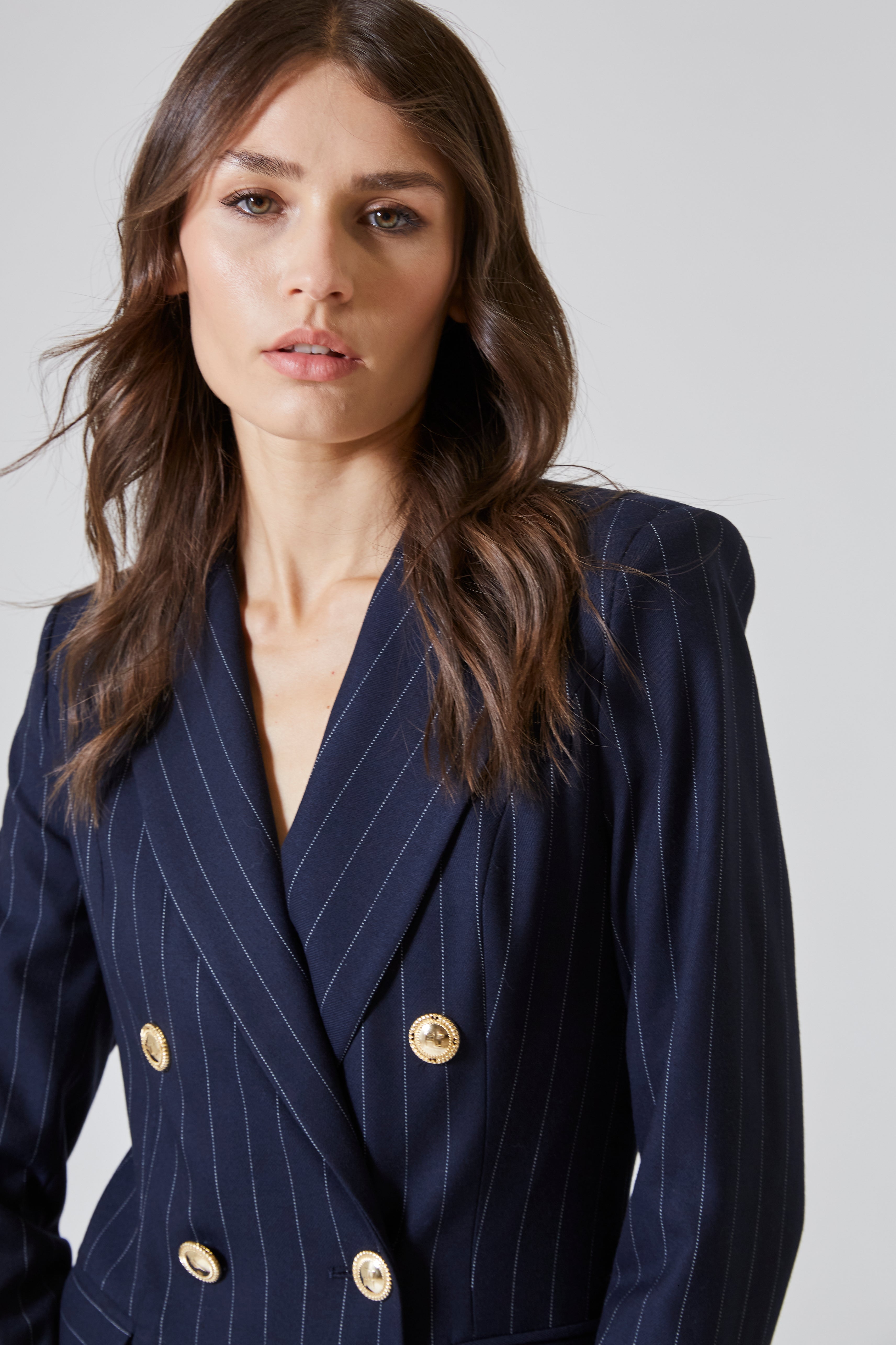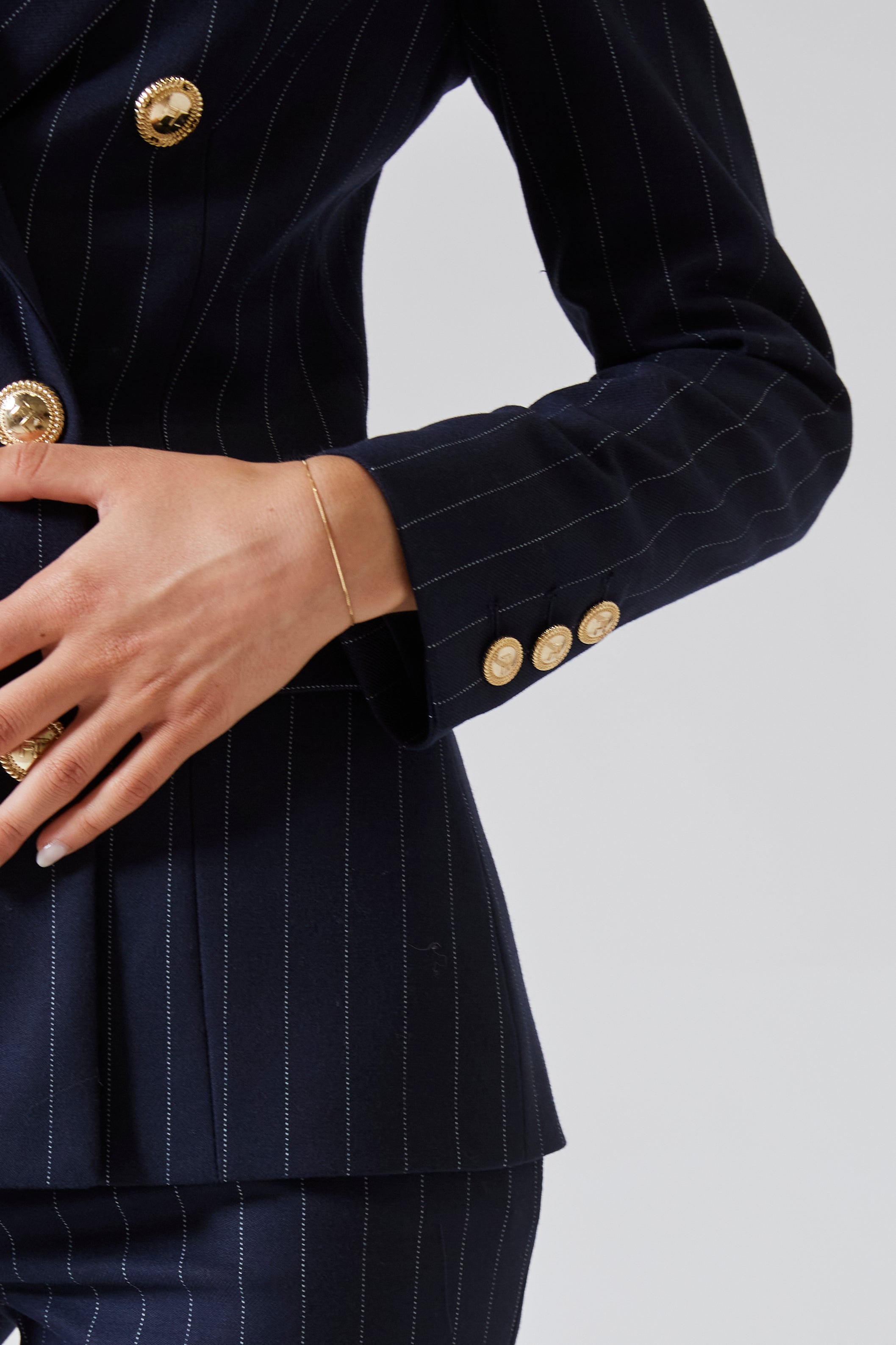 Il taglio doppiopetto non è un vezzo, ma una scelta decisa: scolpisce la figura come lo scalpello di Michelangelo sulla pietra, dando vita a una silhouette audace, elegante, indimenticabile. Le spalle sono strutturate, decise ma mai eccessive, quasi a raccontare la forza nascosta dietro la raffinatezza. E lì, sul petto, a interrompere la continuità delle righe come punte di luce in un cielo scuro, brillano sei bottoni dorati, lucidi e imponenti, piccoli soli che accendono la giacca di una regalità discreta ma innegabile.