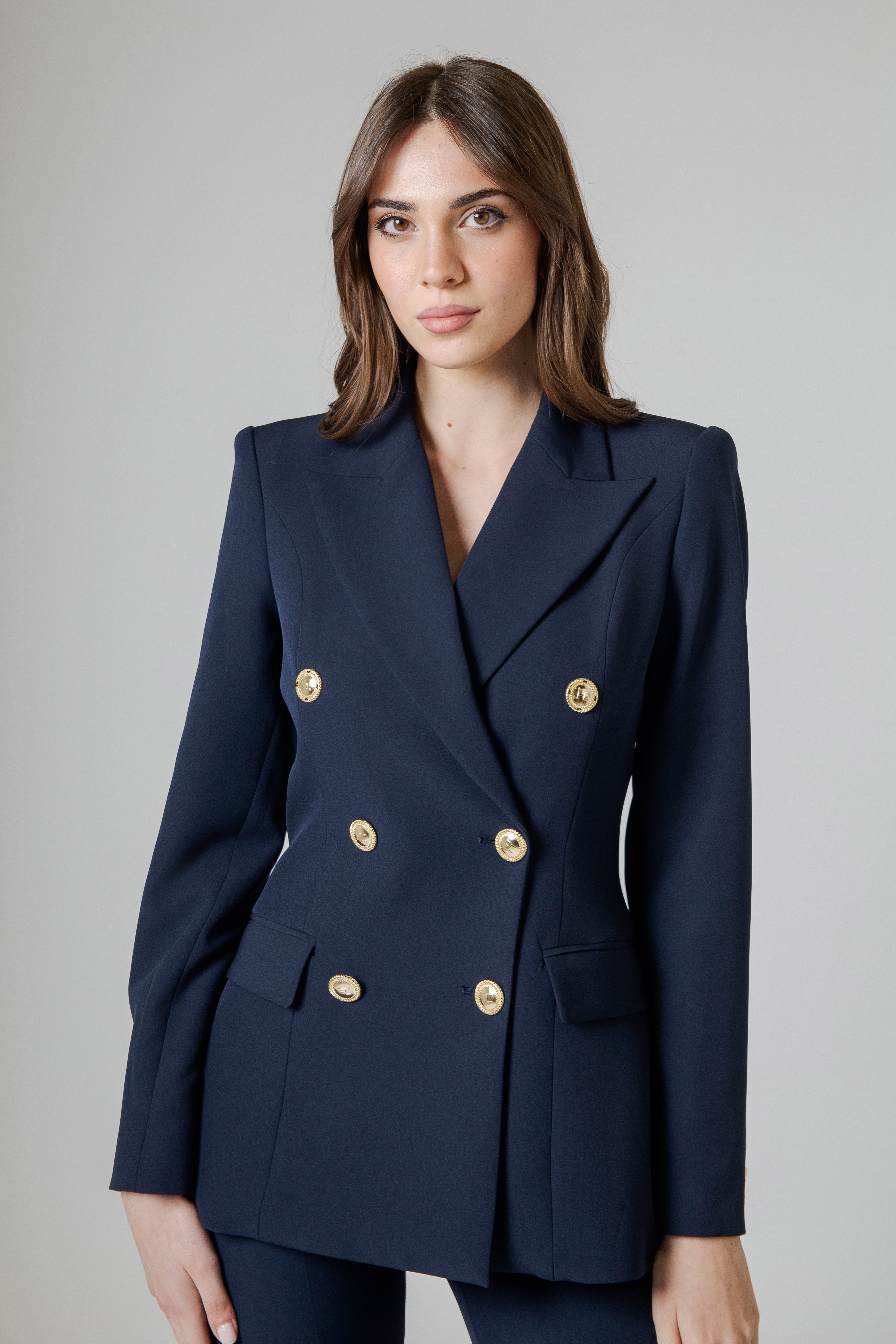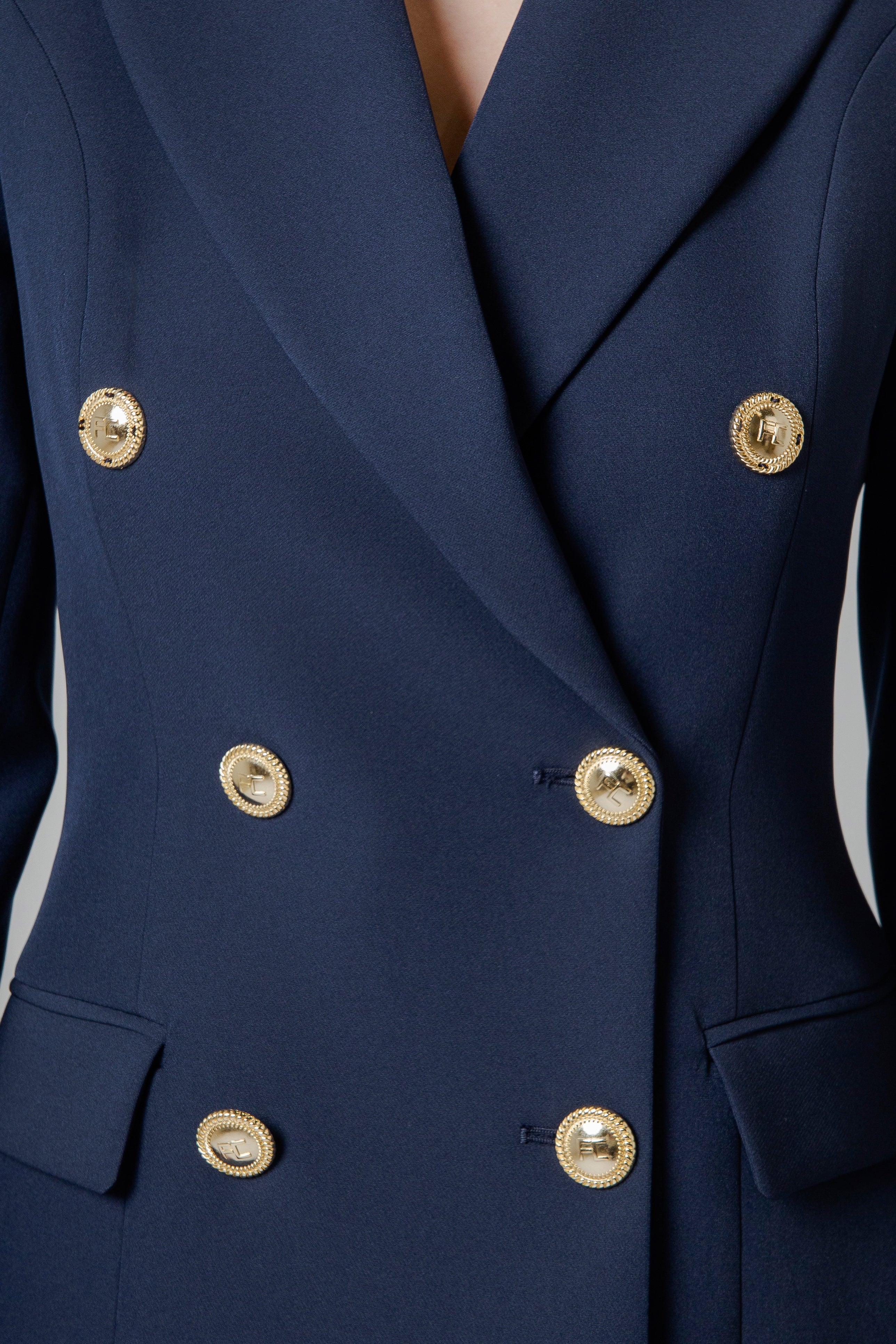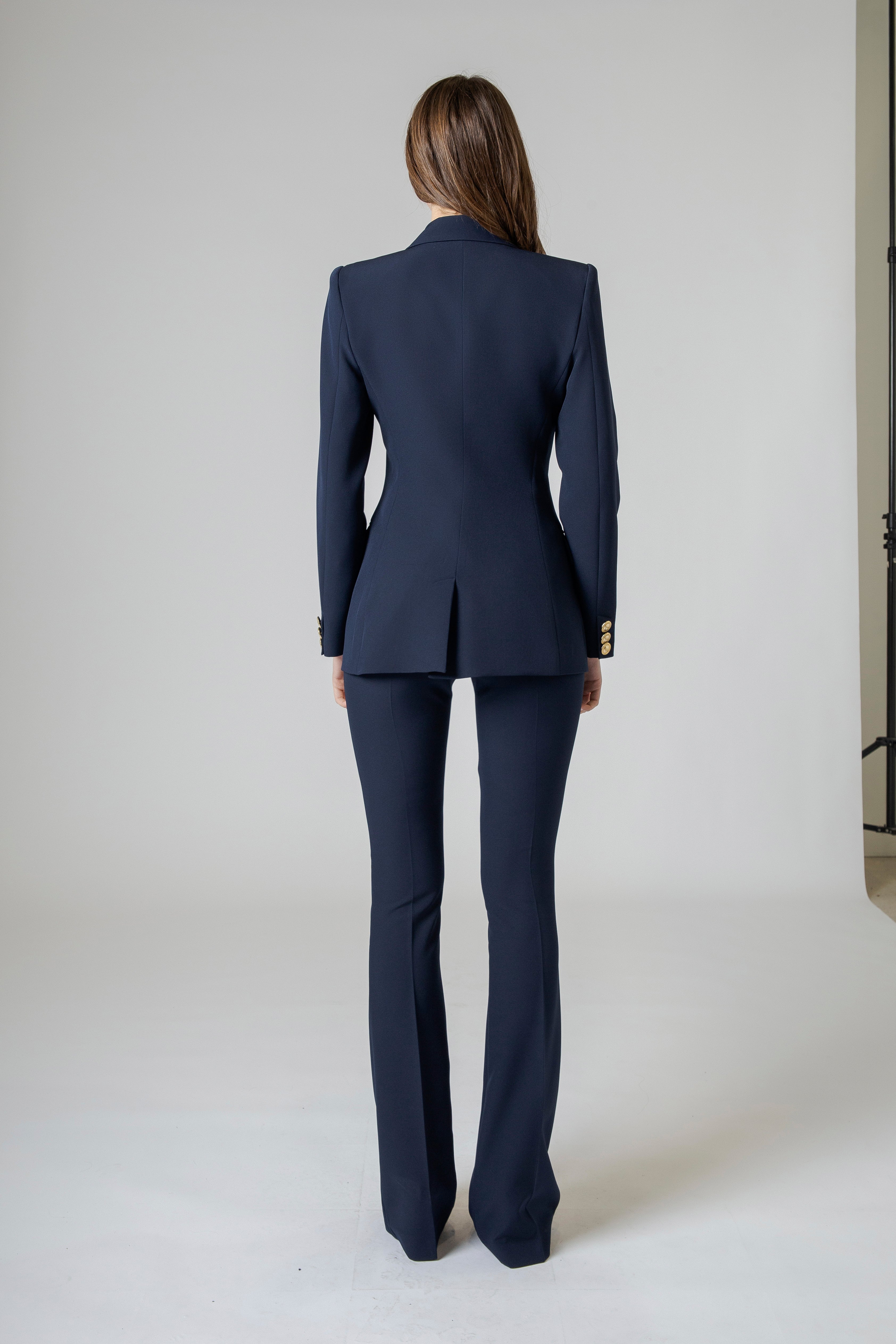 La struttura doppiopetto disegna una linea autorevole. I due lembi frontali si sovrappongono con eleganza, creando quella silhouette classica che evoca i grandi atelier italiani e le passeggiate lente tra portici e piazze antiche. Il taglio è studiato per valorizzare la figura: le spalle sono nette ma naturali, la vita leggermente sagomata, il petto definito senza rigidità.
